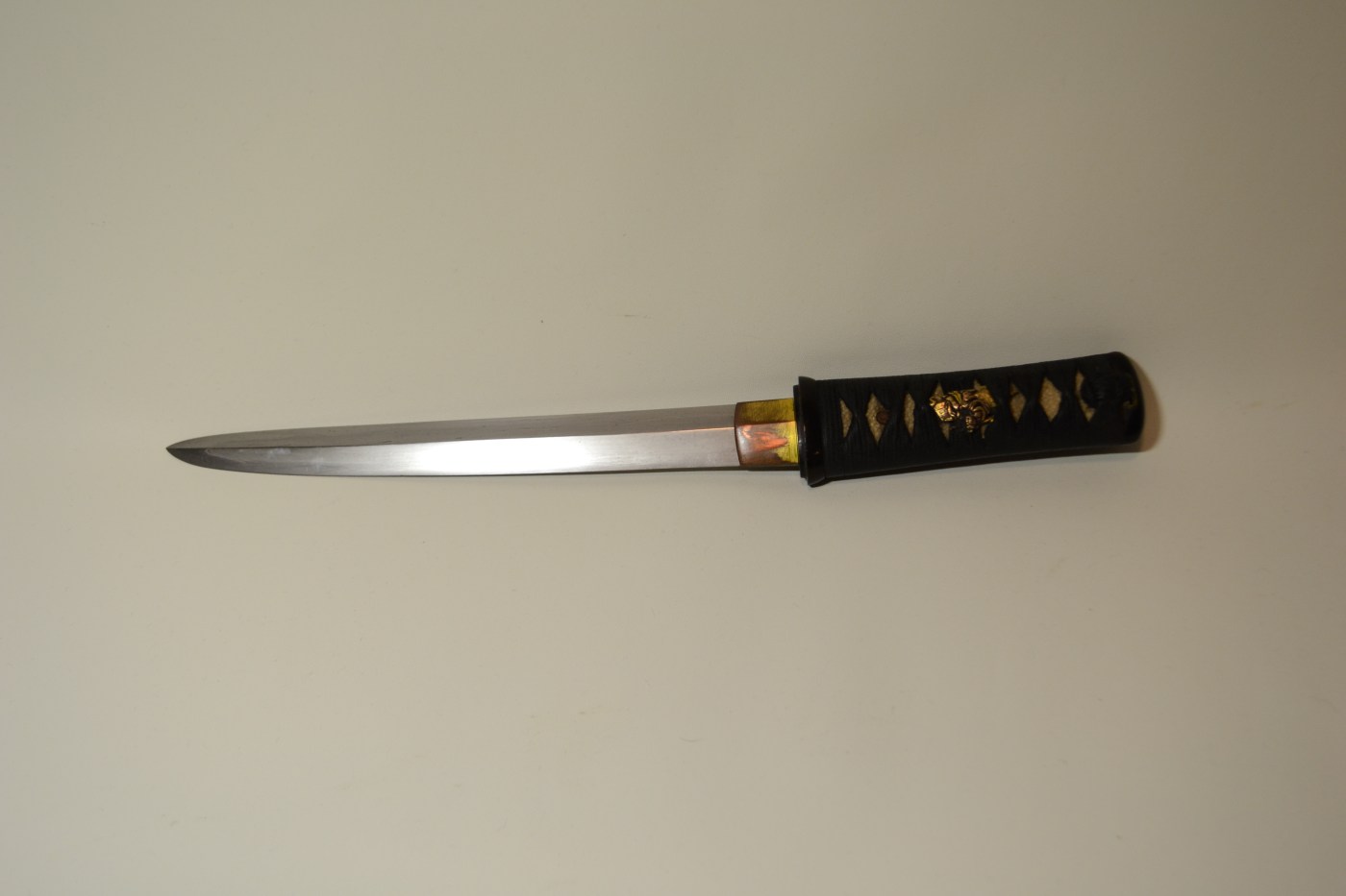 The blade is unsigned, and is in very good polish, with a very visible grain and hamon. This blade is Moroha Zukuri and thus is double edged. Moroha Zukuri pieces are a fairly rare find, and a great addition to any collection. I was quite hesitant to sell this one, but I decided to keep another piece instead.