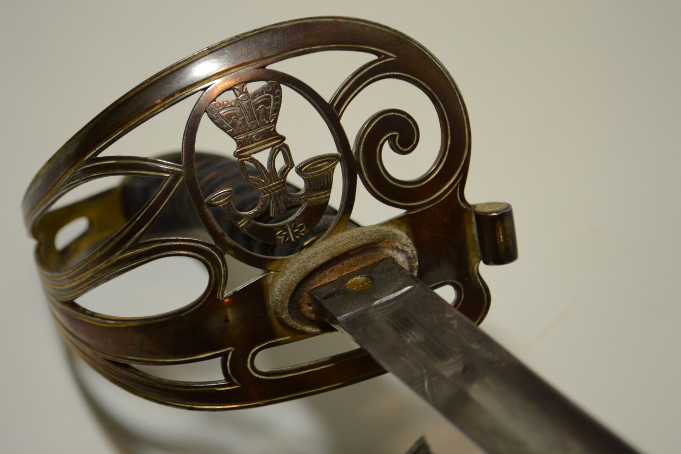 For sale this unusual example of a Rifles Officer sabre of the 1845 pattern (with Wilkinson designed blade). The blade is in pristine shape, with no corrosion. The blade is unmarked, except for the usual etchings of a Victorian Rifle Regiment.
