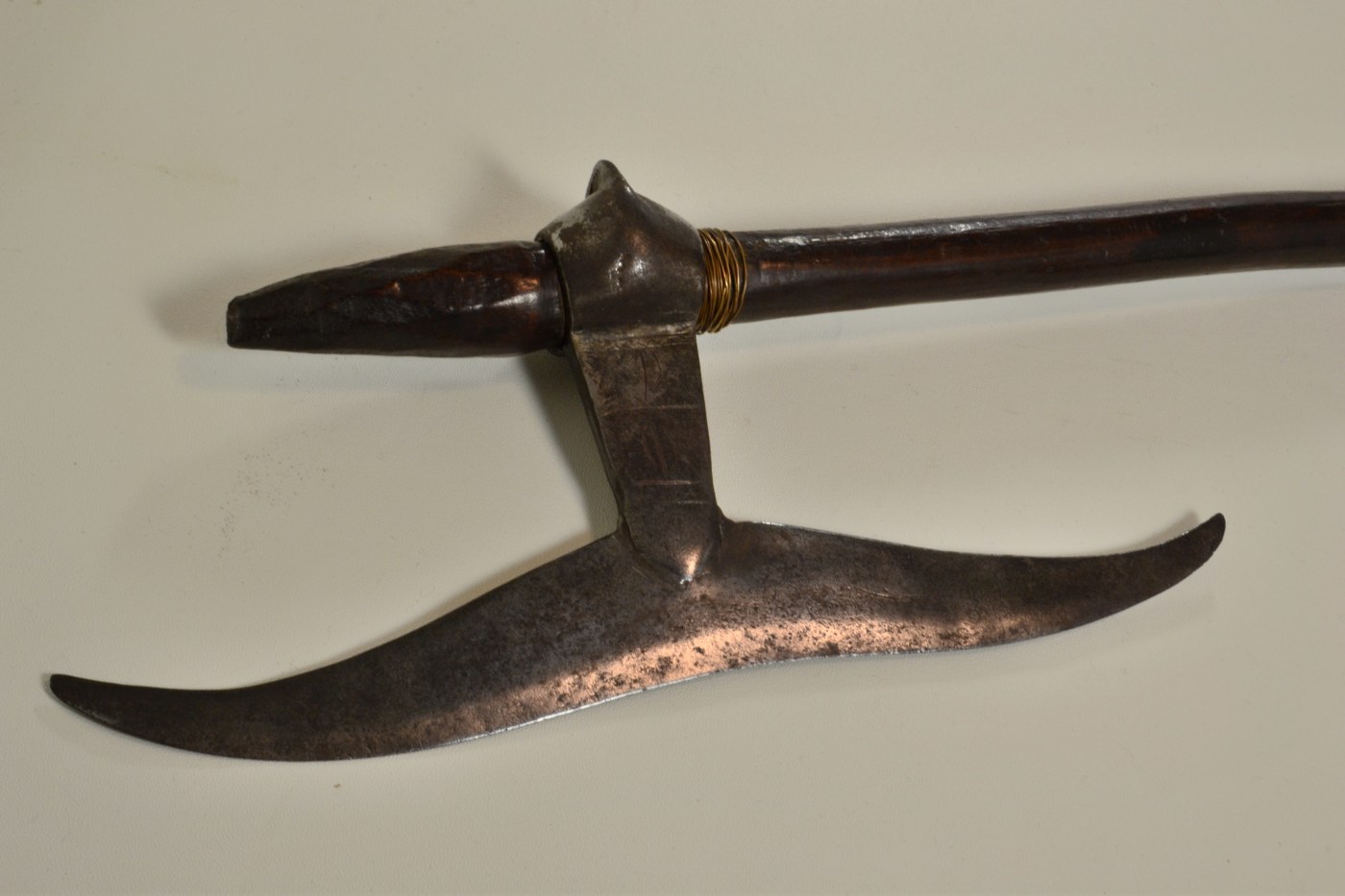 The bulova is a typical form of Indian battle axe which was used for several centuries. This example is of a very rudimentary design but surprisingly lightweight, with a very simple blade which retains some edge and a roughly shaped wooden shaft. It dates possibly from the 19th century. The brass wire is probably not original, but holds the blade solidly. Battle axes are a scarce find, and this one comes at a very affordable price.