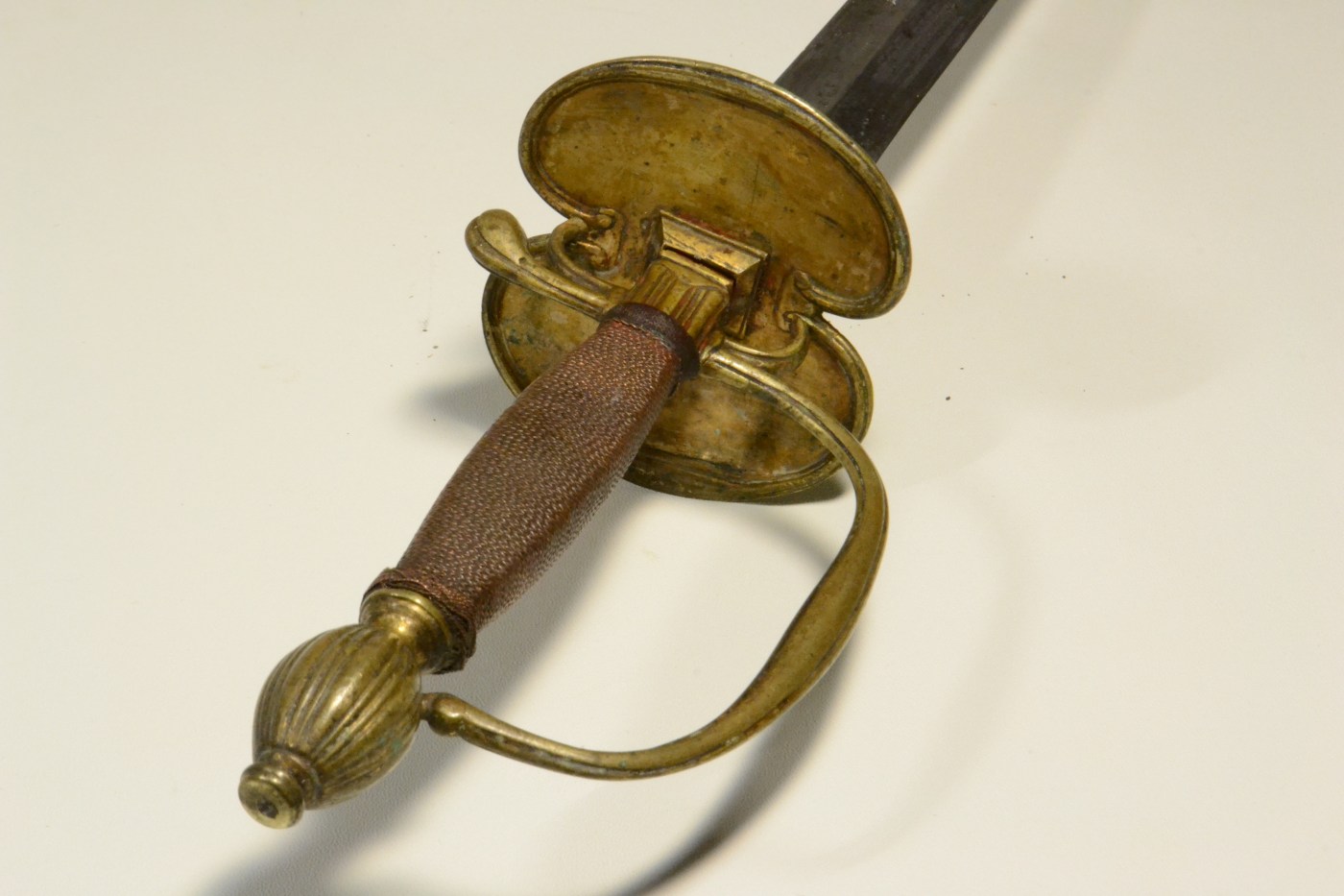 The blade is in excellent condition and so are the fittings. At some point someone inserted some brass wire and cord at the base of the blade, probably to tighten the fit of the guard. One of the turk’s head ferule is missing, but it could be replaced.