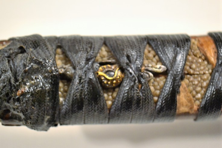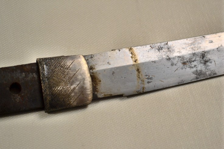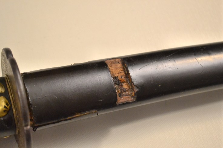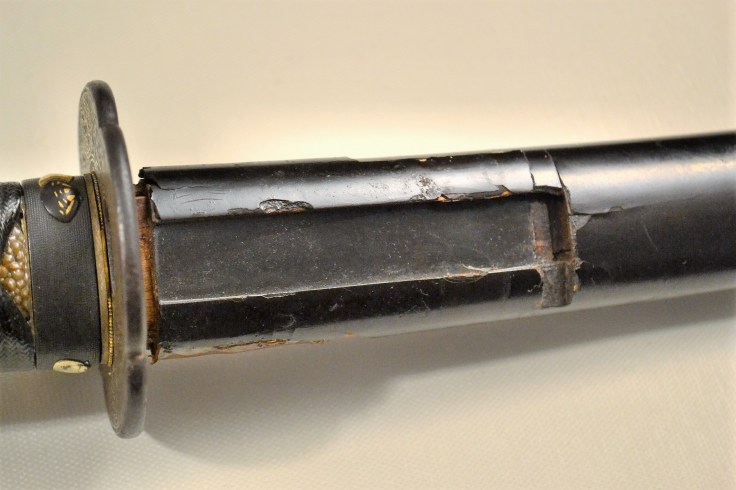 This wakizashi is in need of some love. The scabbard is split and missing its fittings, the ito was varnished by a previous owner and is now brittle, the blade has a few nicks and oxidation.