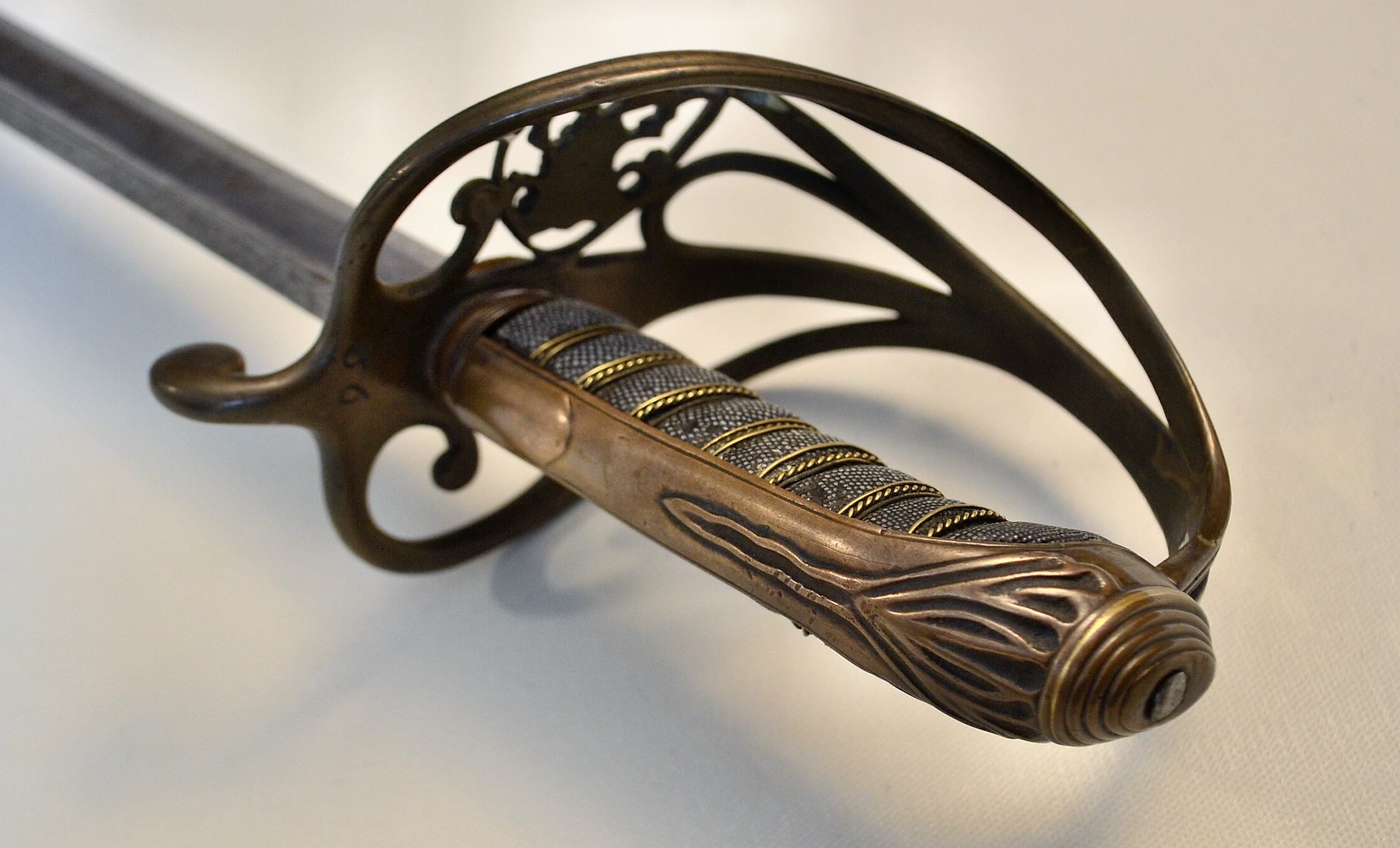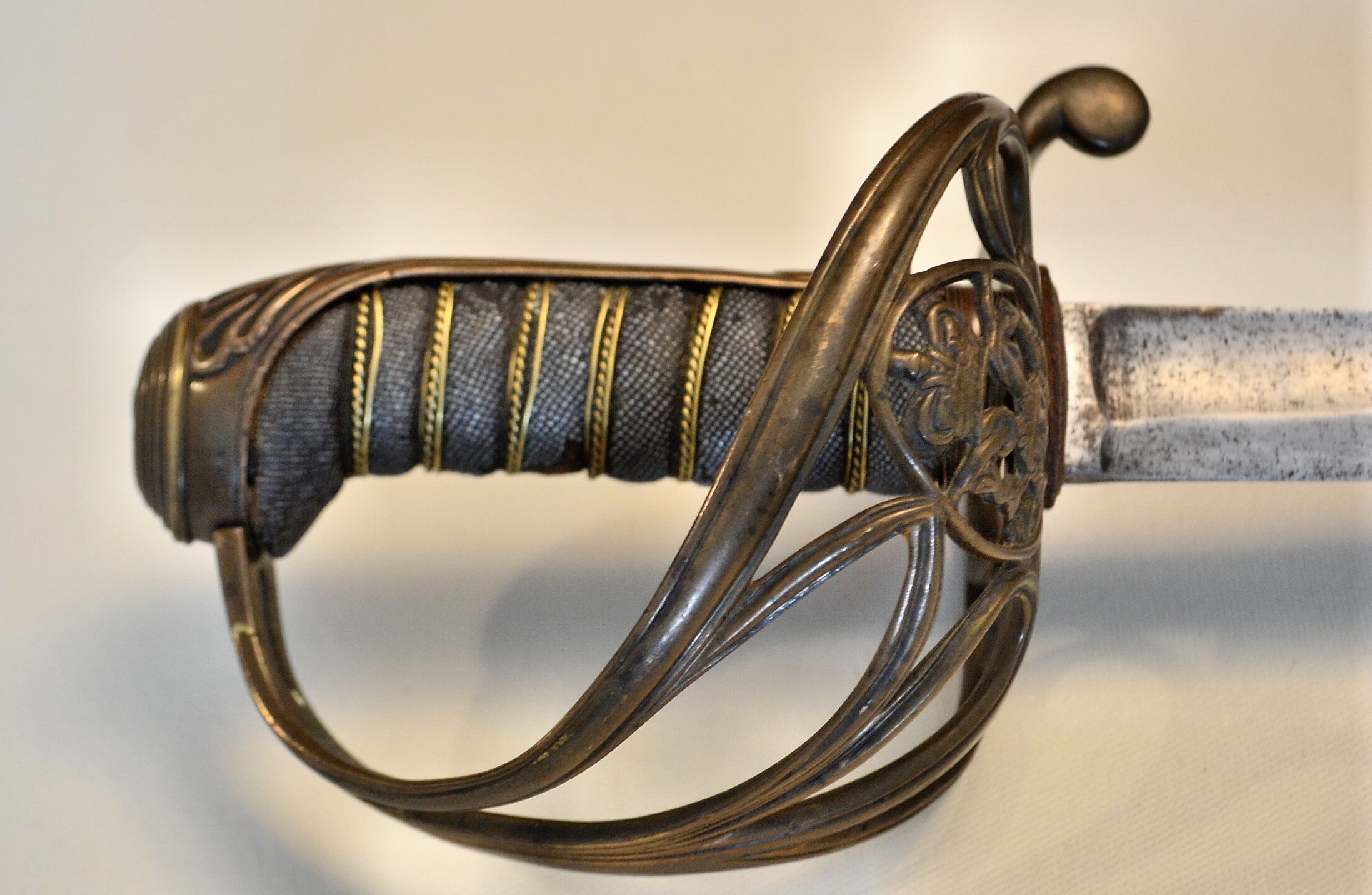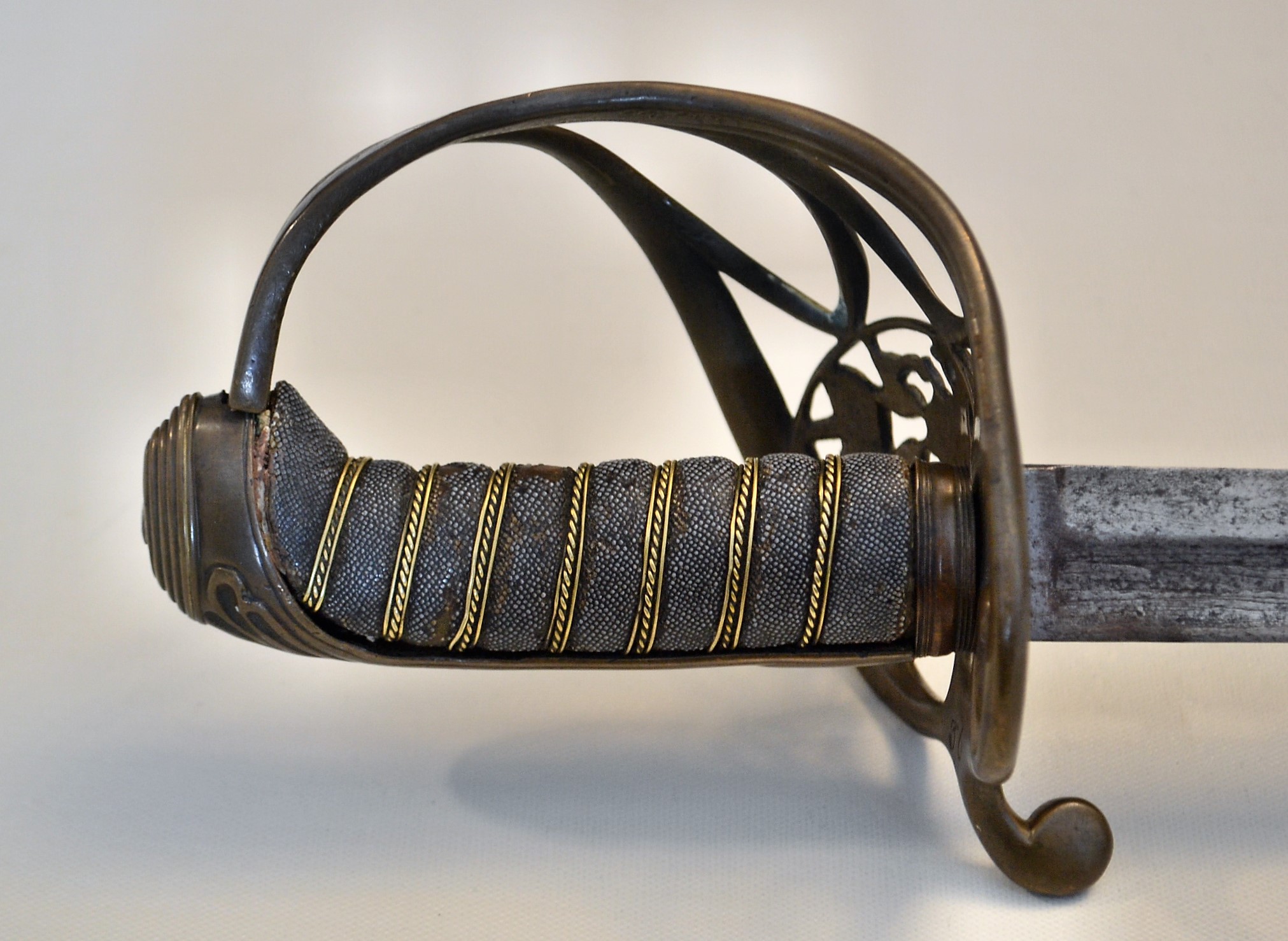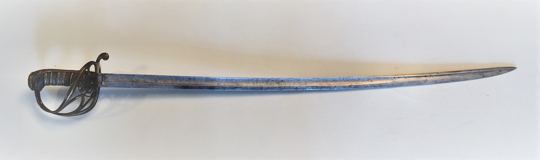 This is a scarce example of an 1822 Sergeant Sabre with the hybrid quillback/fullered blade. The guard is marked with George IV’s cypher, situating it between 1822 and 1830.