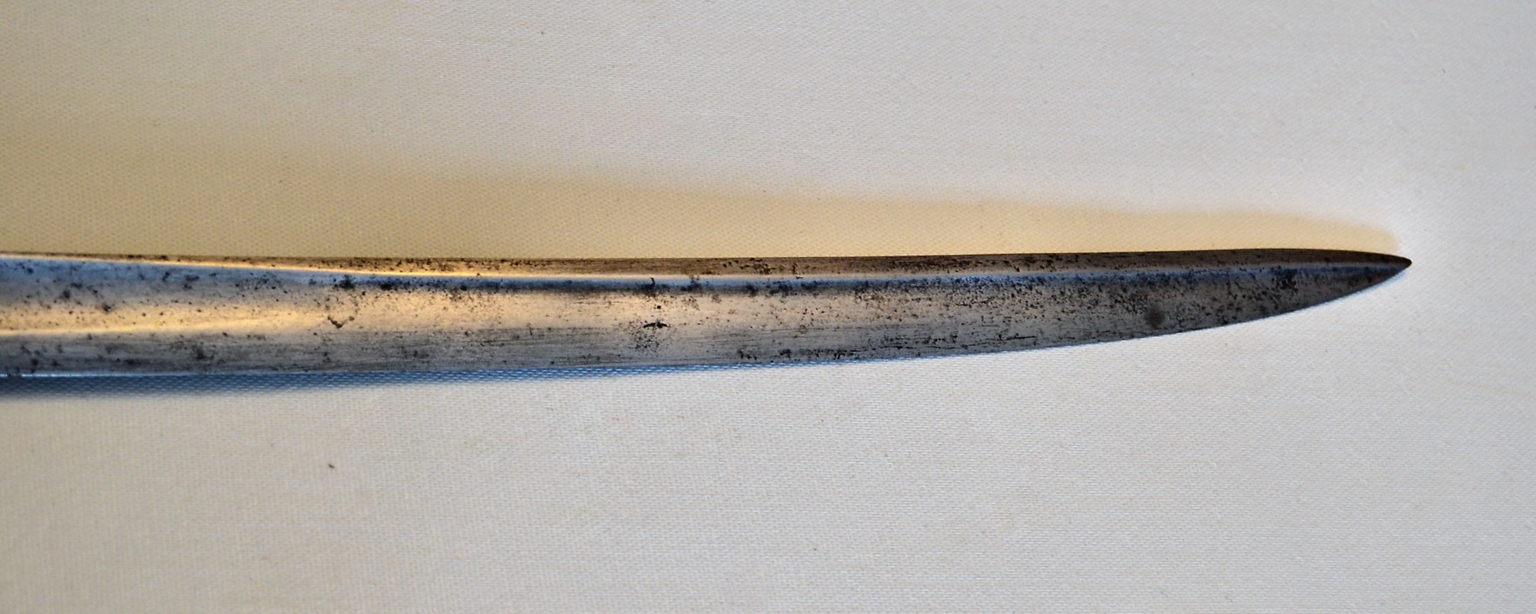 It has a fairly large guard, forming nearly a half basket. The blade has some superficial pitting all over, but is otherwise in very good condition. The riginal leather washer is still there, and the hilt is tight and solid.