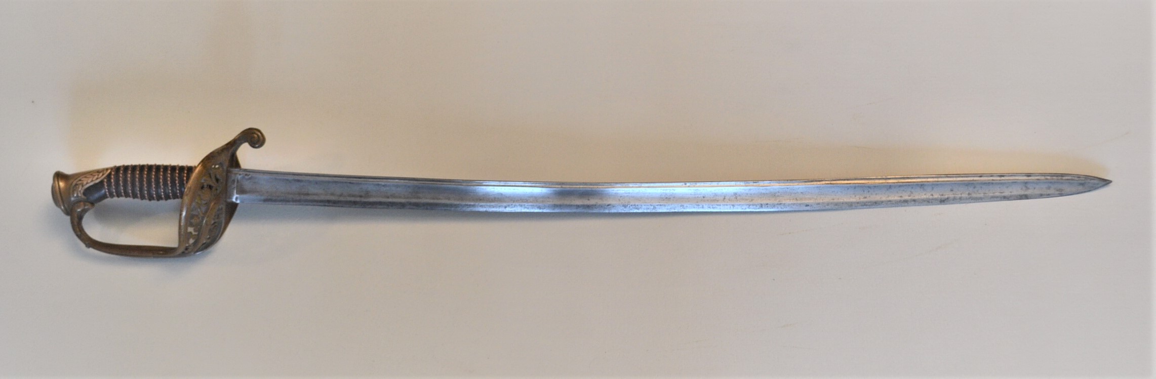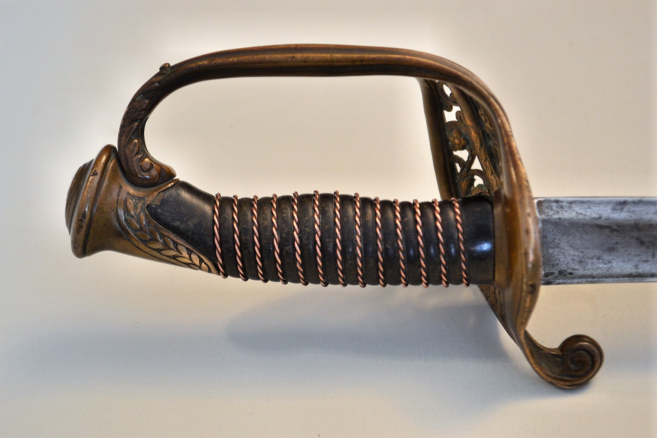 This is a very rare example of the popular 1845 infantry officer sabre. The blade looks like a fairly typical product of Klingenthal, and was service sharpened a few times perhaps even to repair a nick near the upper portion.