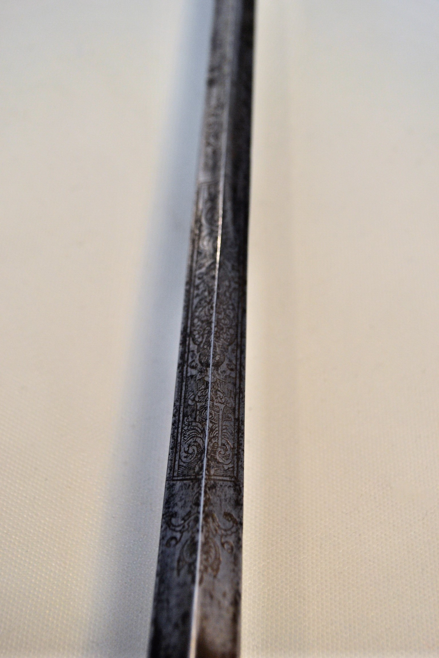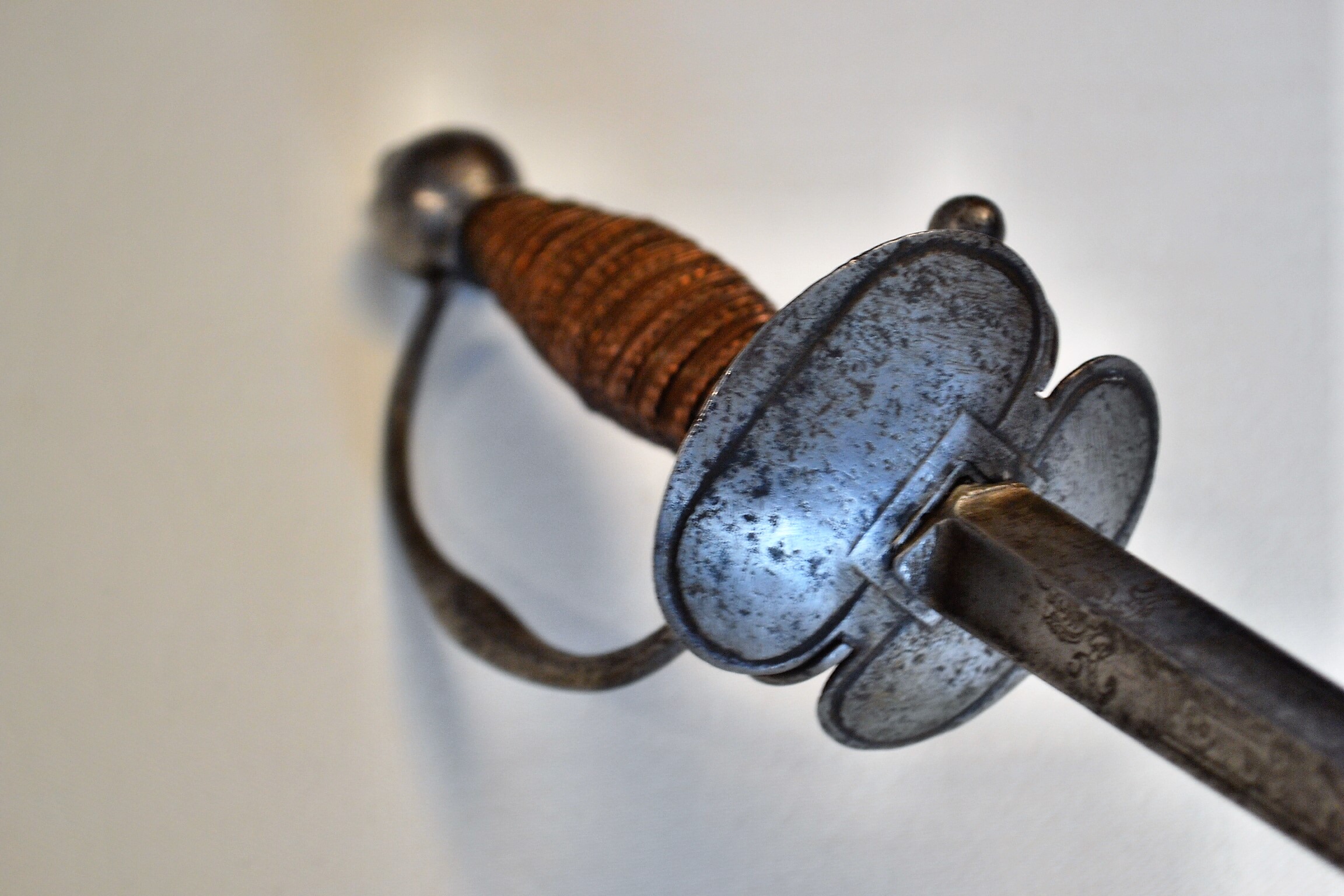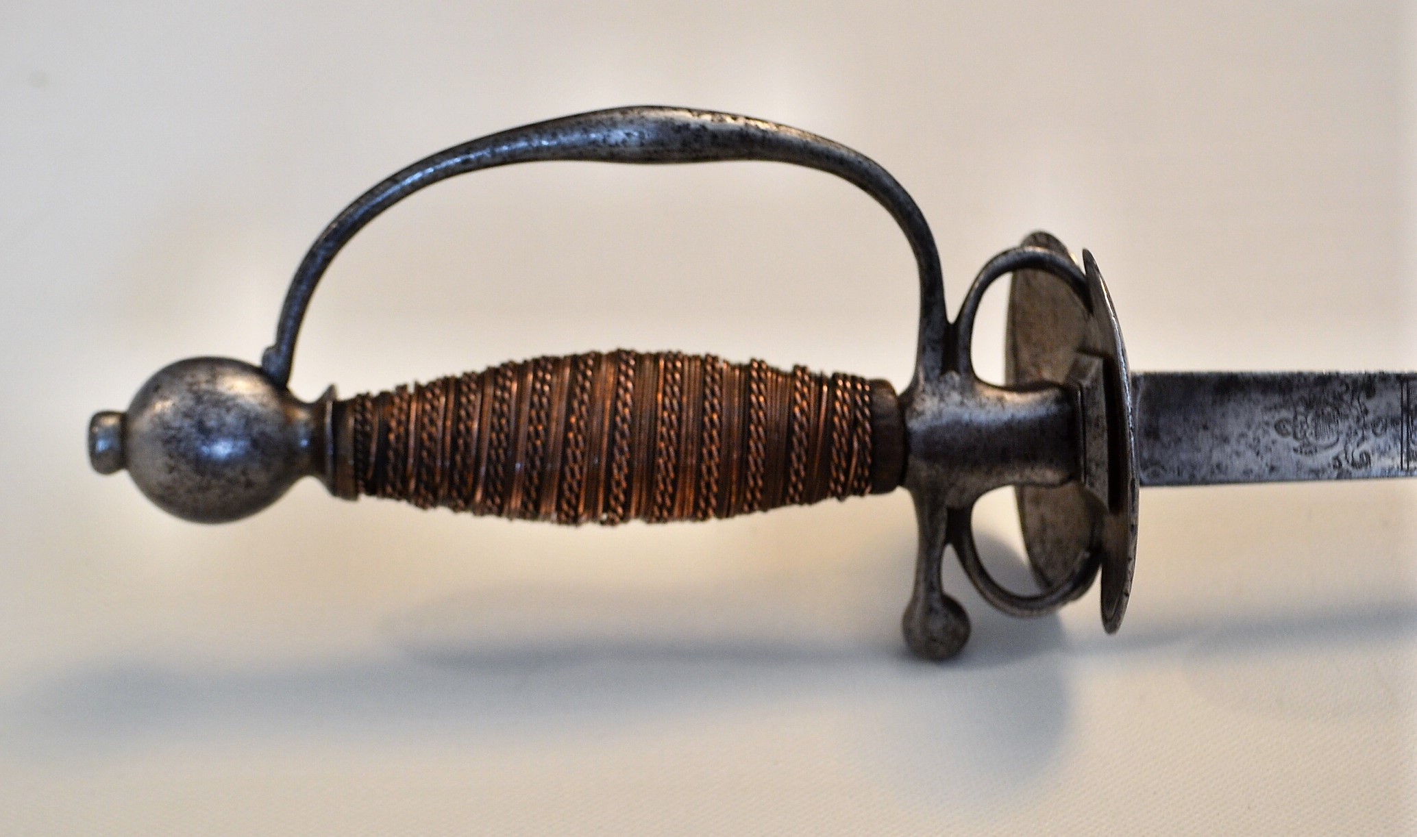This steel hilted smallsword was probably, udged on its short lenght, used by an infantry officer or NCO during the early part of the 18th century. It sports a nicely decorated and stuot triangular blade. The hilt is fairly solid, with some slight movement at the pommel and on the grip’s wire, possibly due to shrinkage of the wooden core. The grip is missing the upper copper ring, which could be easily replace based on the lower one.
