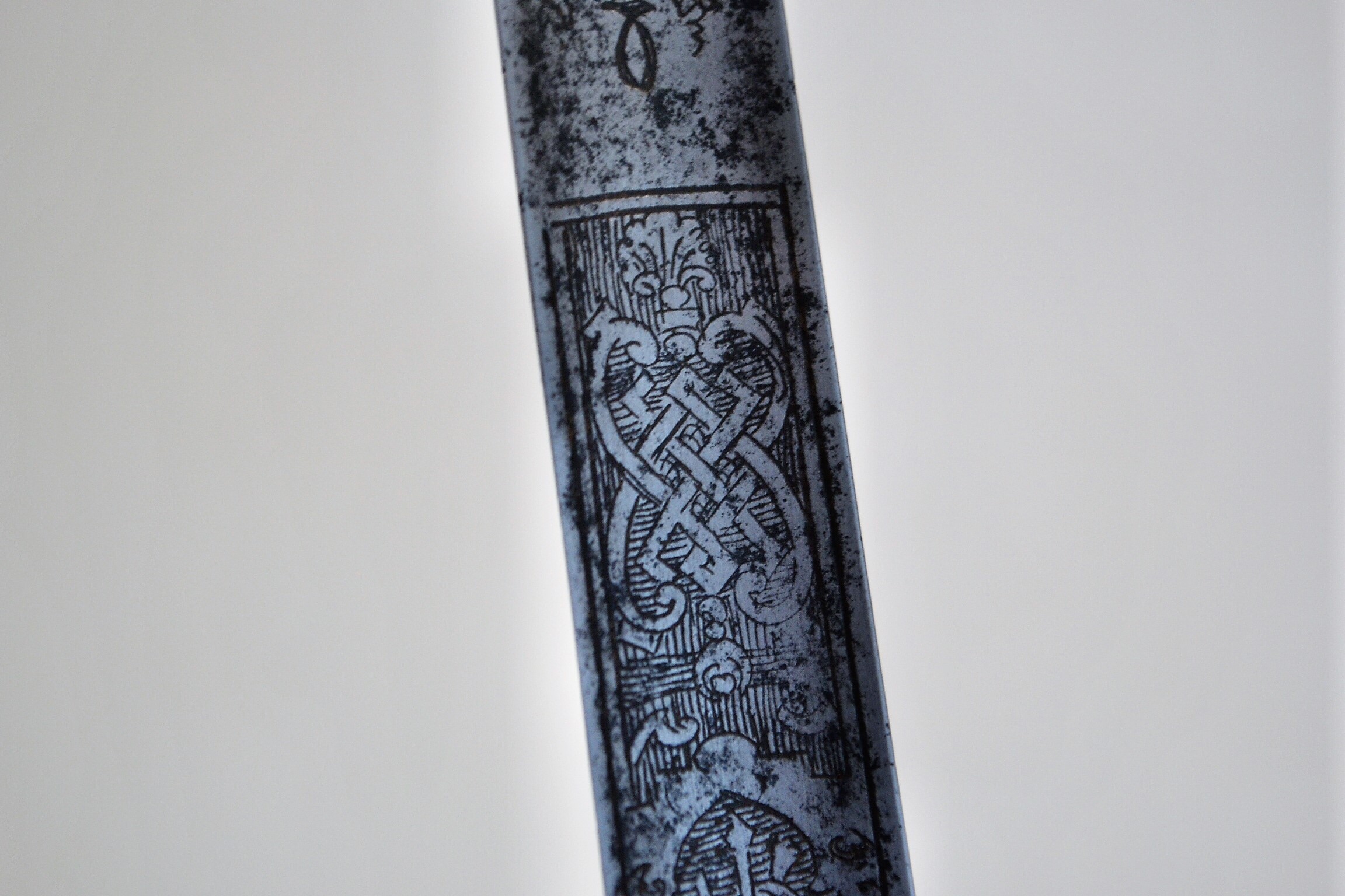 The blade has some uneven surface pitting, and a slight warp ner the upper part. Nevertheless, it is still perfectly in line with the grip.)