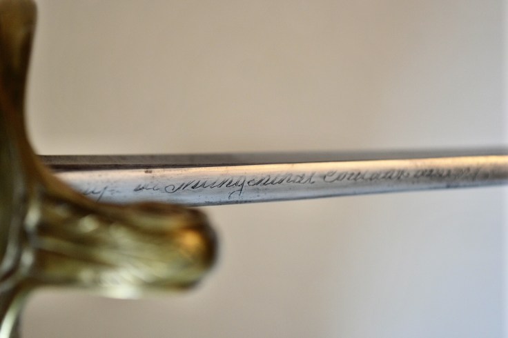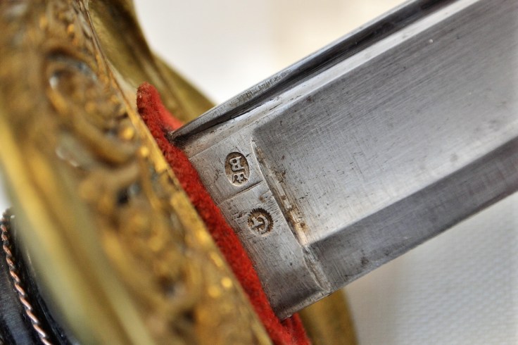 The blade is in pristine shape and was at some point service sharpened. It still has its original felt washer. The grip is tight, with a bit of a play in the wiring. The scabbard is in good condition, though the drag was seperate when I received it. It has since been repaired. The scabbard fits very snuggly but not too tightly either, a rare thing for a leather scabbard of that age.