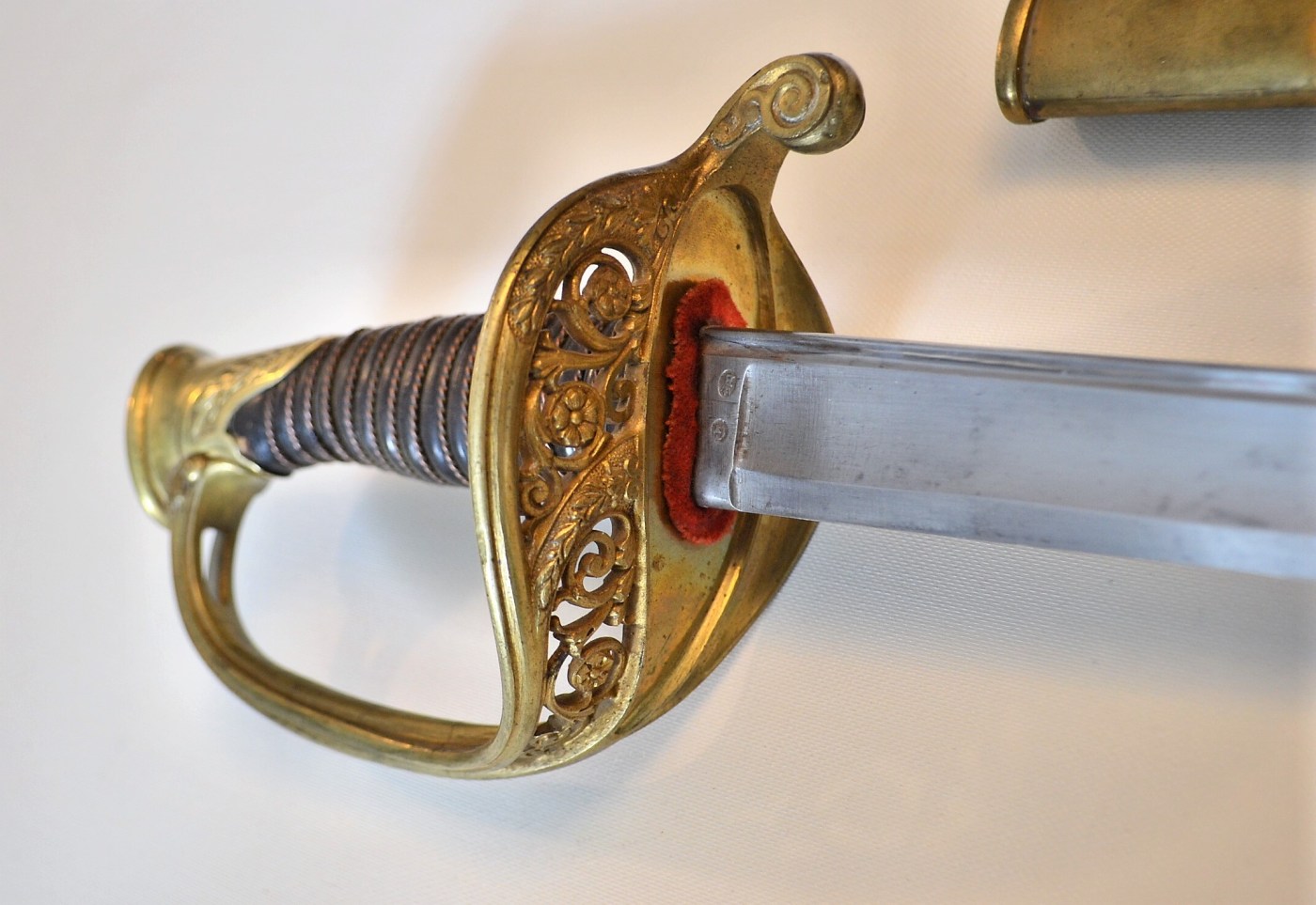 For sale this very high end version of an 1845 infantry officer sabre made by Coulaux of Klingenthal. Unusual for a Klingenthal piece, this sabre is of very fine craftmanship, with a highly detailed guard, very crisp lines on a robust blade, nice coiled original grip wiring and a high quality scabbard to go along with it.