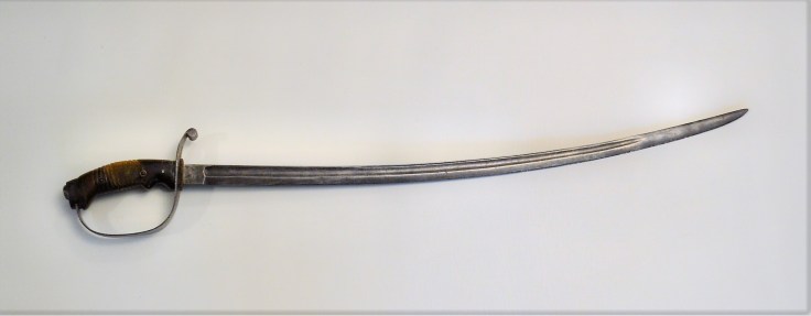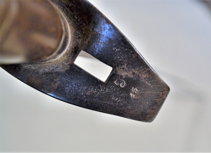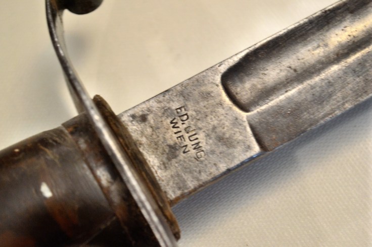 This peculiar sabre was made around WW1 in Austria but destined for German use. It sports an early synthetic grip, not unlike the 1889 German cavalry sabre, but with a much more minimal knuckle guard. The grip is in good shape, except for wear damage on one side.