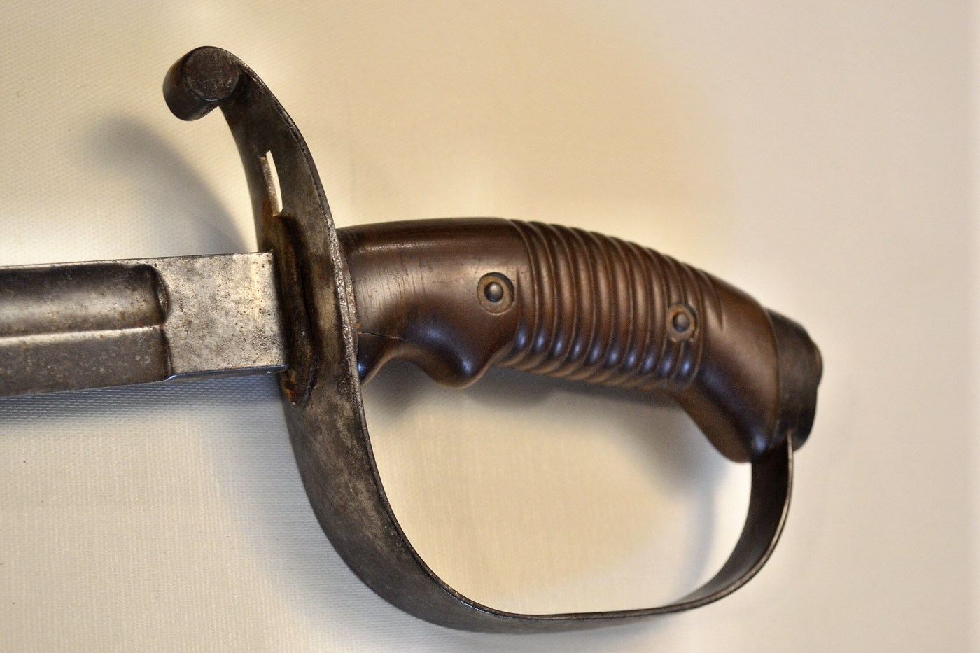 This peculiar sabre was made around WW1 in Austria but destined for German use. It sports an early synthetic grip, not unlike the 1889 German cavalry sabre, but with a much more minimal knuckle guard. The grip is in good shape, except for wear damage on one side.