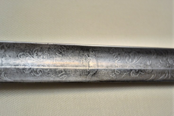 This Canadian Militia sabre was likely made between 1856 and 1879, based on the retailer’s address. As is the case with many Canadian Militia swords, the blade was likely made in Solingen, in this case by P.D. Luneschloss, based on the inscription that is found on the back of the blade: “Warranted to cut wrought iron” which can be found on this maker’s swords from the same era.