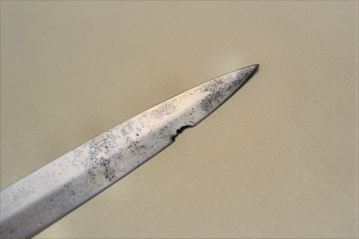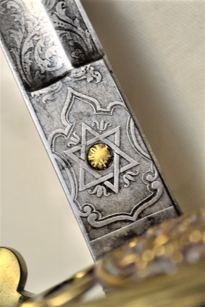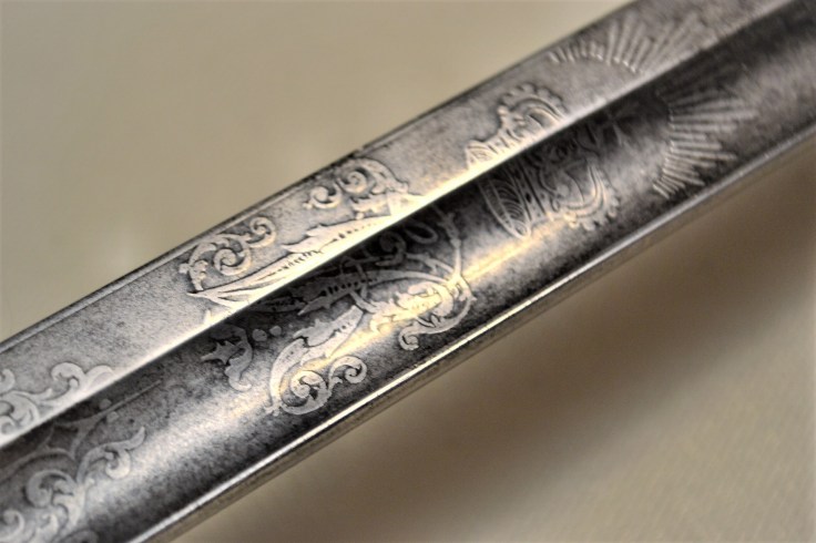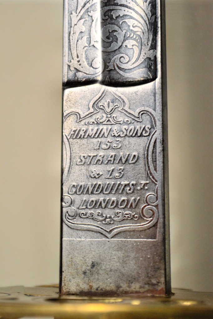 The sabre is in excellent condition, with a very faint patina, crisp etching and absolutely tight construction. The only blemish is a small nick on the edge near the tip.