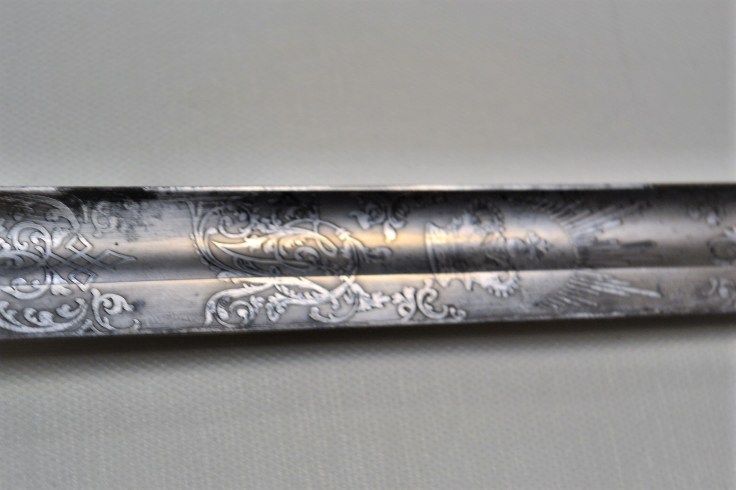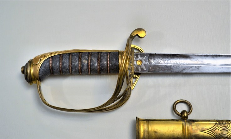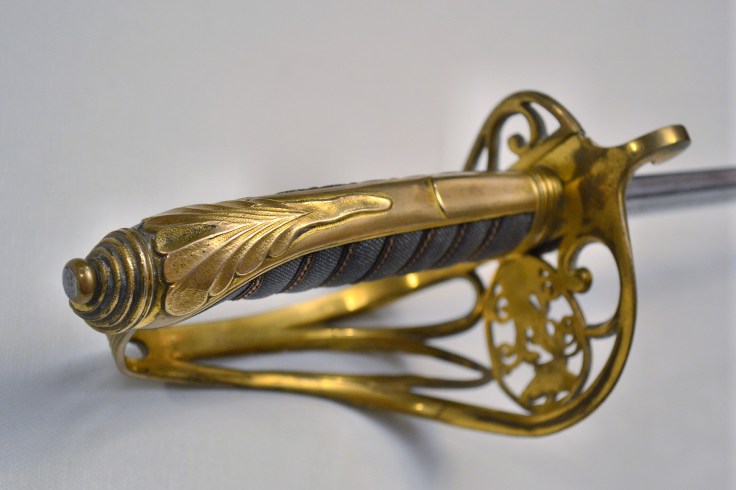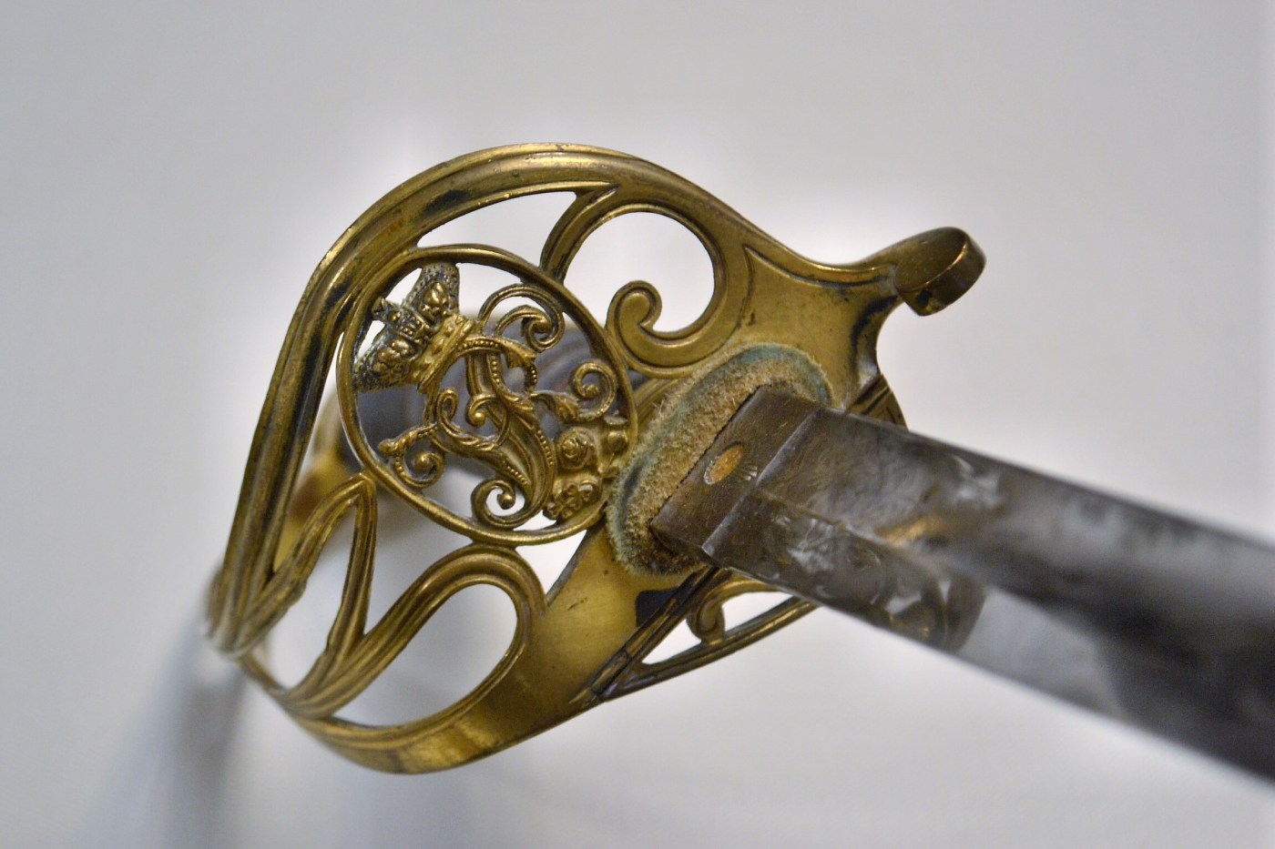 This sword is a picture perfect example of the 1845 infantry officer sabre. The blade is decorated on both sides with Queen Victoria’s monogram, and bears a proof mark that could identify it to Robert Mole.