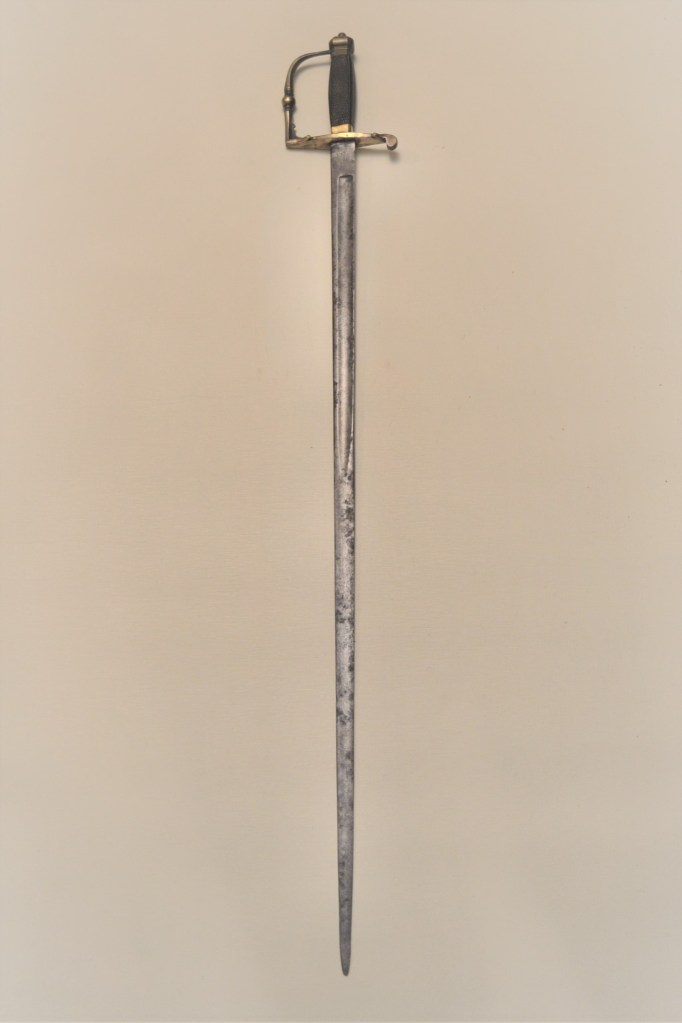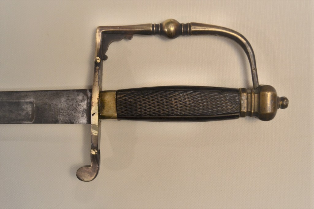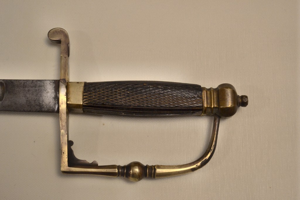 This particular spadroon is very typical of the type, with a reinforced guard and an ebony grip. It is otherwise identical to British patterns. The blade is pitted, the counter guard has been broken off, and the cross guard itself and the grip have seen a few repairs. Still, a great example of this unique and curious French type.