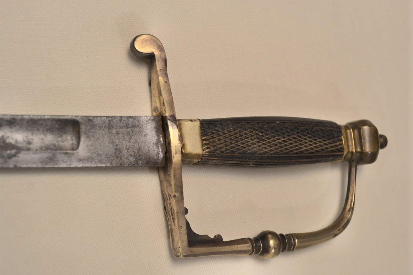 This particular spadroon is very typical of the type, with a reinforced guard and an ebony grip. It is otherwise identical to British patterns. The blade is pitted, the counter guard has been broken off, and the cross guard itself and the grip have seen a few repairs. Still, a great example of this unique and curious French type.
