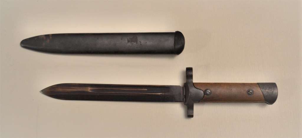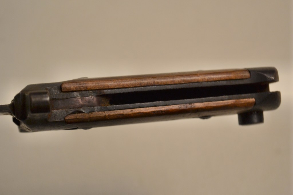 This is an original “second model” 1938 Carcano bayonet made for the Italian army. The first model had an unusual folding blade, which was judged unpractical. The second model was then made with a fixed blade and crossguard. This example is in great shape, with the original bluing nearly intact.