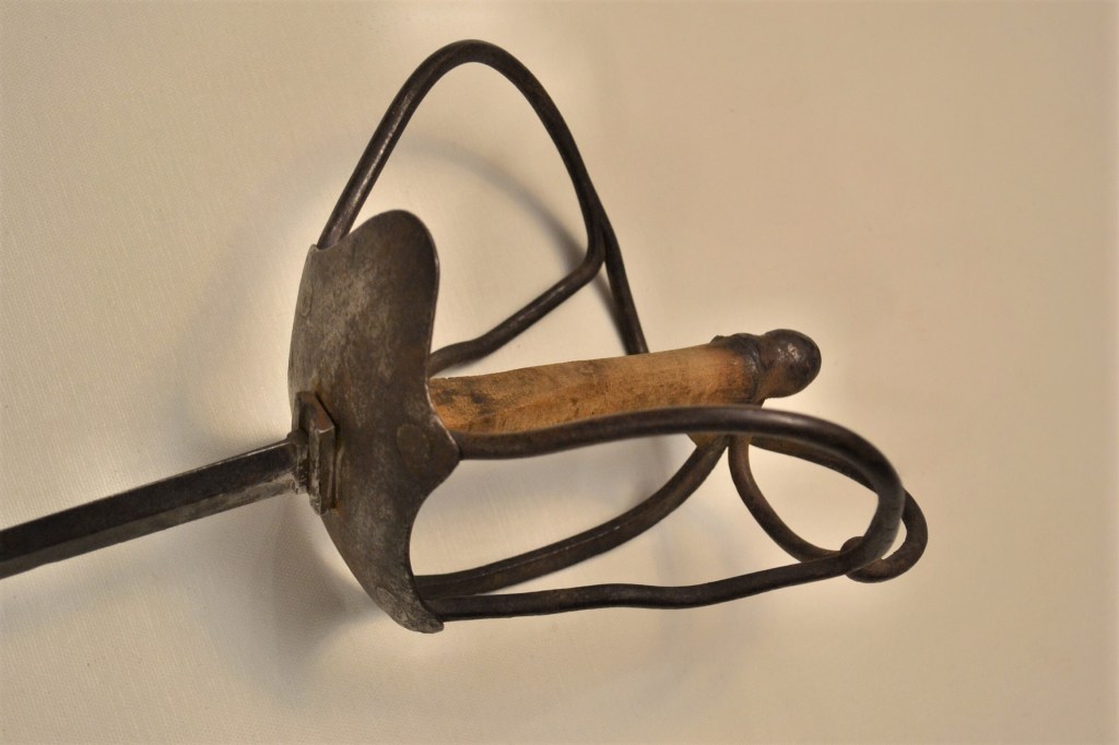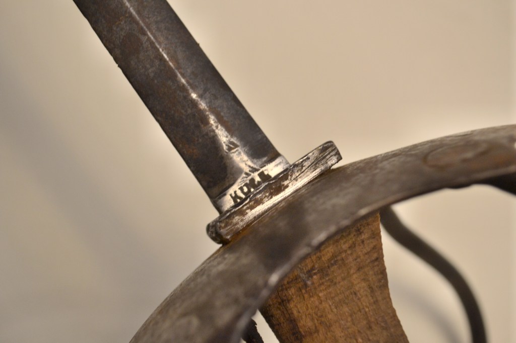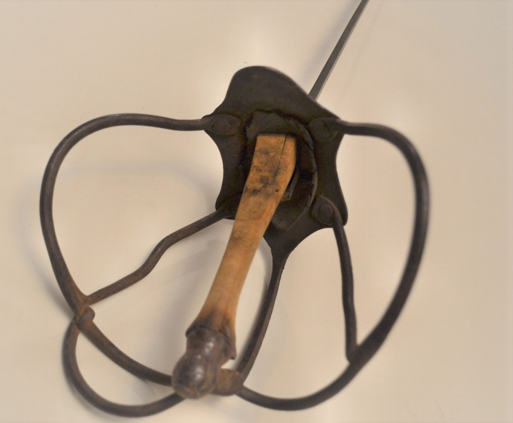 This is a typical example of a schläger for mensur, a type of dueling that is practiced in certain German fraternities seeking to cut your opponent’s face while protecting your own. This sword has some rust on the blade and patina on the guard, but would clean up nicely. It is missing the rope of the grip, and the leather index loop is broken. The tip of the blade is still very sharp, but has a slight bend to it, which could be fixed.