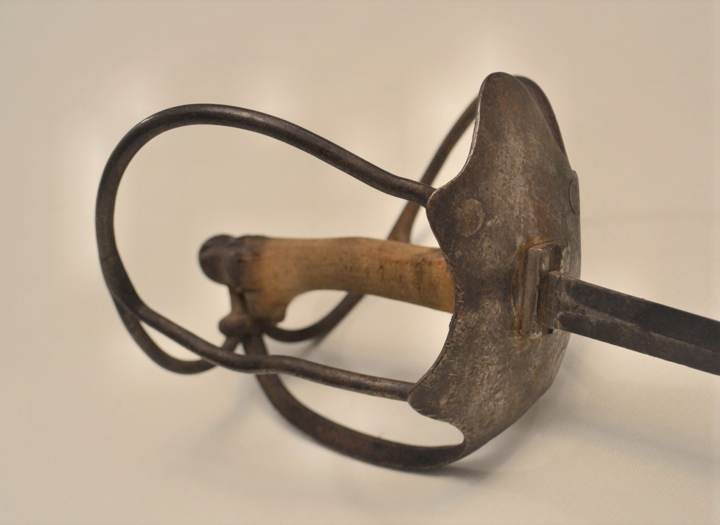 This is a typical example of a schläger for mensur, a type of dueling that is practiced in certain German fraternities seeking to cut your opponent’s face while protecting your own. This sword has some rust on the blade and patina on the guard, but would clean up nicely. It is missing the rope of the grip, and the leather index loop is broken. The tip of the blade is still very sharp, but has a slight bend to it, which could be fixed.