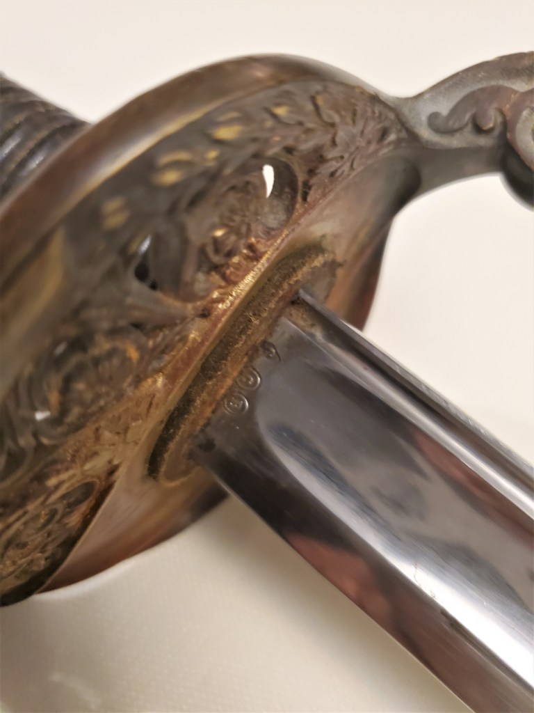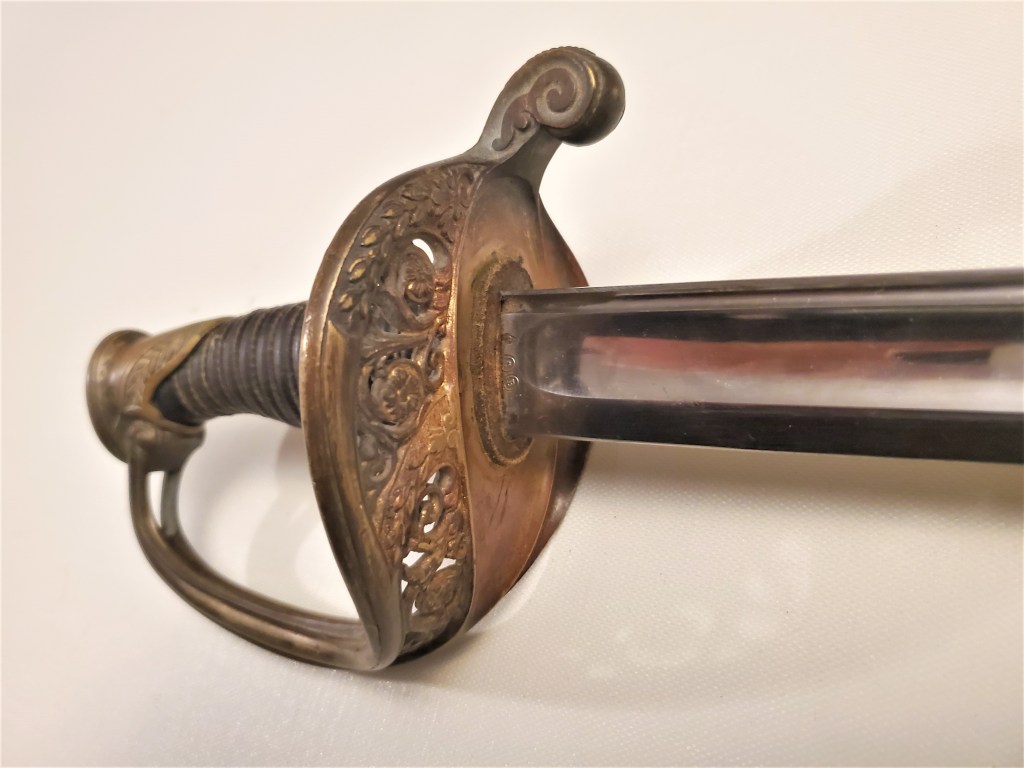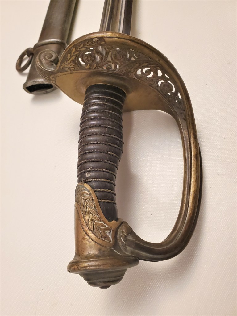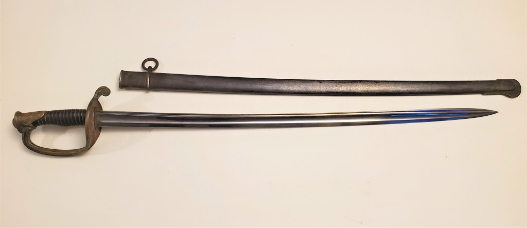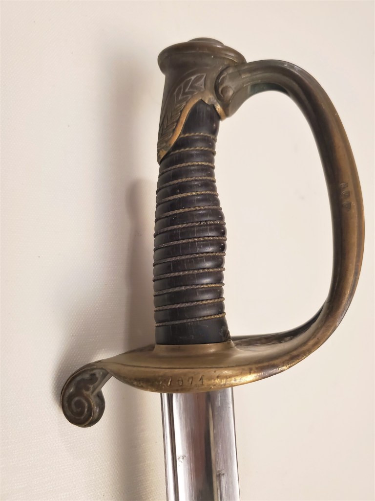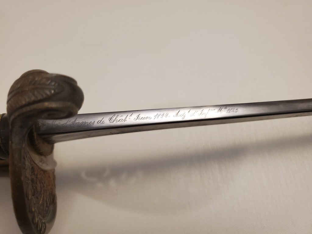 This is great example of a typical Chatellerault made 1845 infantry adjudant sabre. These sabres were carried until 1916 by adjudants (NCOs) even sometimes in the trenches. This example is a fairly standard one, made in 1896 at Chatellerault, the main state manufacture in France which produced the best quality blades. The hilt and scabbard show matching serial numbers. The sword is solid with absolutely no rattling.