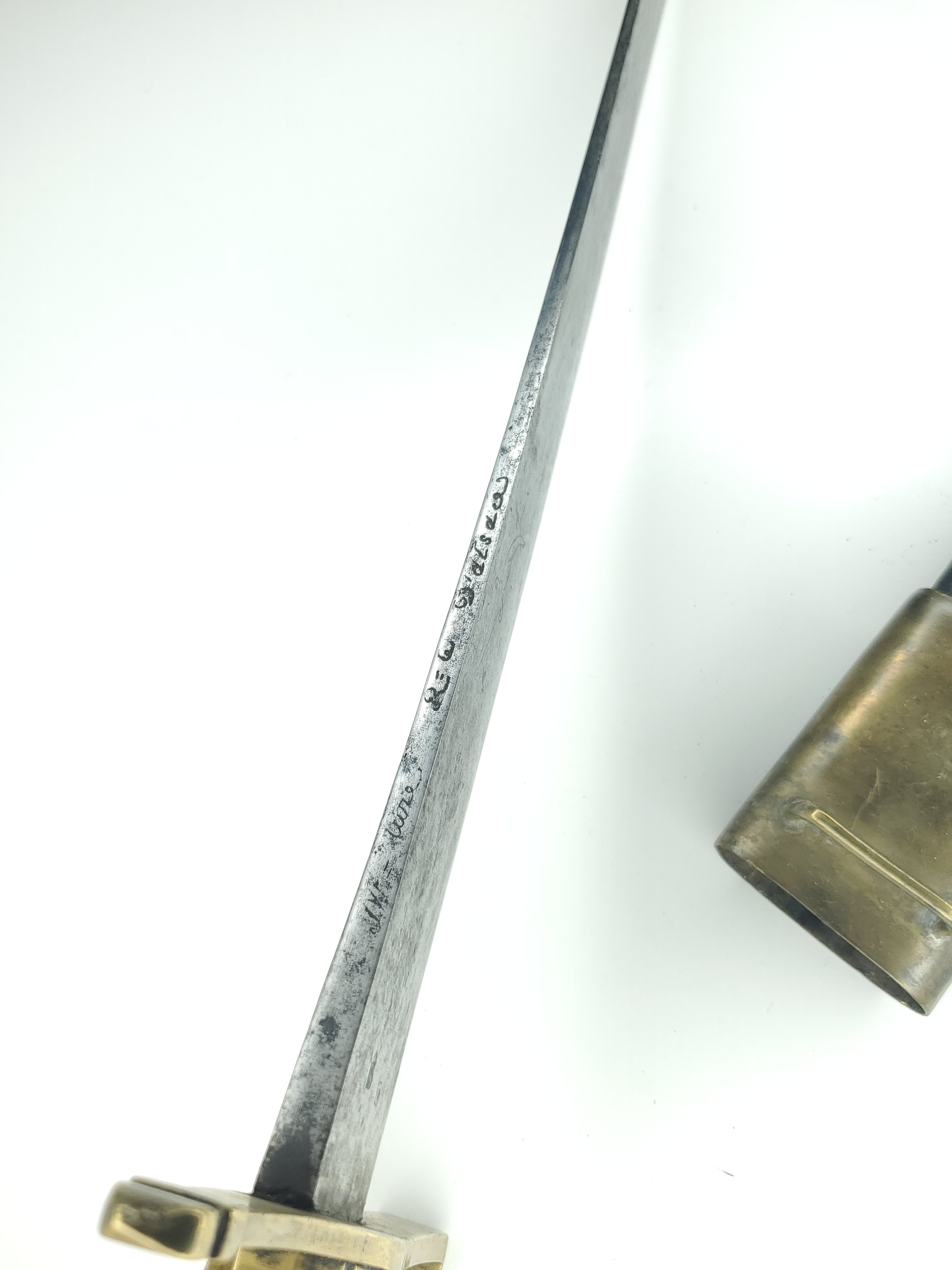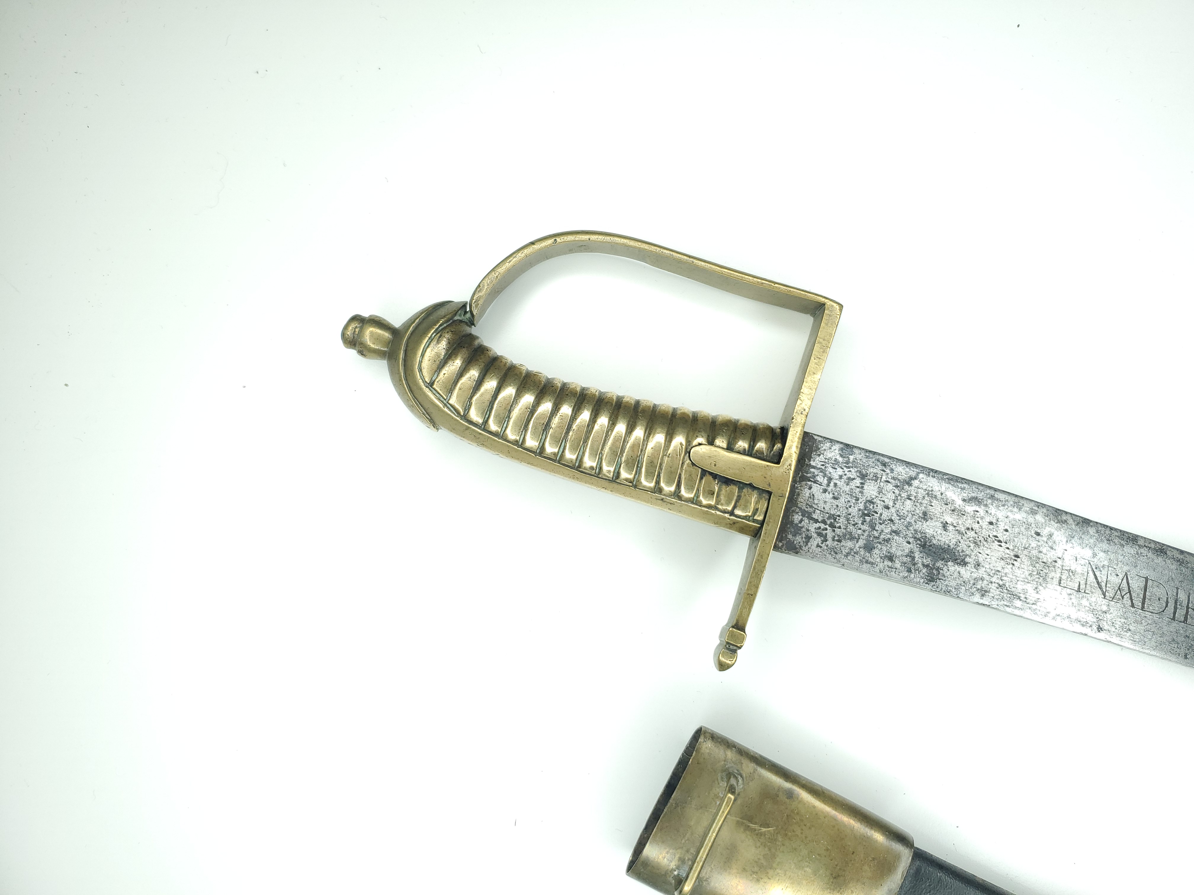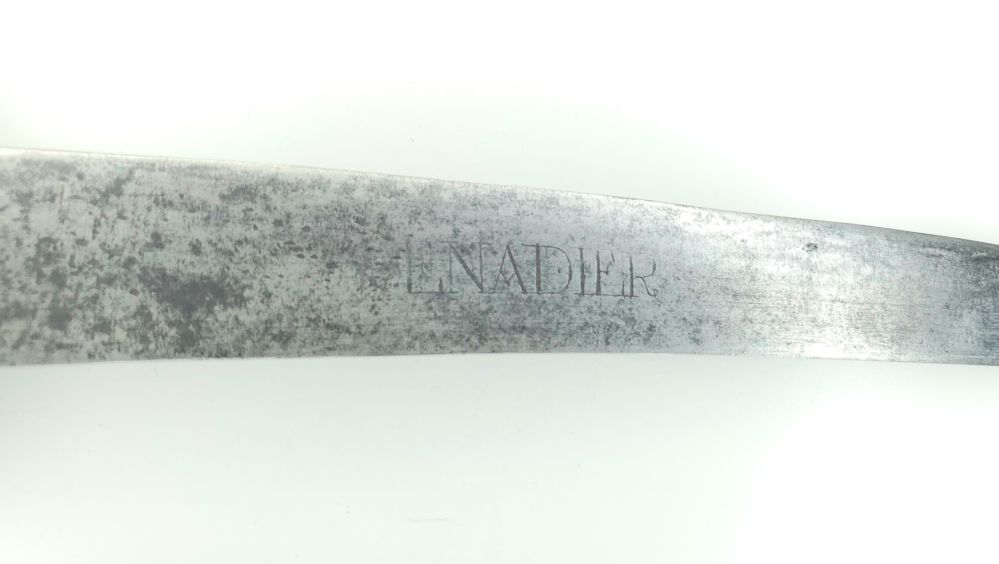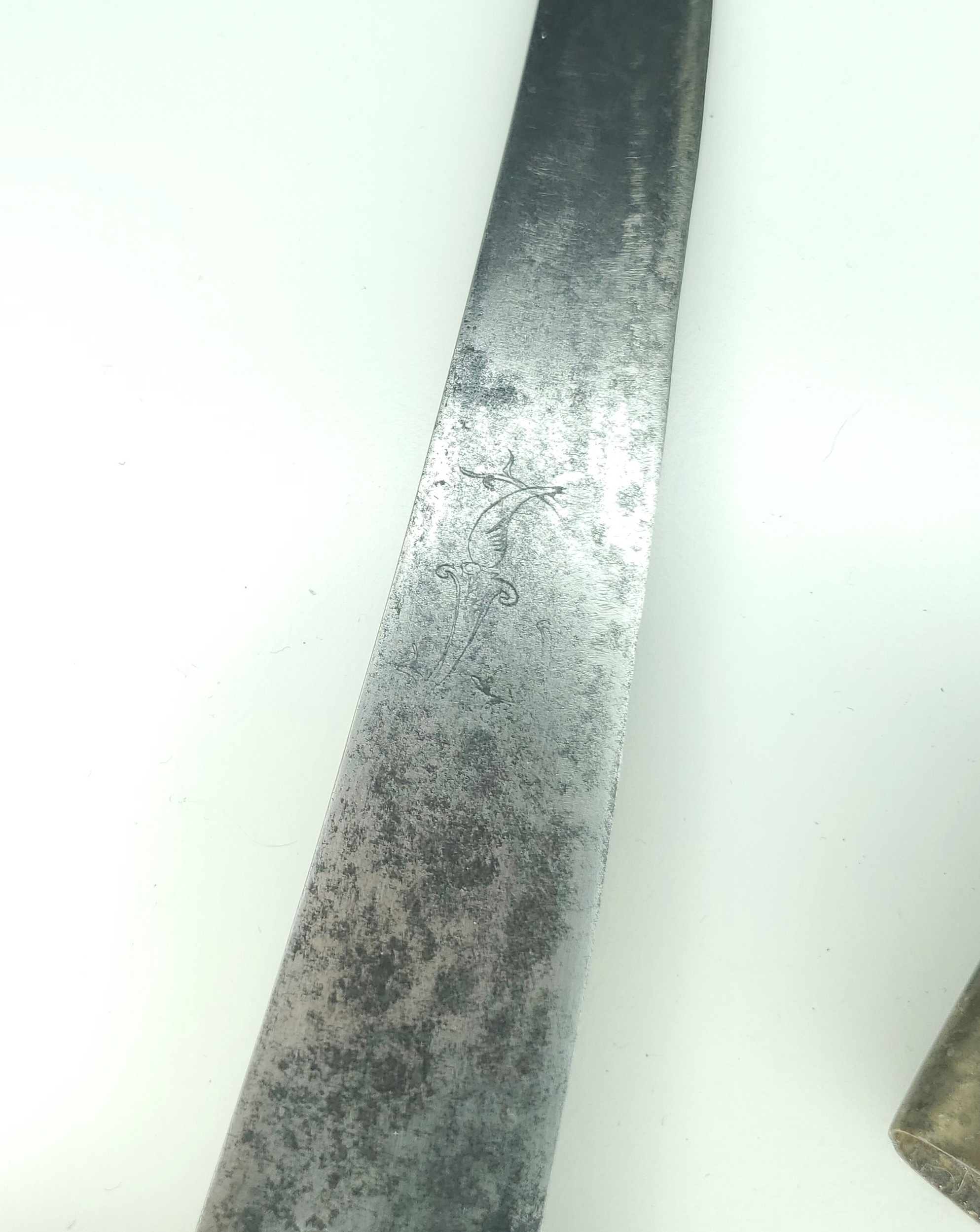 This specific example had a very active life, as its thorougly sharpened blade shows. The blade also shows all of it’s original markings from the factory name on the back (Manufacture Royale D’Alsace, which later became Klingenthal. It shows the poincons of the inspectors, as well as the Royal cypher of Louis XVI and the remains of the word Grenadier.