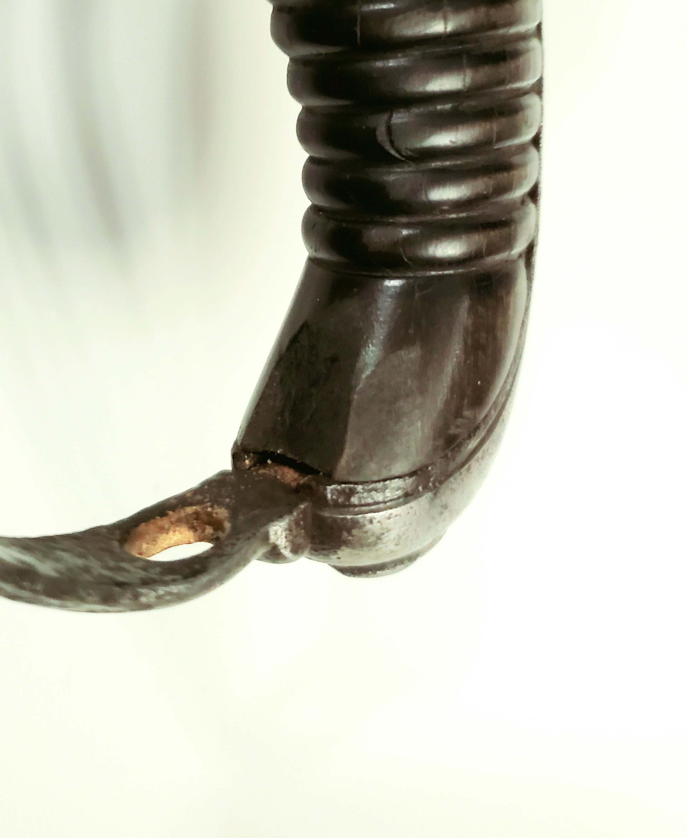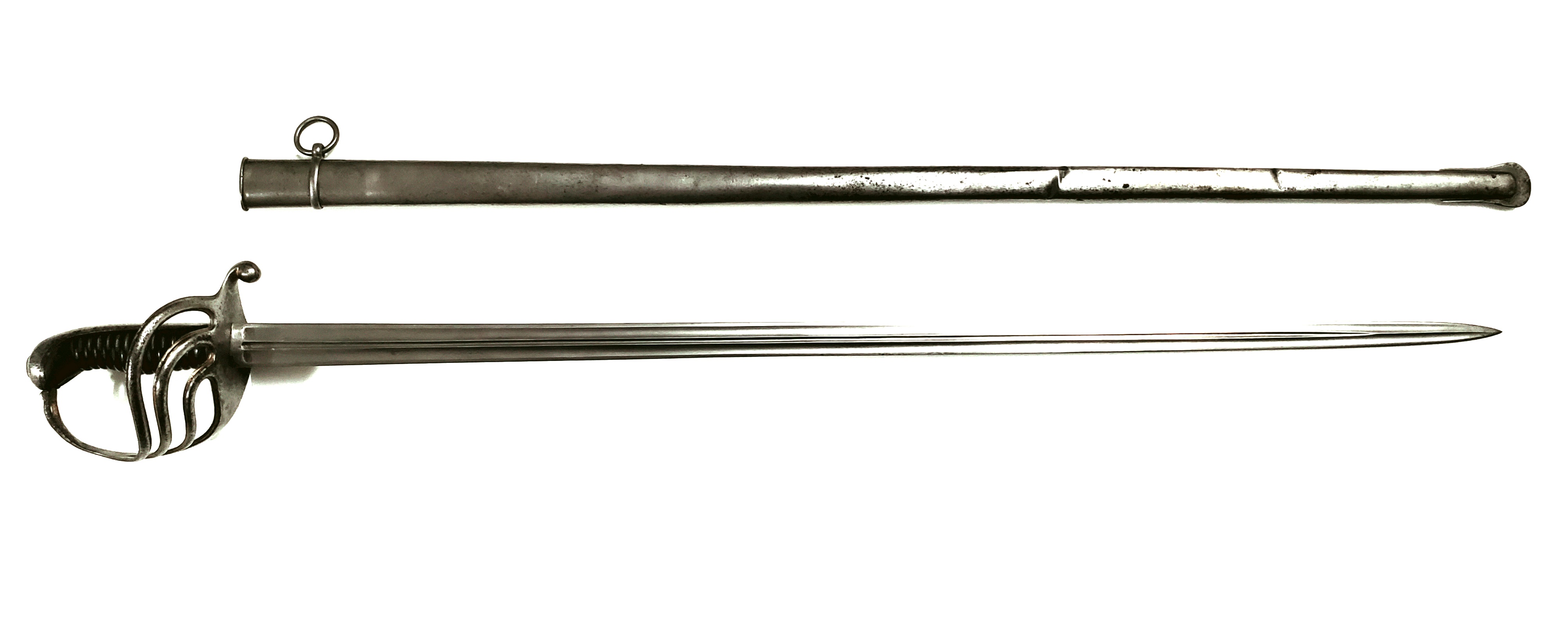The tinplate scabbard is in good overall shape, with a few dents, probably from being carried on a horse. It has only one ring, which could mean that it was still carried in 1882, or that the bottom one was lost, as they are held to the scabbard by friction and resin.