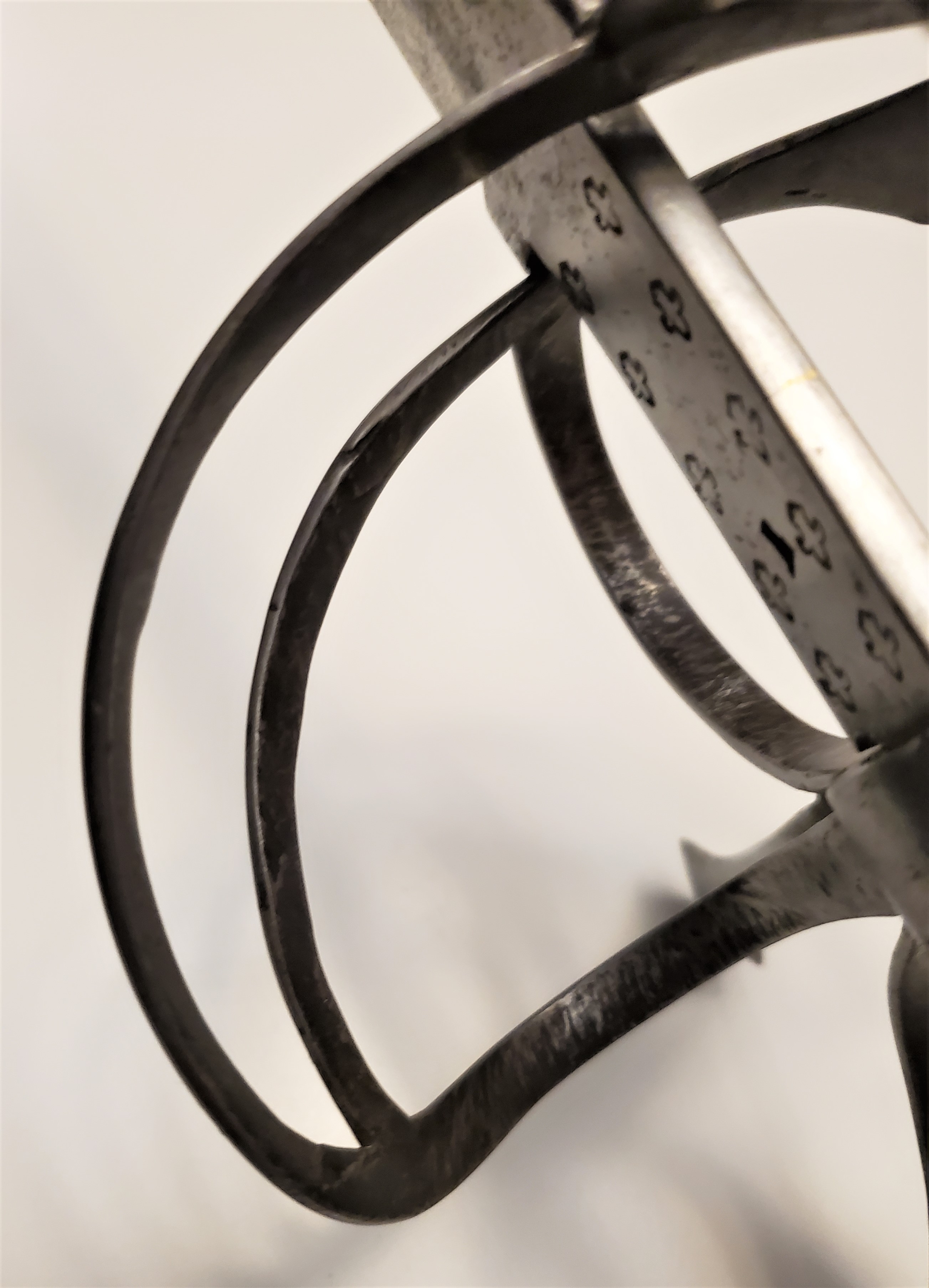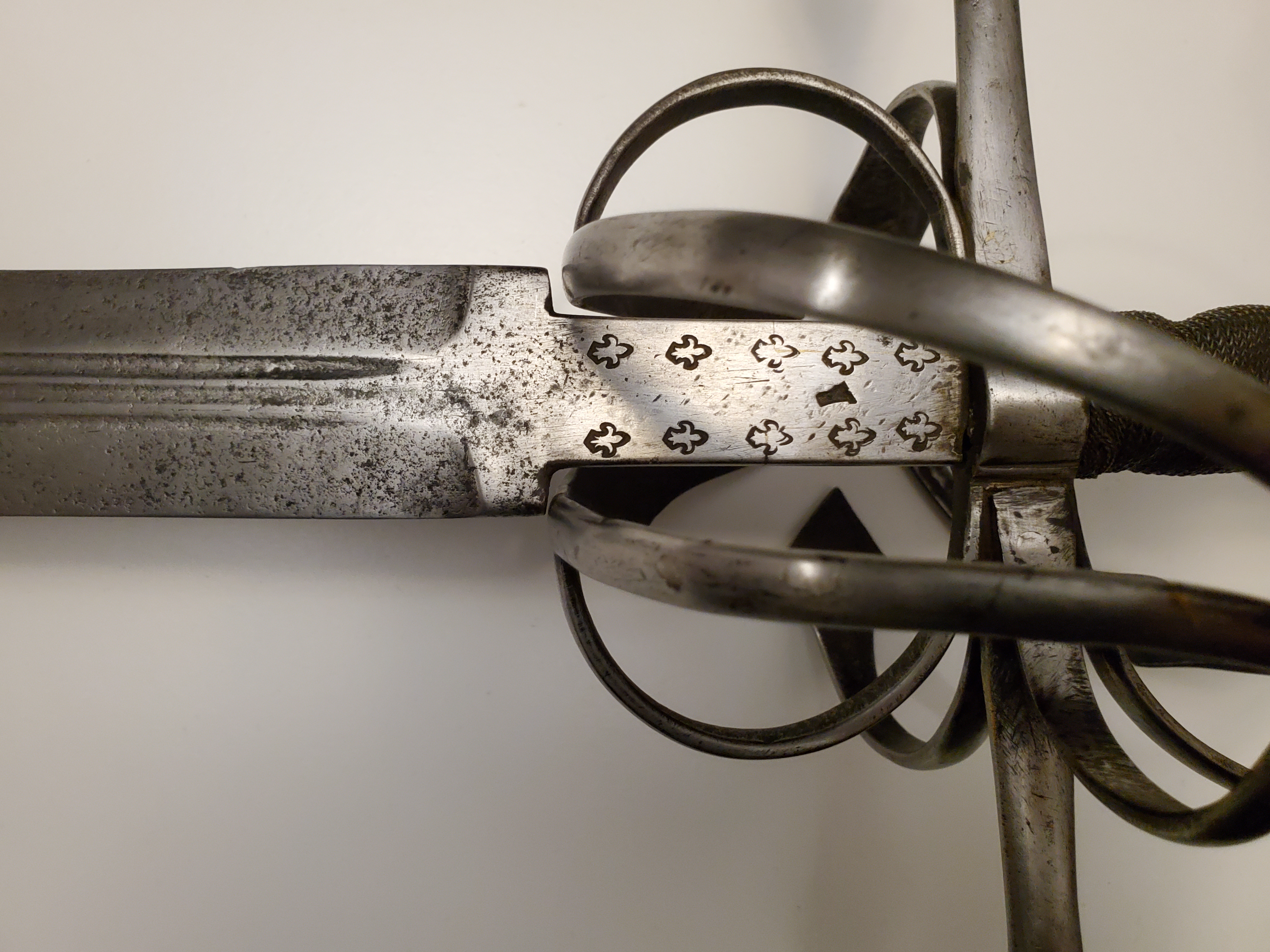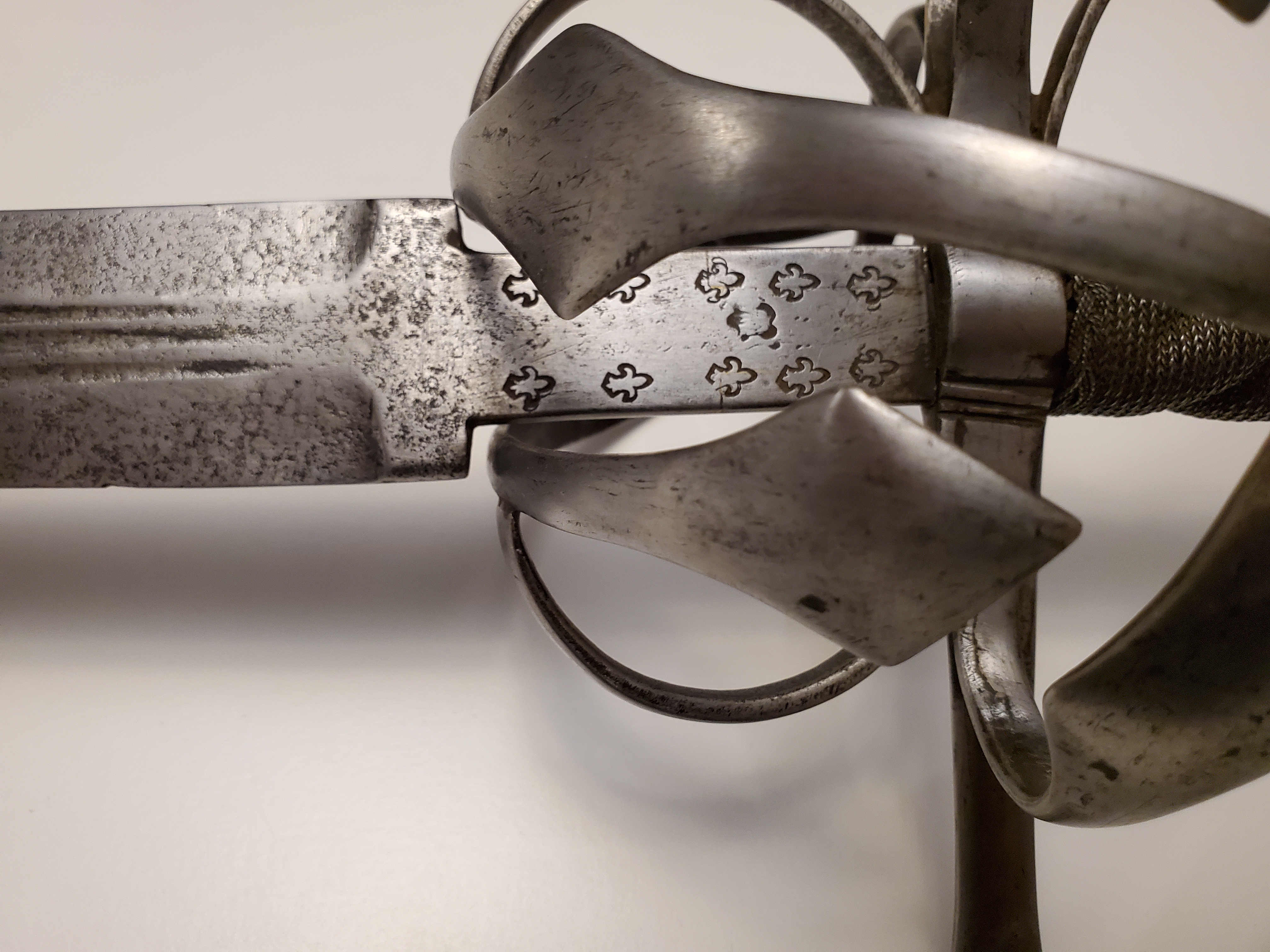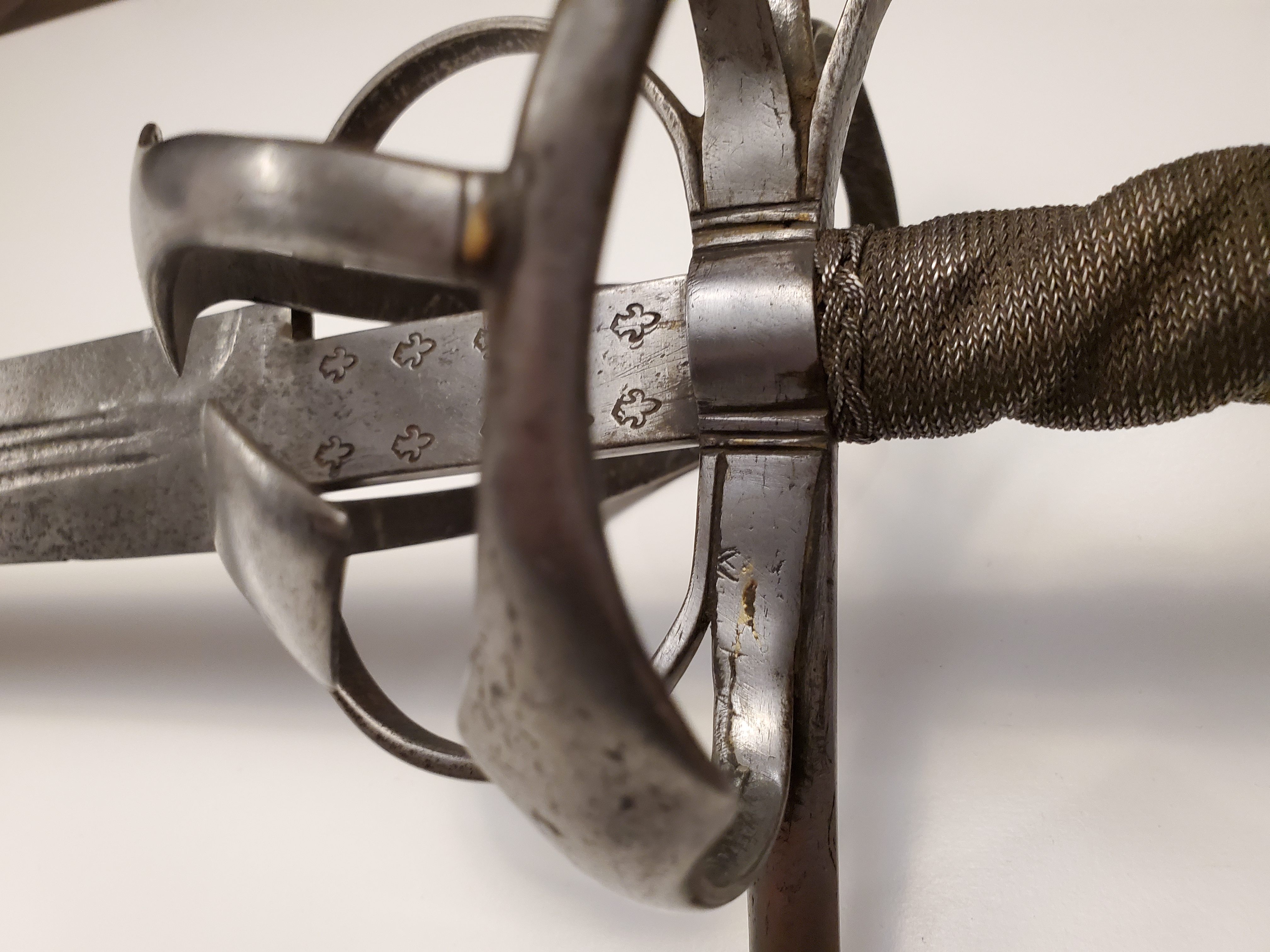 The ricasso has original swordsmith marks, along with some later fleur de lys. It was lenghtened to fit the hilt by brazing two steel blocks where the ricasso ends, and is nearly invisible unless observed very closely.