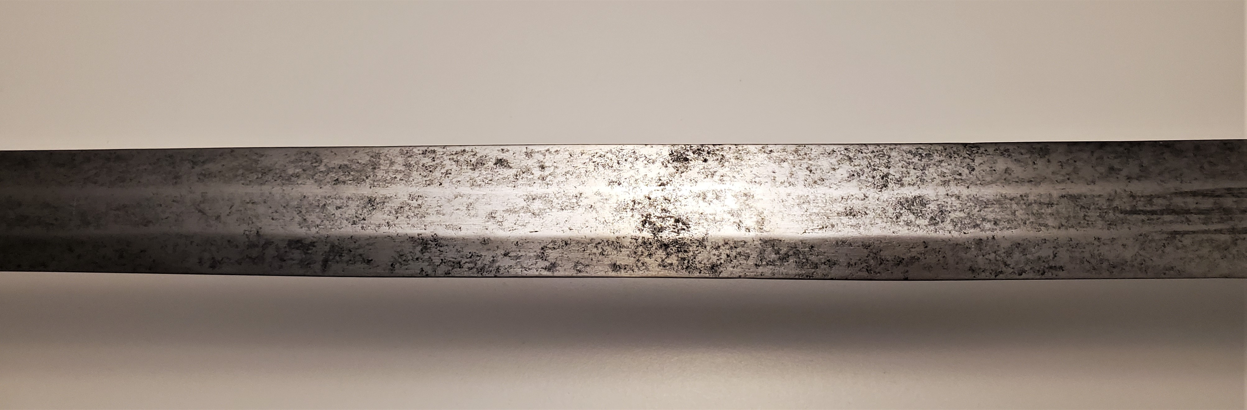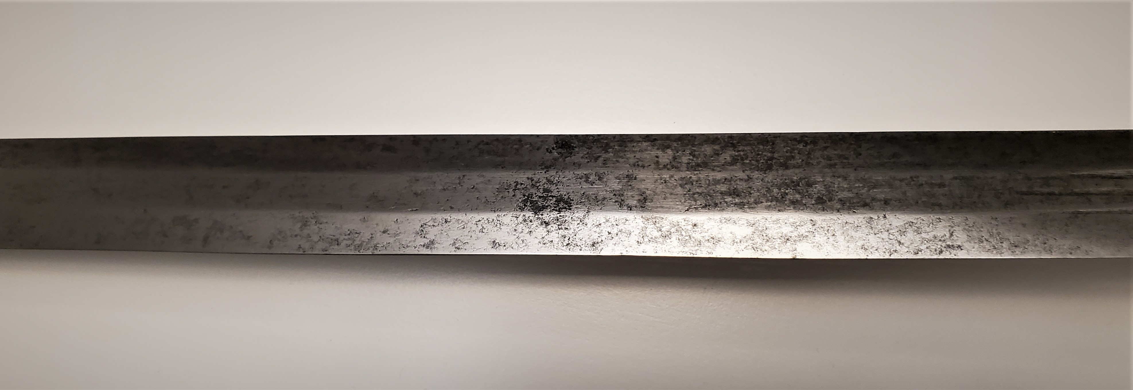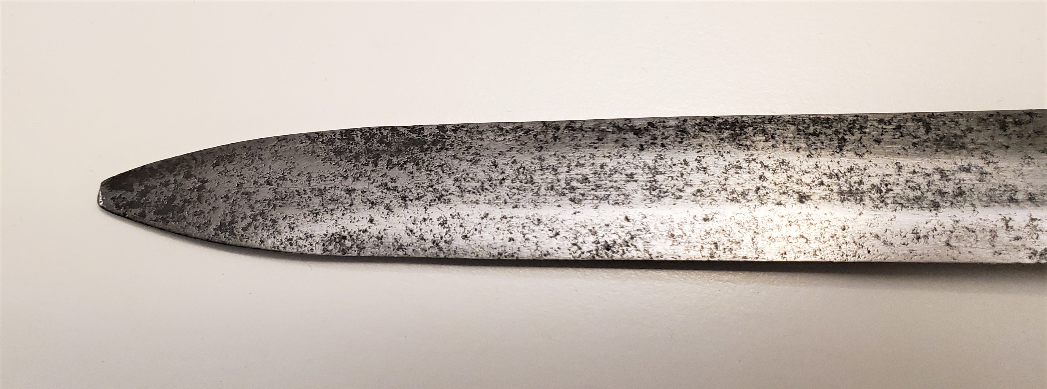 The guard has a rough forge finish on the inside, with file marks, showing that it was probably meant has a soldier sidearm. The blade is in good shape for it’s age, with a thorough patination on most of the surface, and was visibly well sharpened during it’s life. It too was visibly meant as a weapon of war first and foremost.