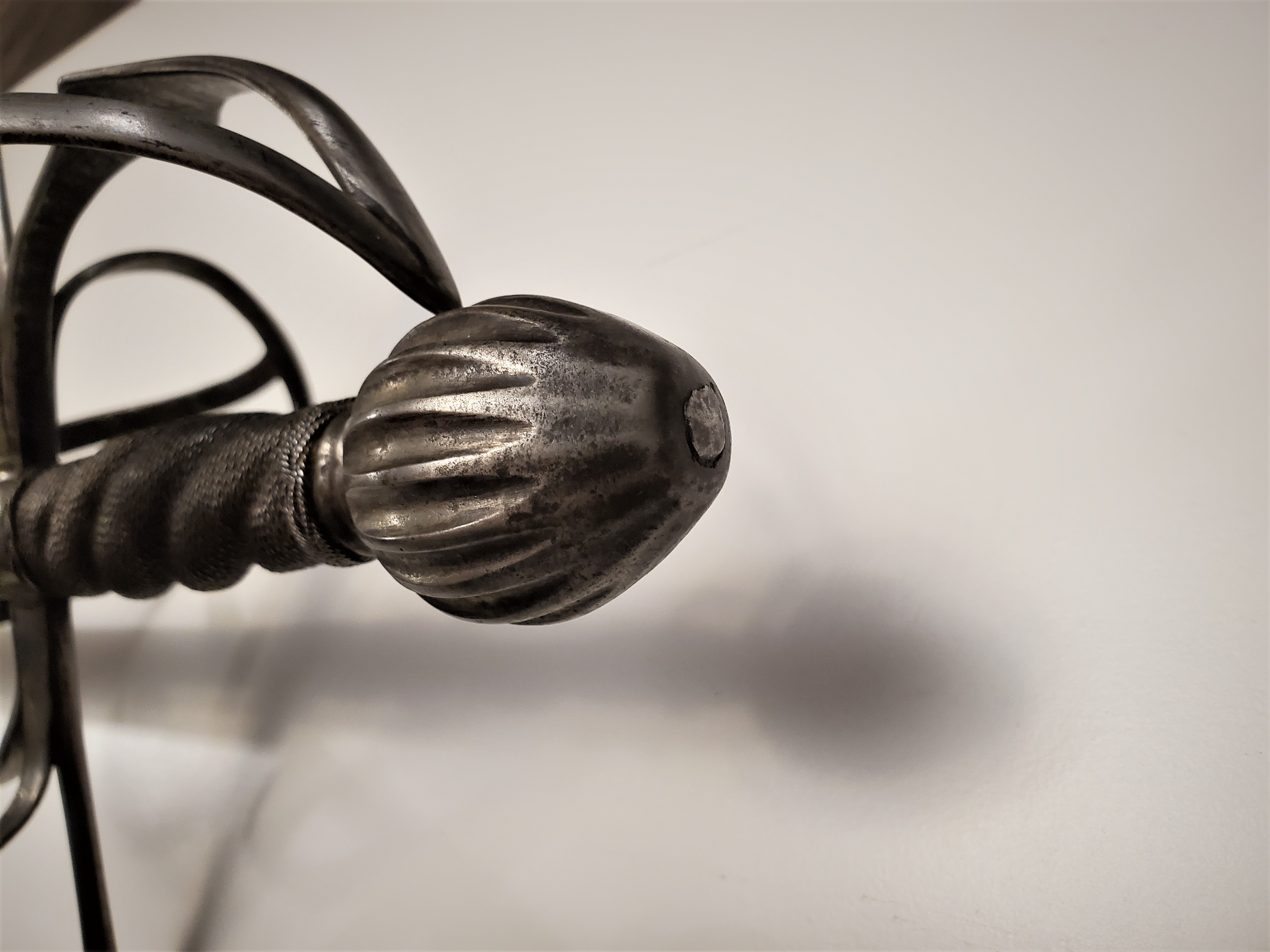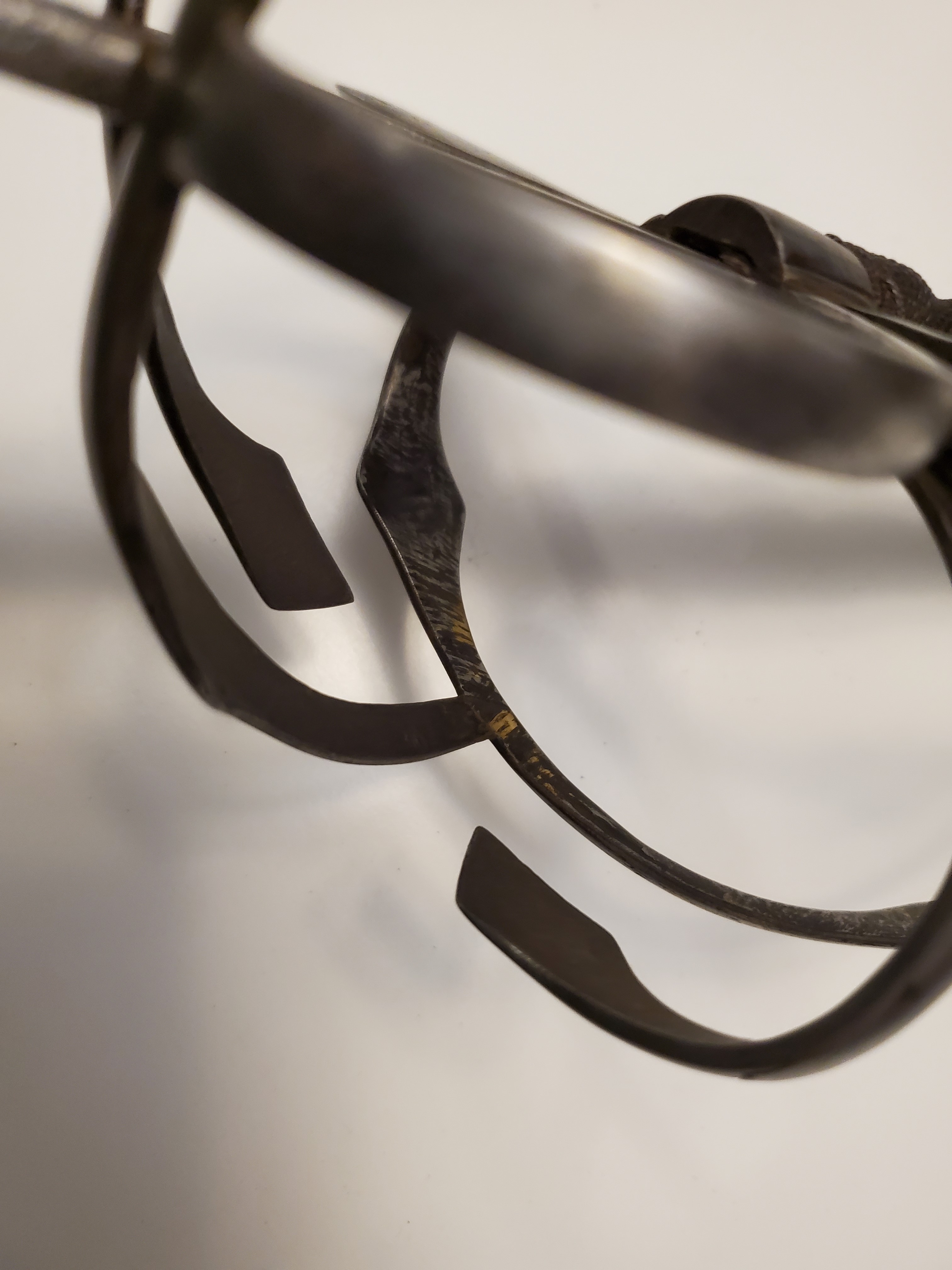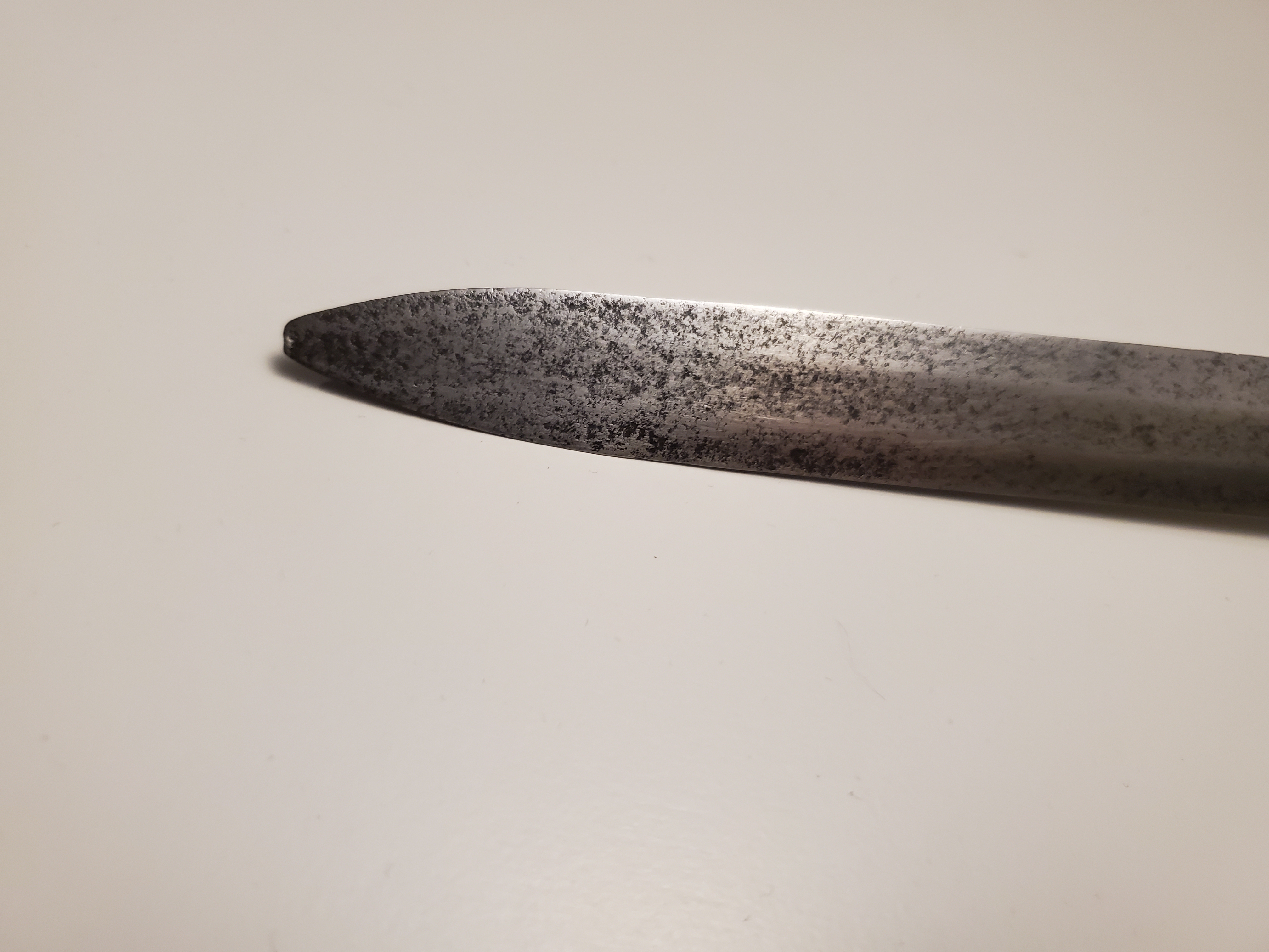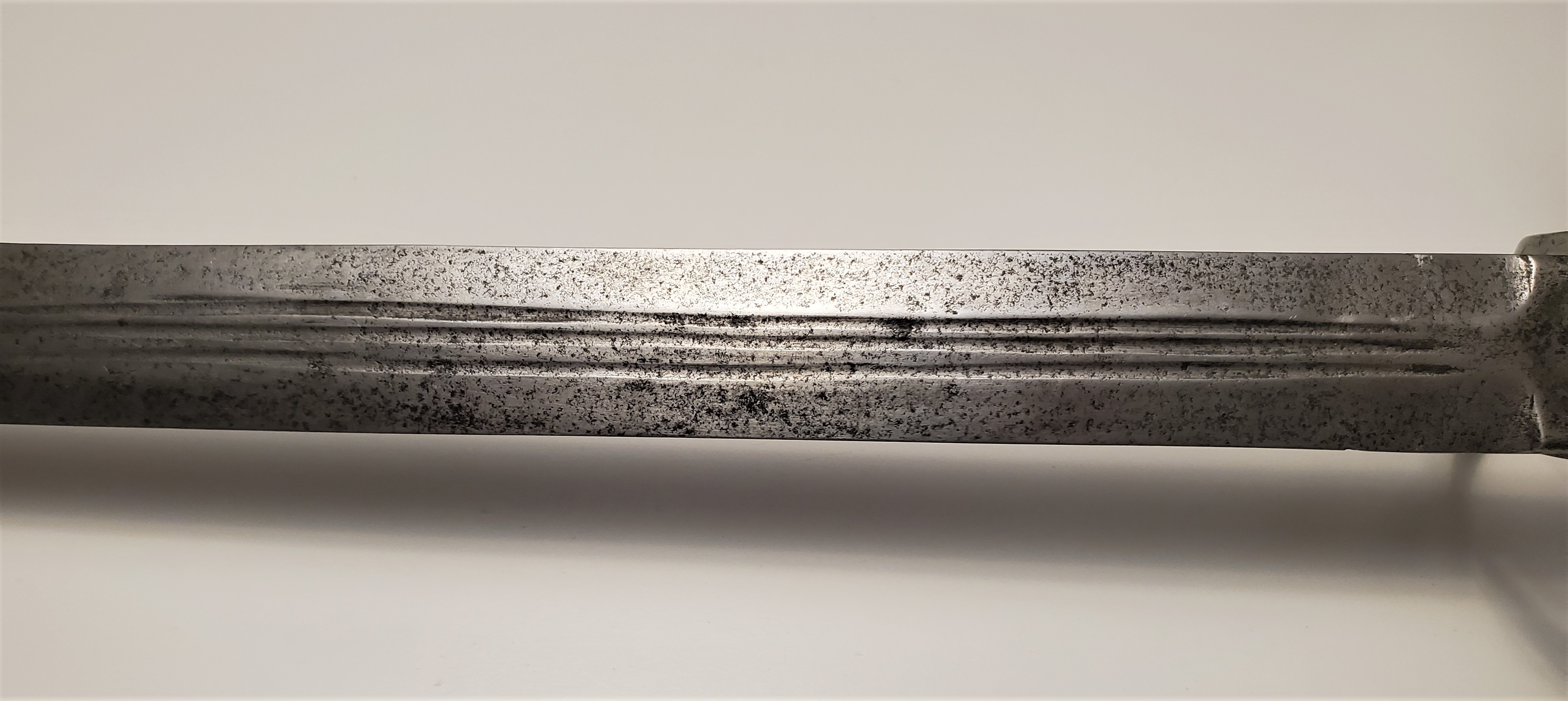 The guard has a rough forge finish on the inside, with file marks, showing that it was probably meant has a soldier sidearm. The blade is in good shape for it’s age, with a thorough patination on most of the surface, and was visibly well sharpened during it’s life. It too was visibly meant as a weapon of war first and foremost.