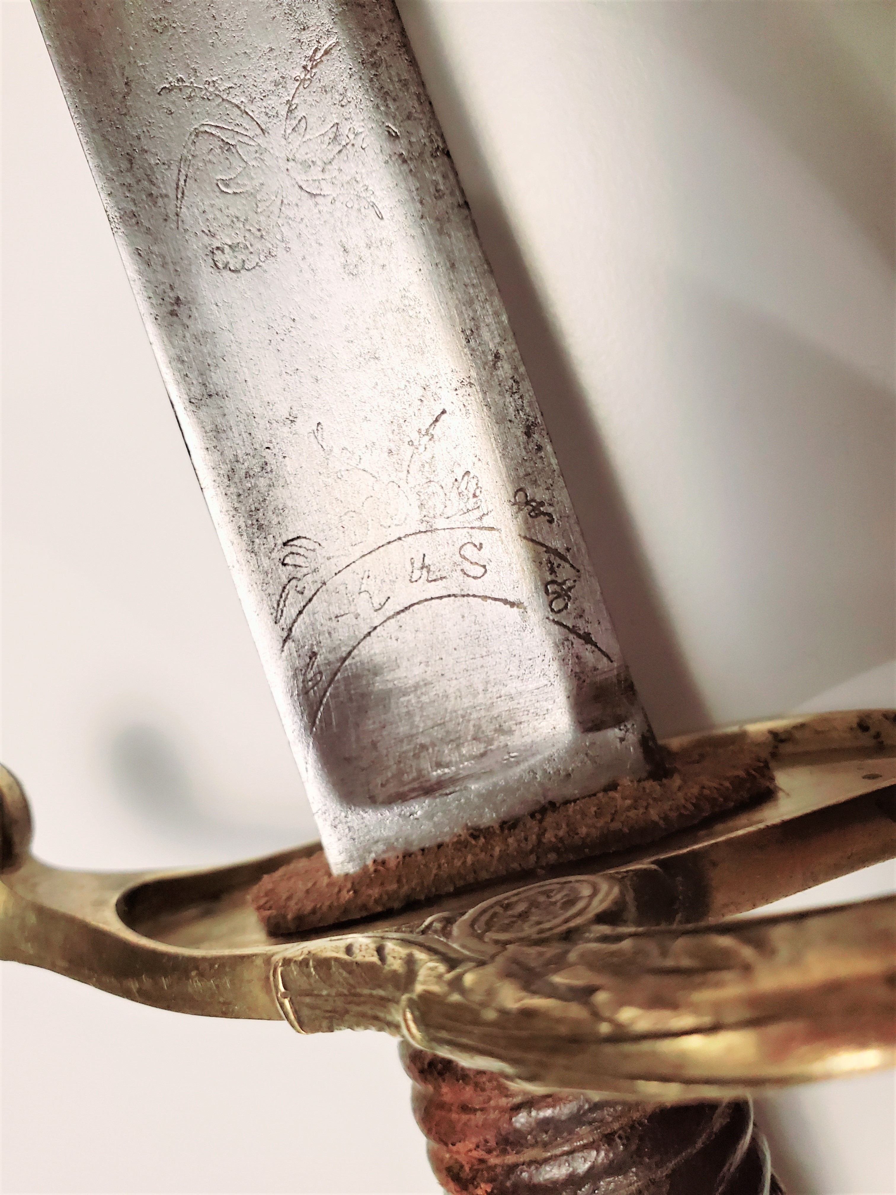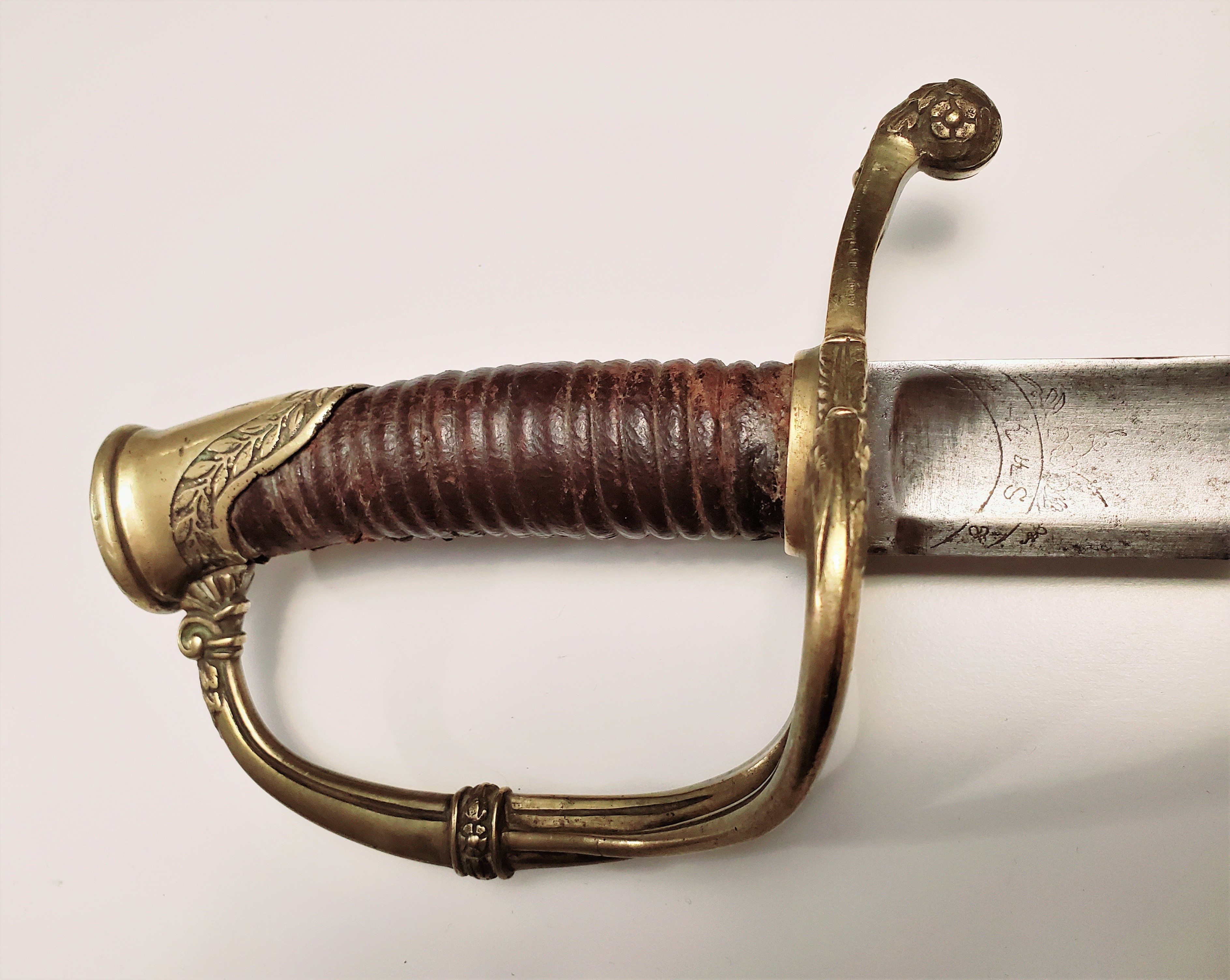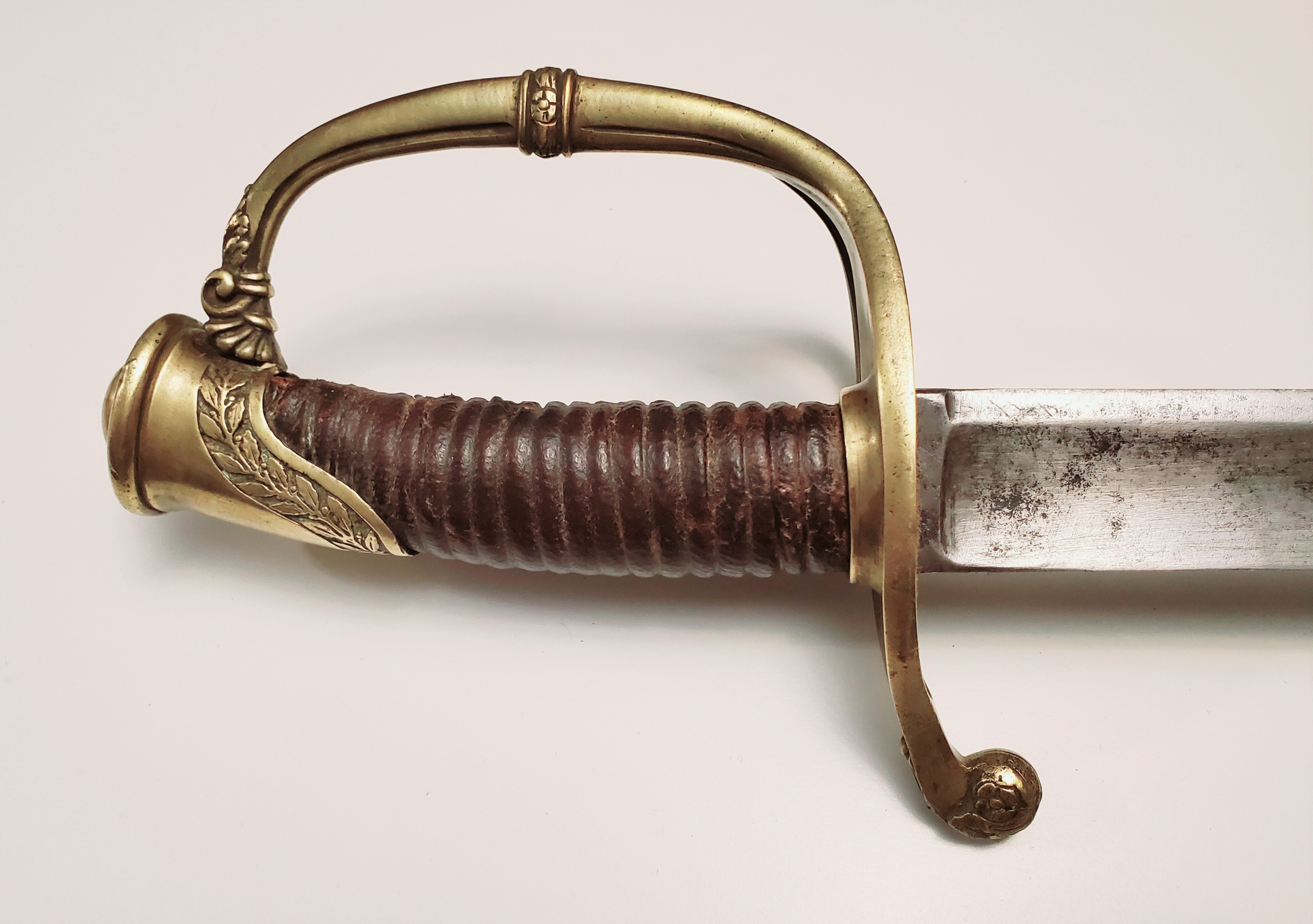 For sale, a clean example of the 1821 infantry officer sabre, in use from 1821 to 1845 in the French standing army, and until 1870 in the French National Guard. This sabre has probably been rehitled at some point in it’s life, and the leather on the grip was possibly changed. The blade is German made, and still shows most of the original engravings. The hilt is nicely detailed, which hints at the fact that it was probably a high quality sabre