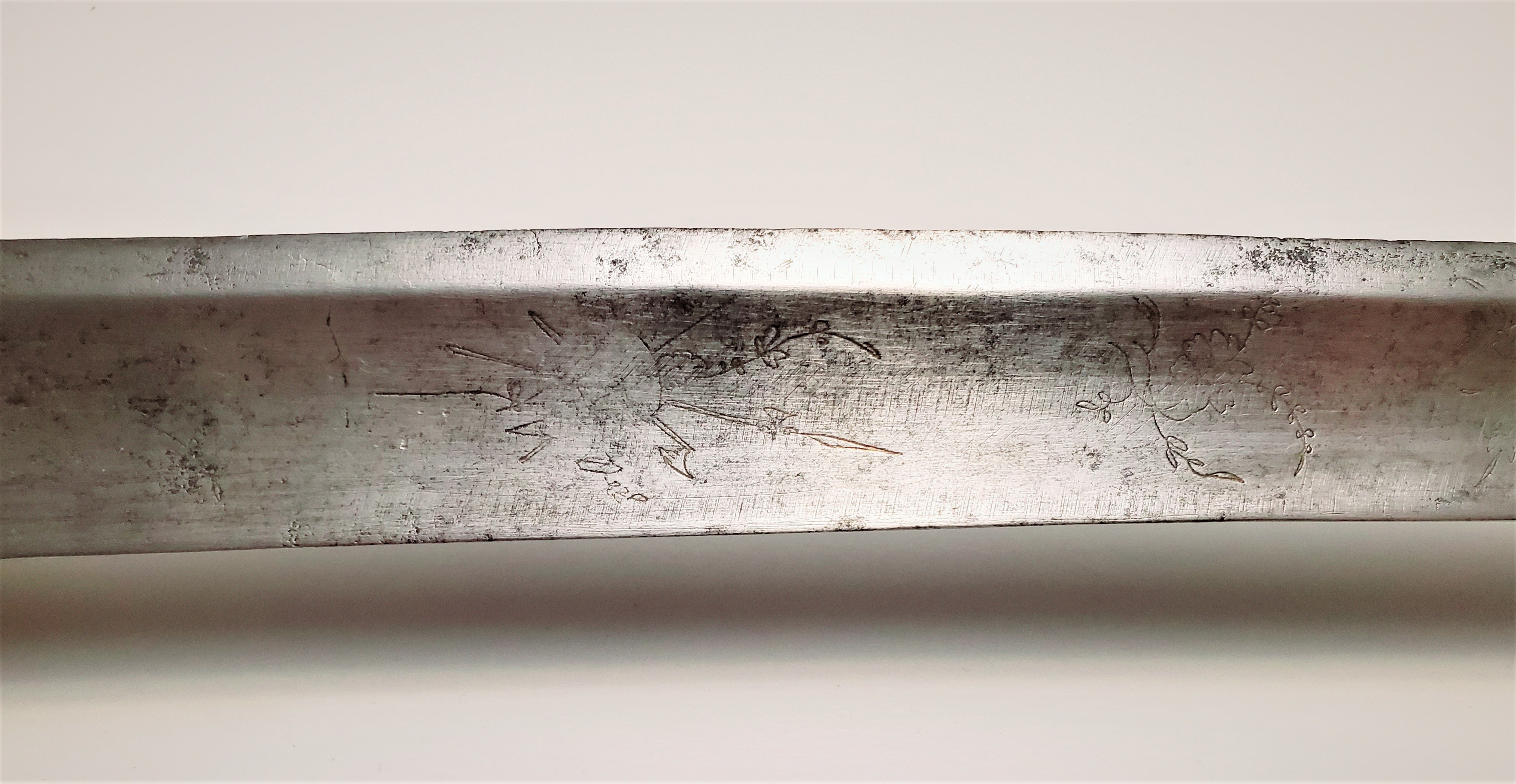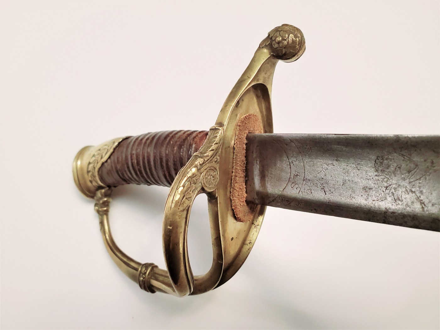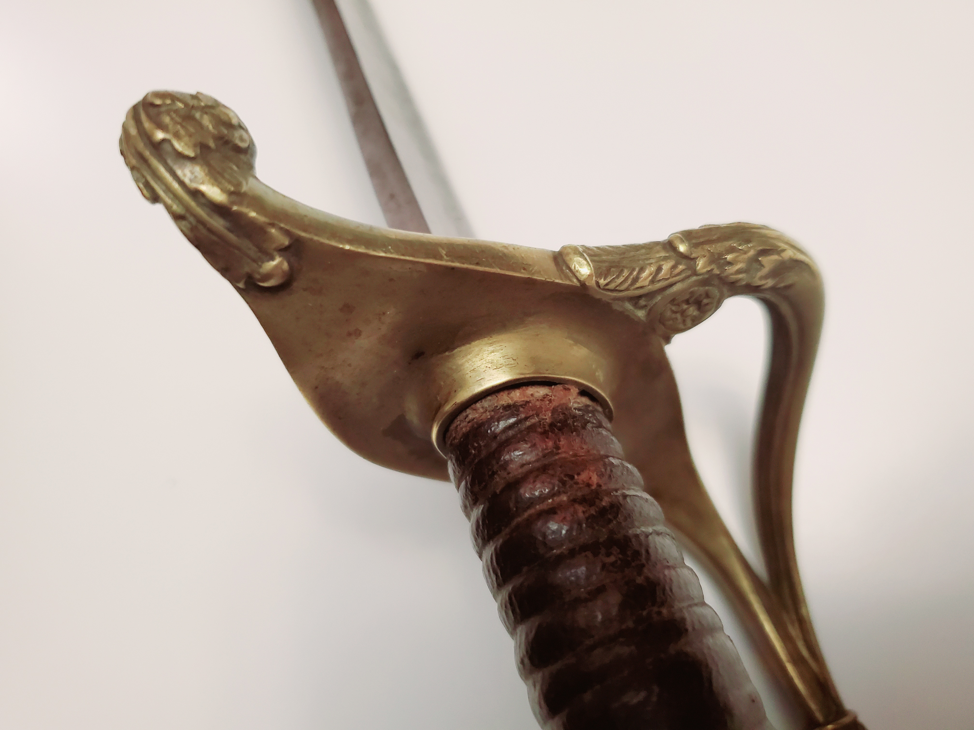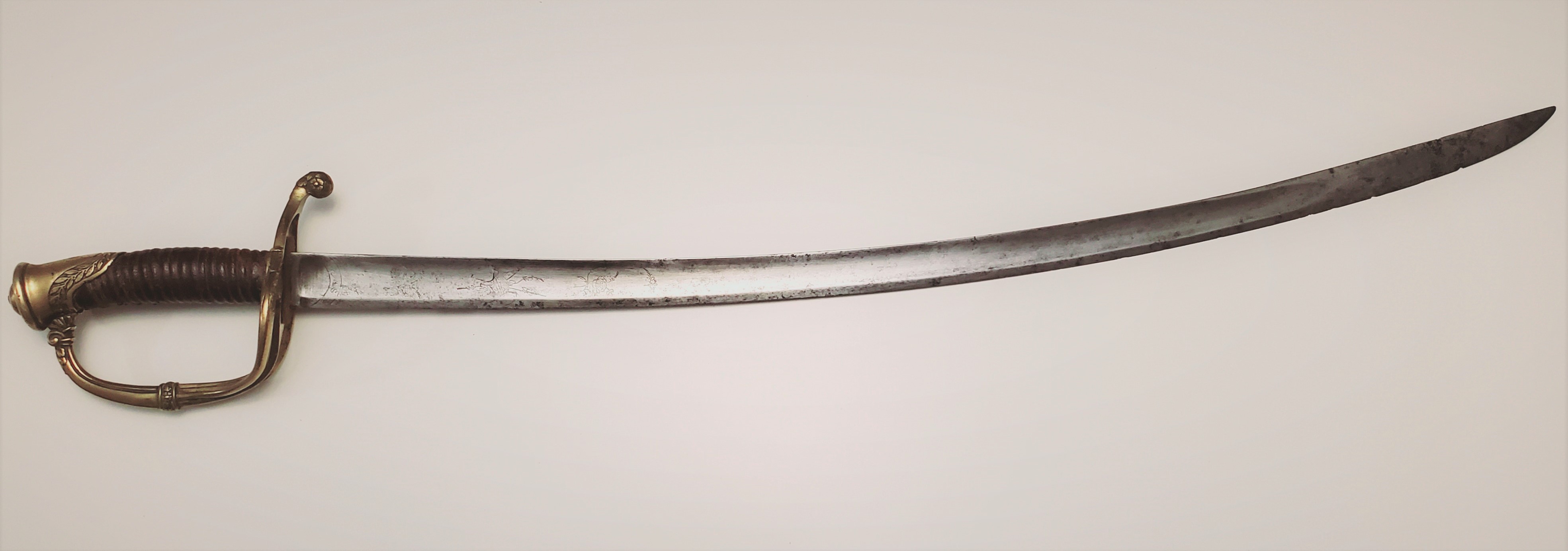 For sale, a clean example of the 1821 infantry officer sabre, in use from 1821 to 1845 in the French standing army, and until 1870 in the French National Guard. This sabre has probably been rehitled at some point in it’s life, and the leather on the grip was possibly changed. The blade is German made, and still shows most of the original engravings. The hilt is nicely detailed, which hints at the fact that it was probably a high quality sabre