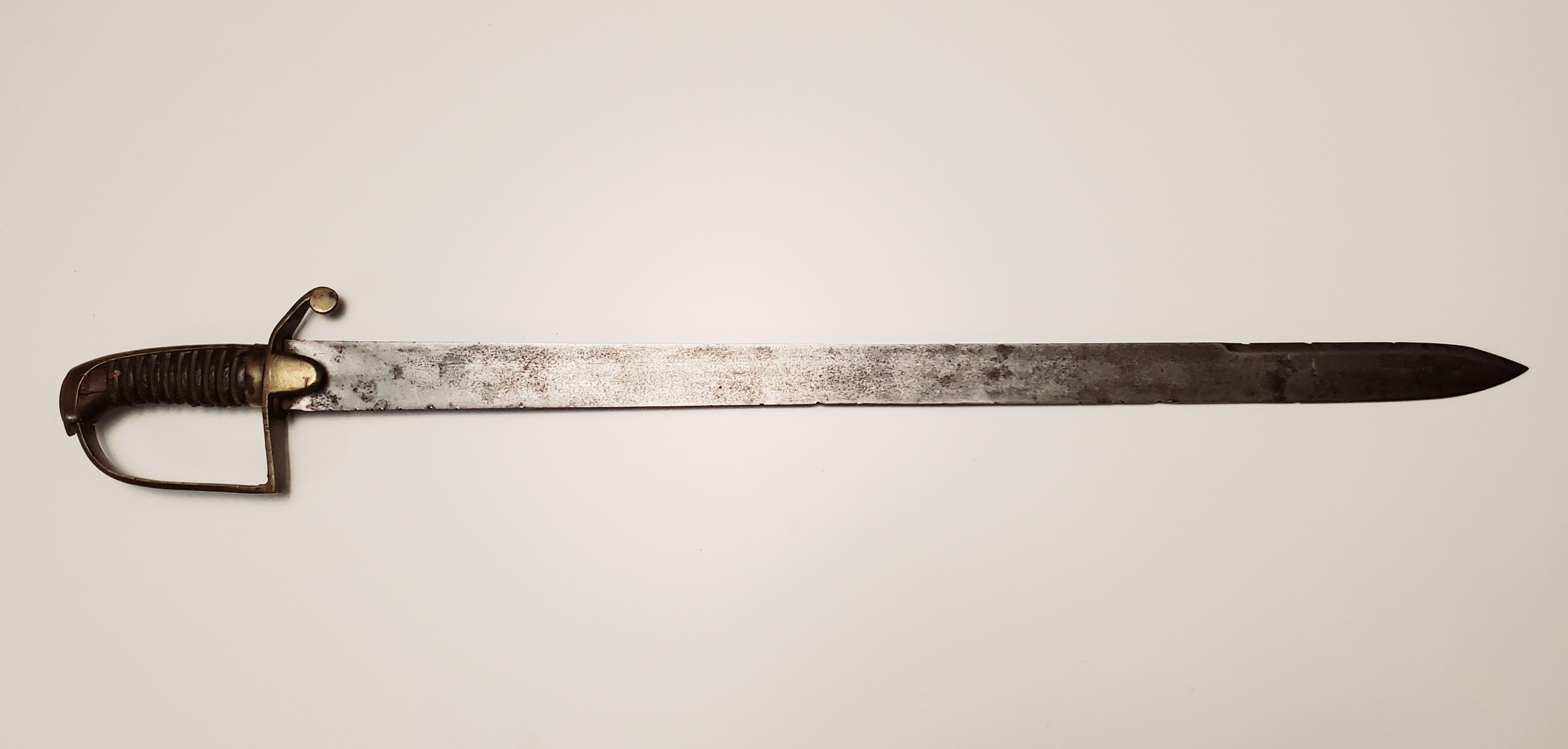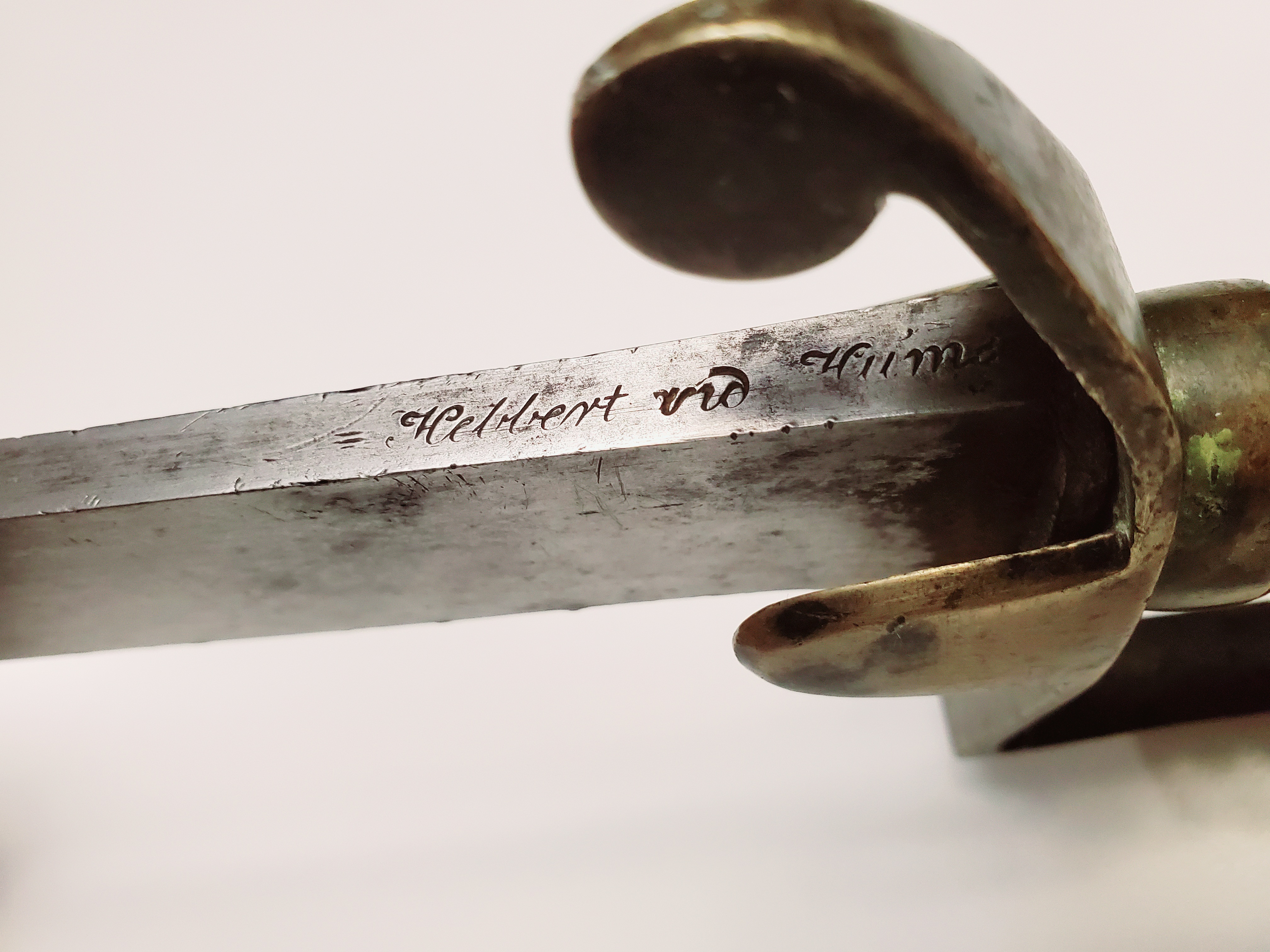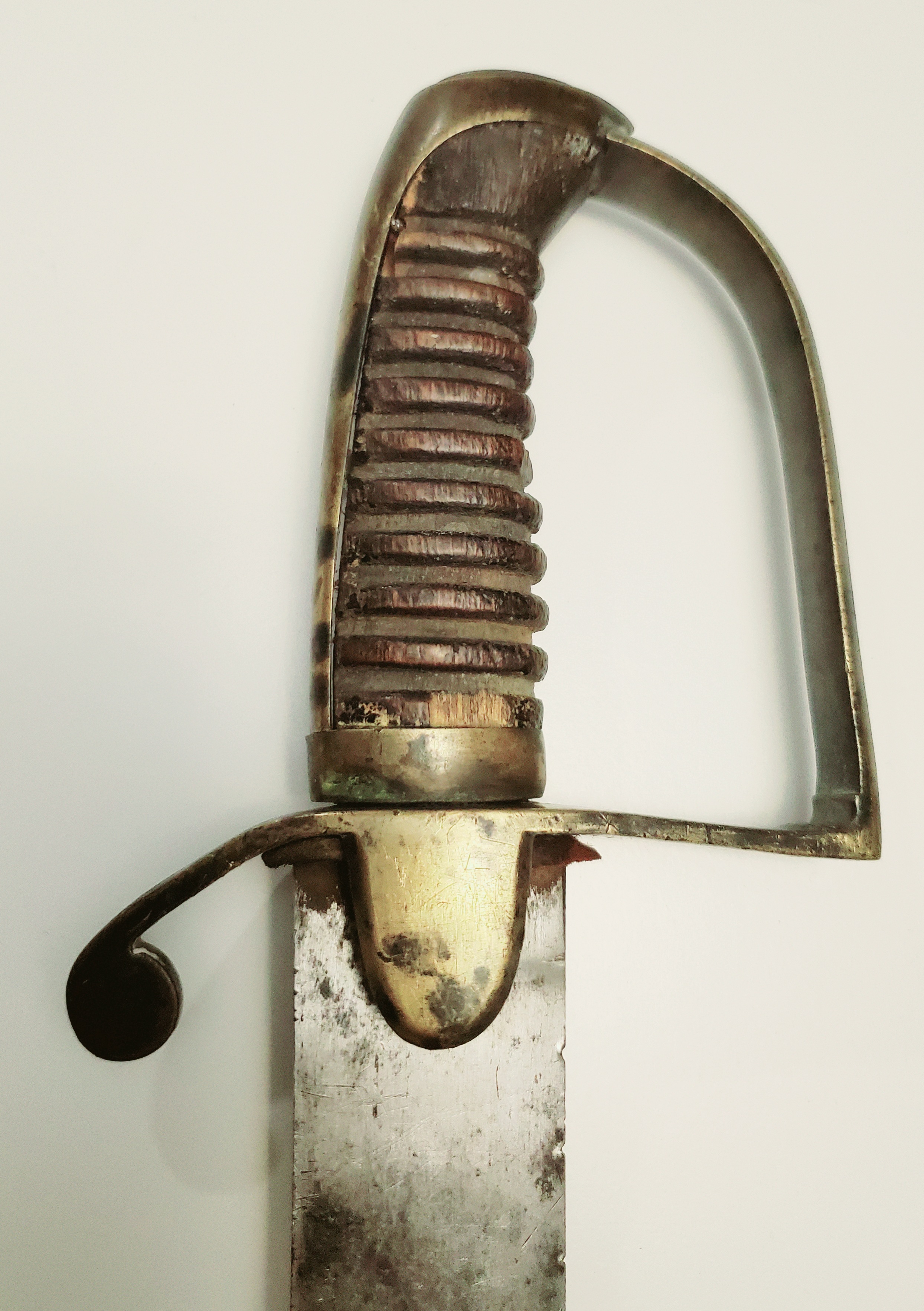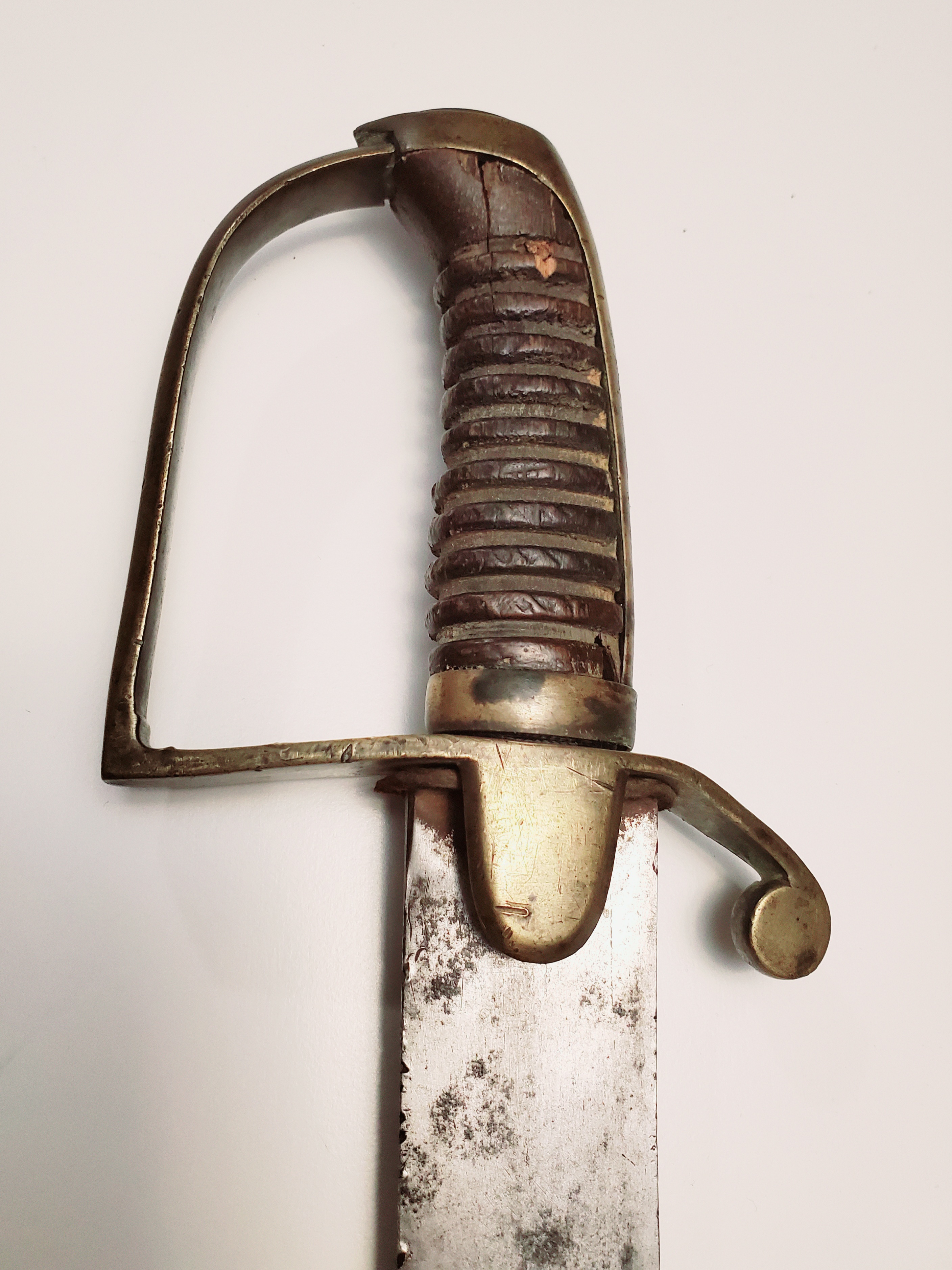 This example has had a full life. The leather on the grip is gone, but the hilt is in fair shape, with a nail that was inserted in it. The blade has seen some repair to the edge and is now quite blunt. The rest is in rather very good shape, and the signature of the maker, Hebbert and Hume, is very crisp. The company was active from 1814 to 1829.