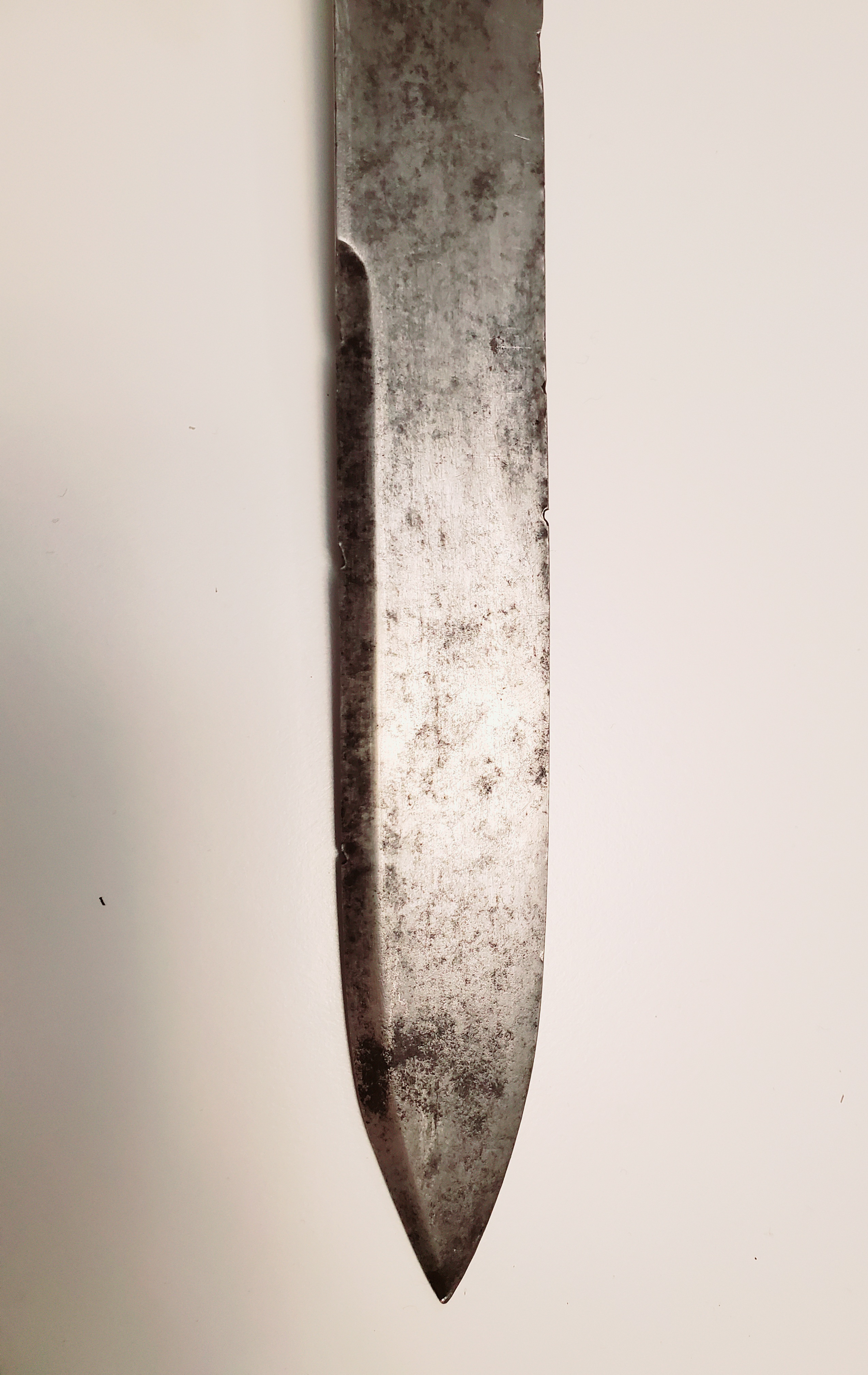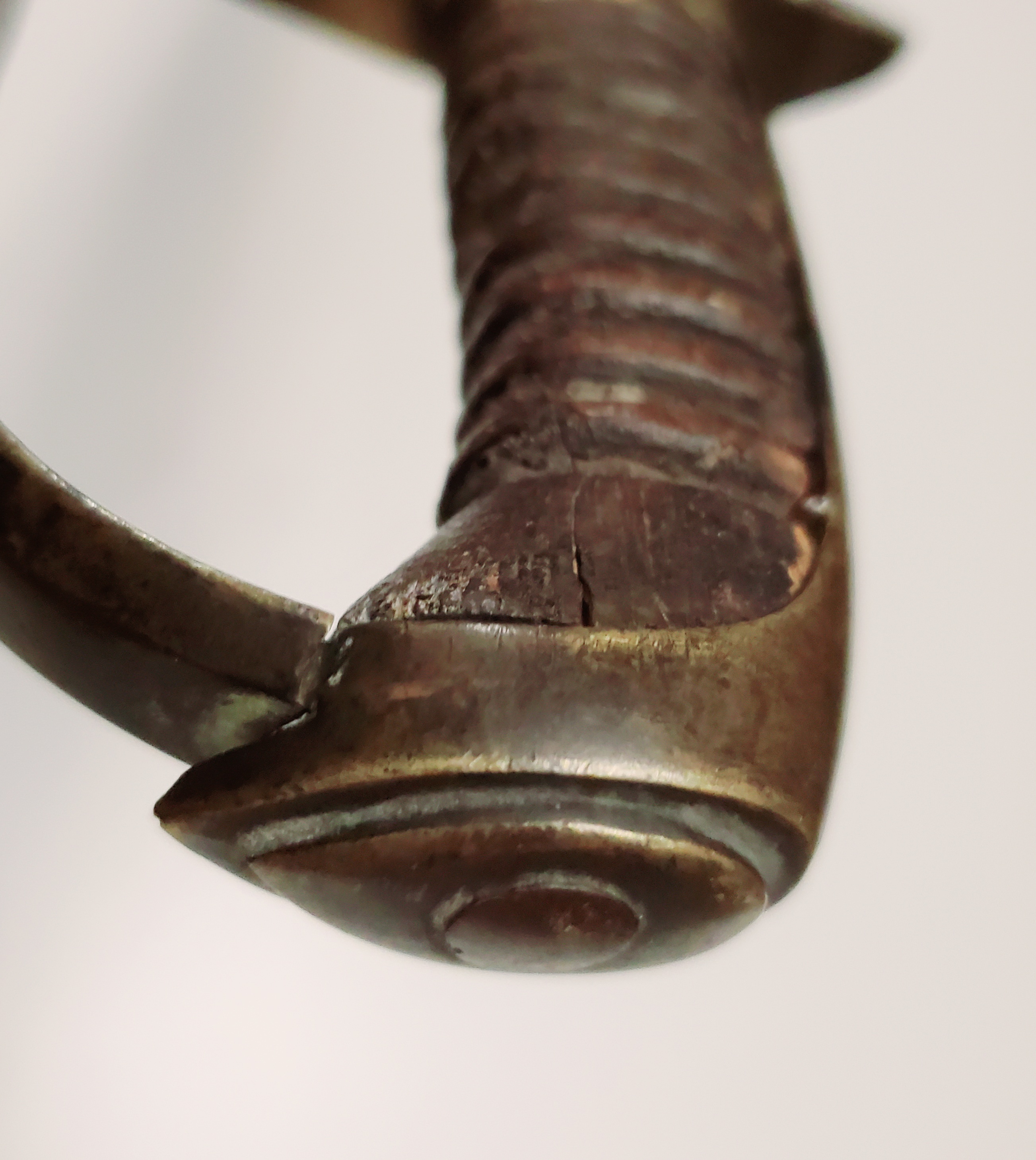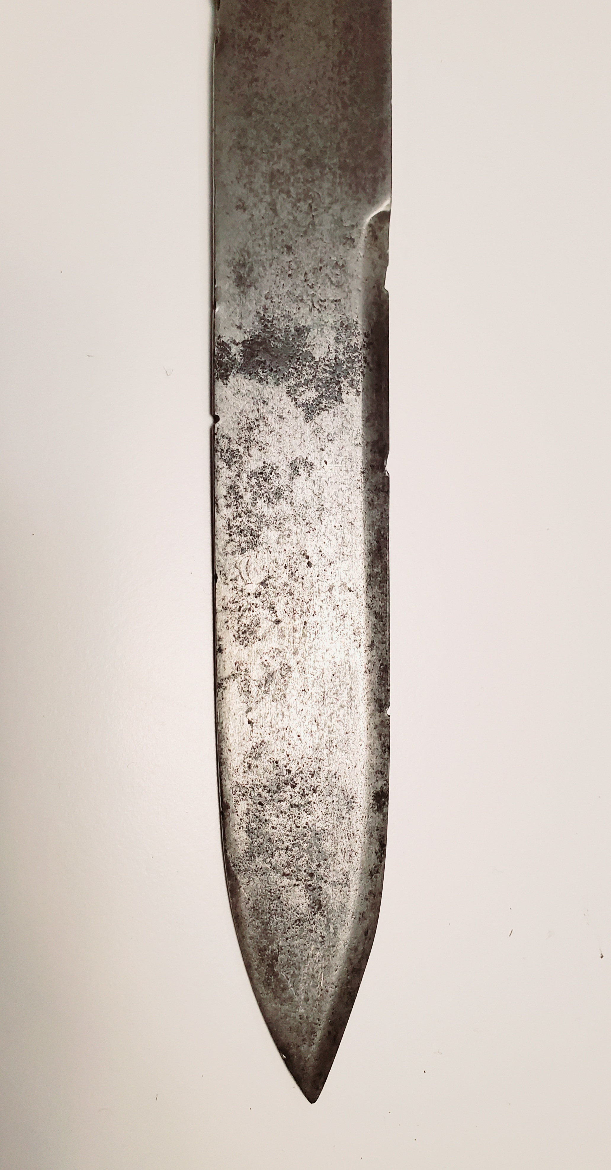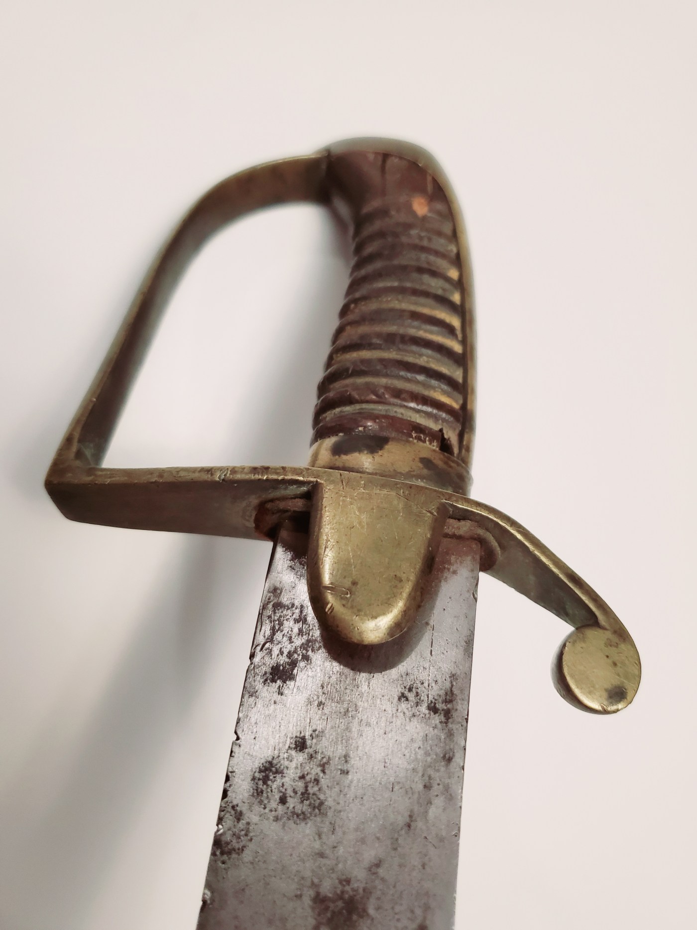 This example has had a full life. The leather on the grip is gone, but the hilt is in fair shape, with a nail that was inserted in it. The blade has seen some repair to the edge and is now quite blunt. The rest is in rather very good shape, and the signature of the maker, Hebbert and Hume, is very crisp. The company was active from 1814 to 1829.
