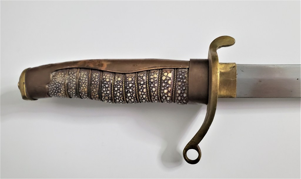 For sale a rare short sword used by police inspectors during the Meiji era in Japan, starting in 1868, as can be seen by the police badge on the backstrap. This sword is in good shape for the age, with no rattling. The spring latch on the cabbard functions very well. The pommel cap usually has a hole in which the fit the sword knot, though this one was filled down, possibly to for a new regulation.