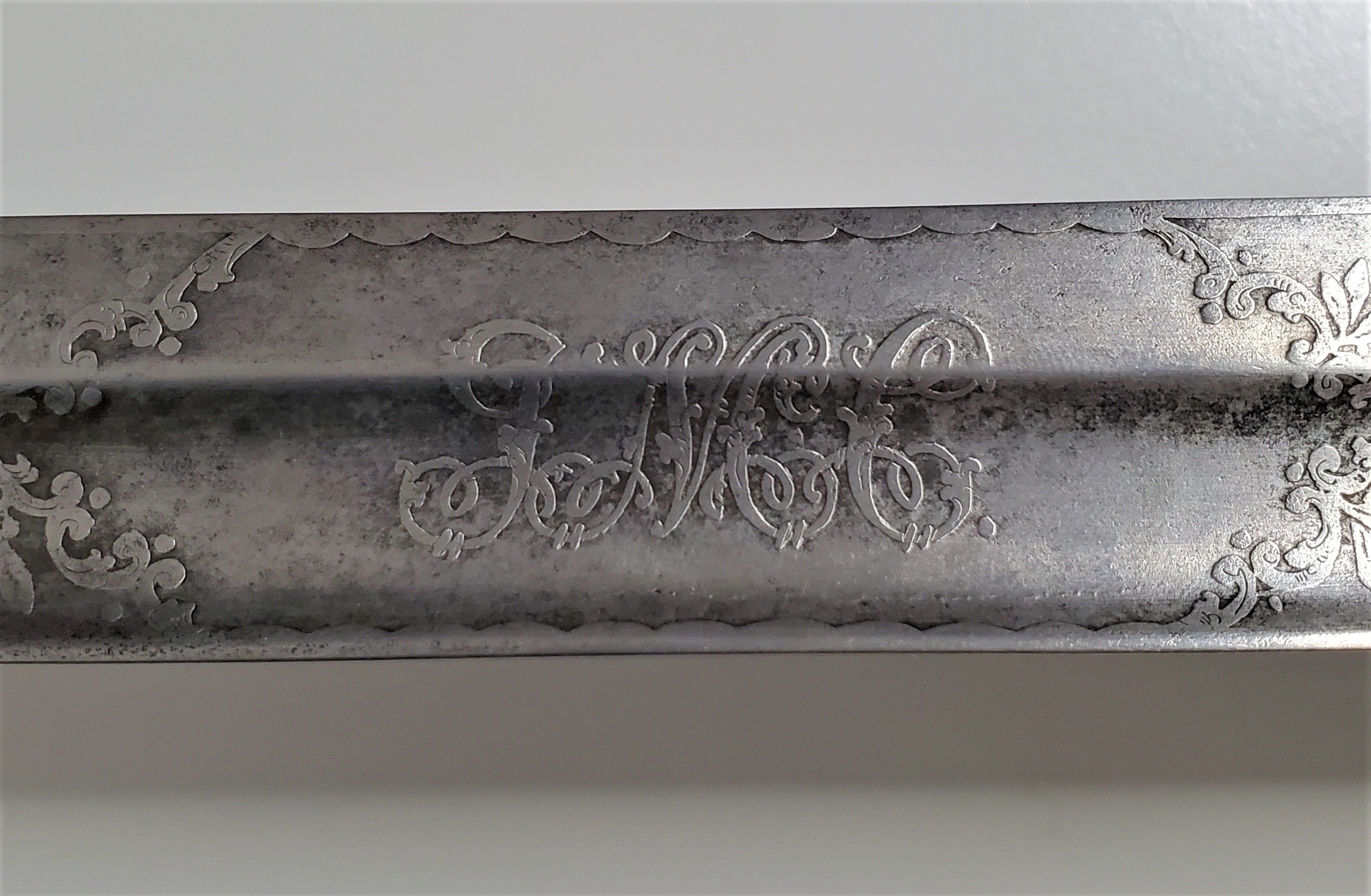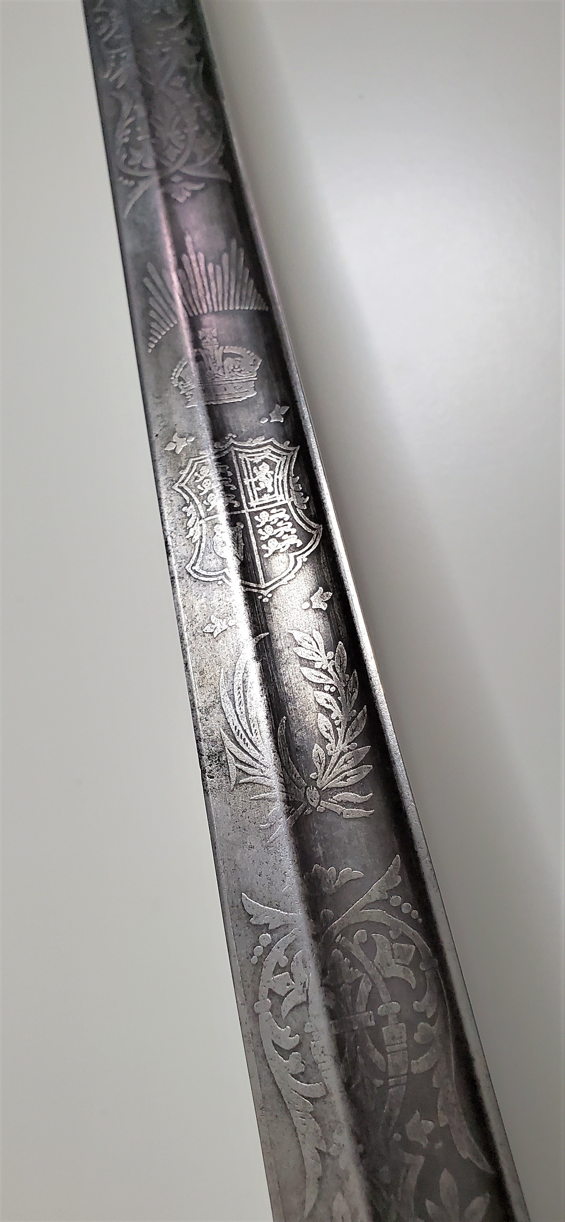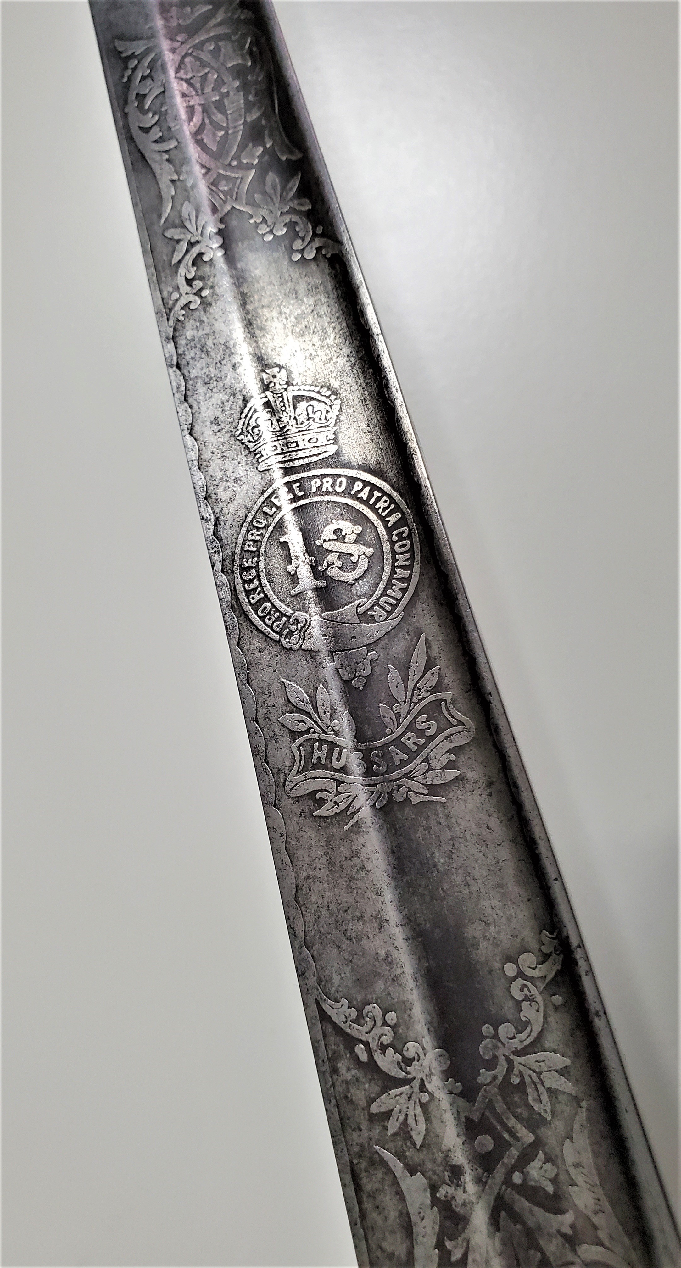 This sword was sold after his return to Ireland following the Boer War, so possibly as an homecoming gift. It was service sharpened, probably for WW1. The blade bears the crest of the 18th hussars, as well as McClintock’s initials.