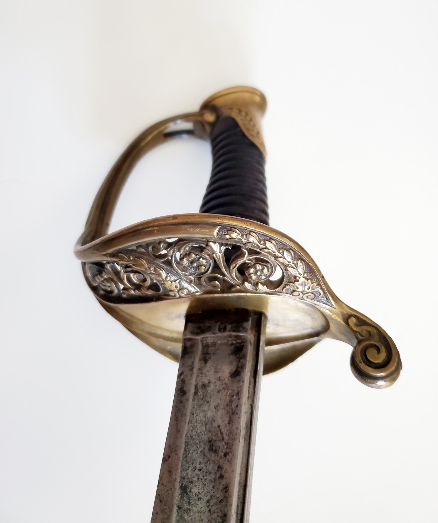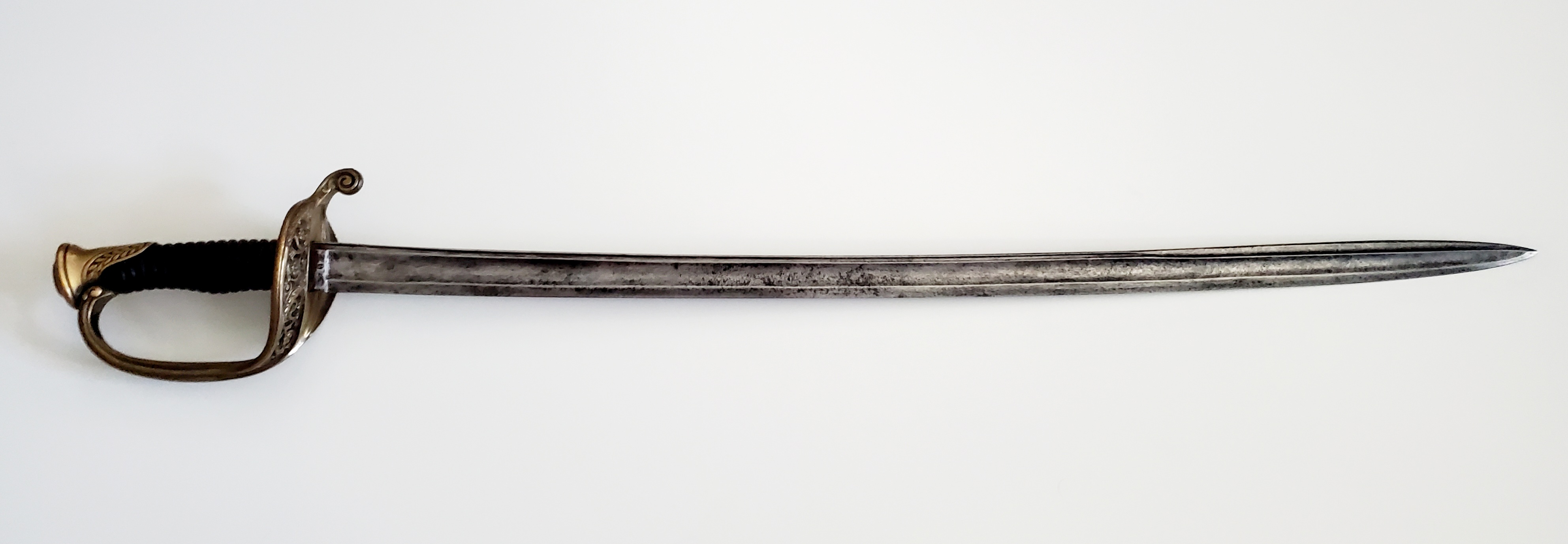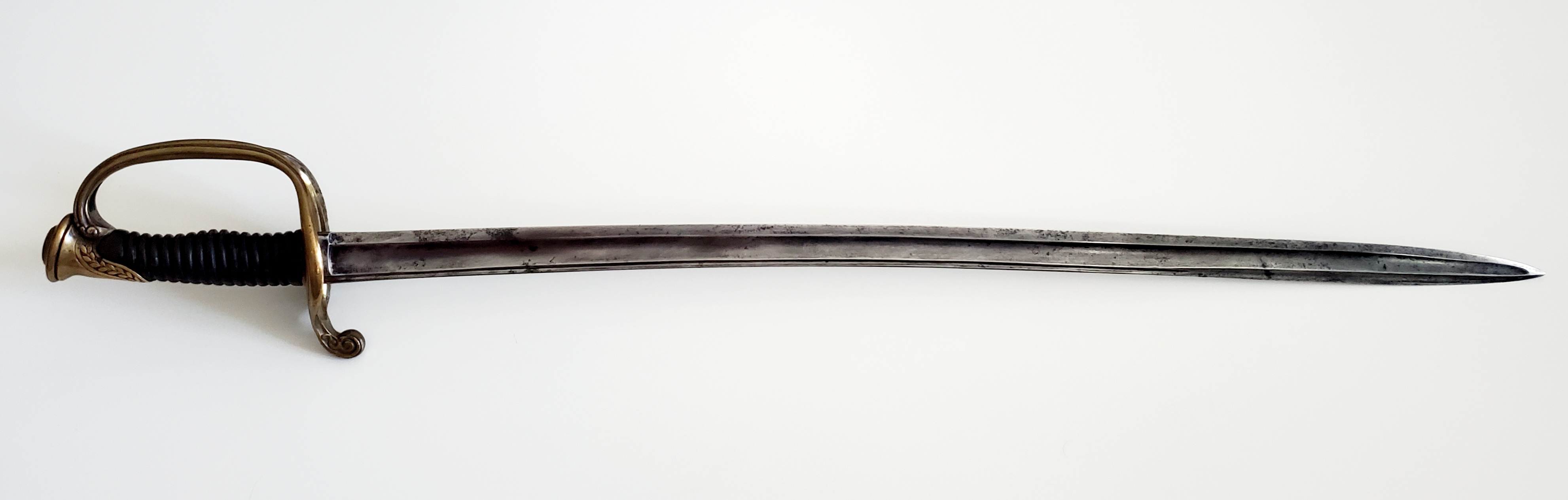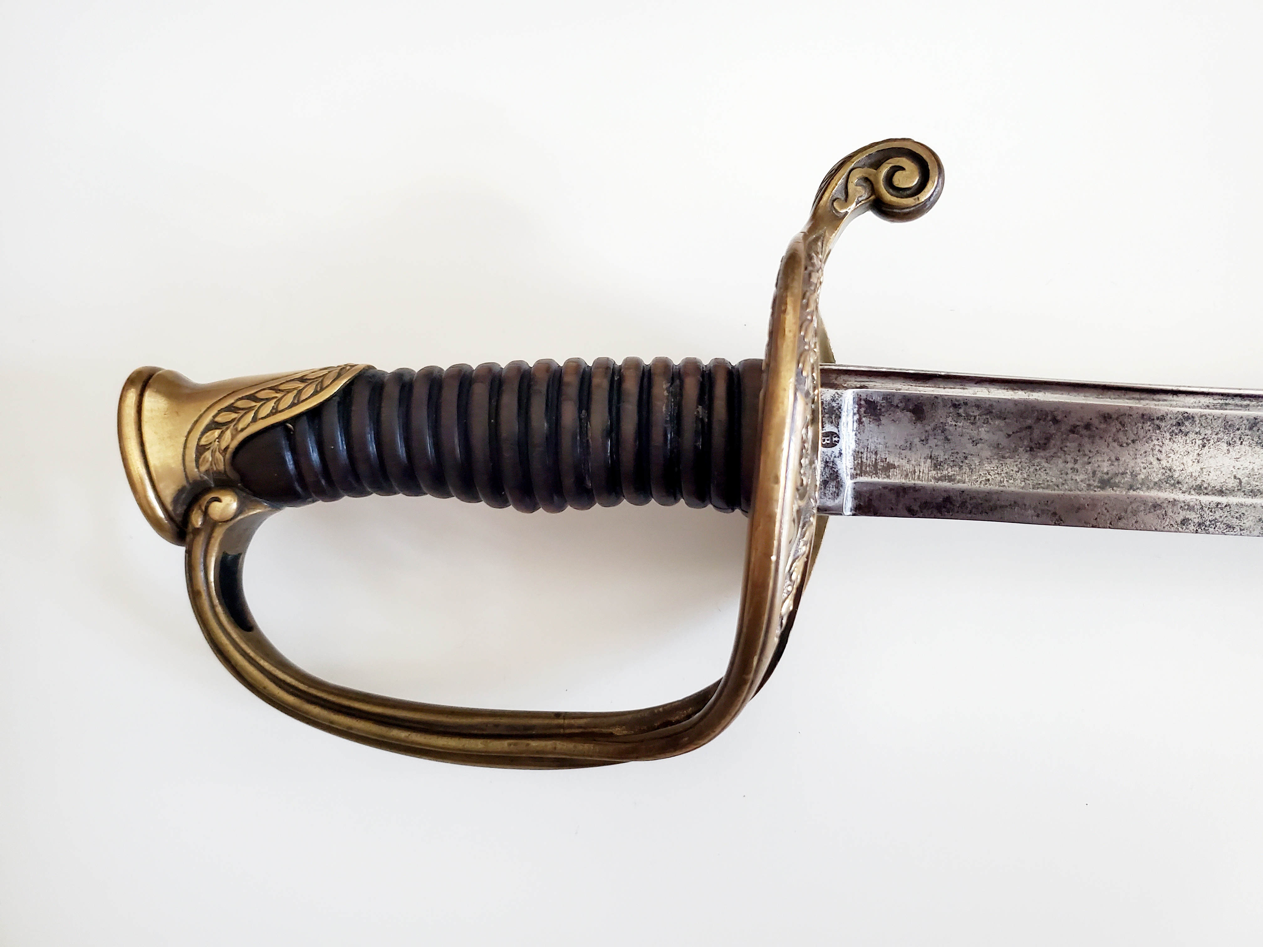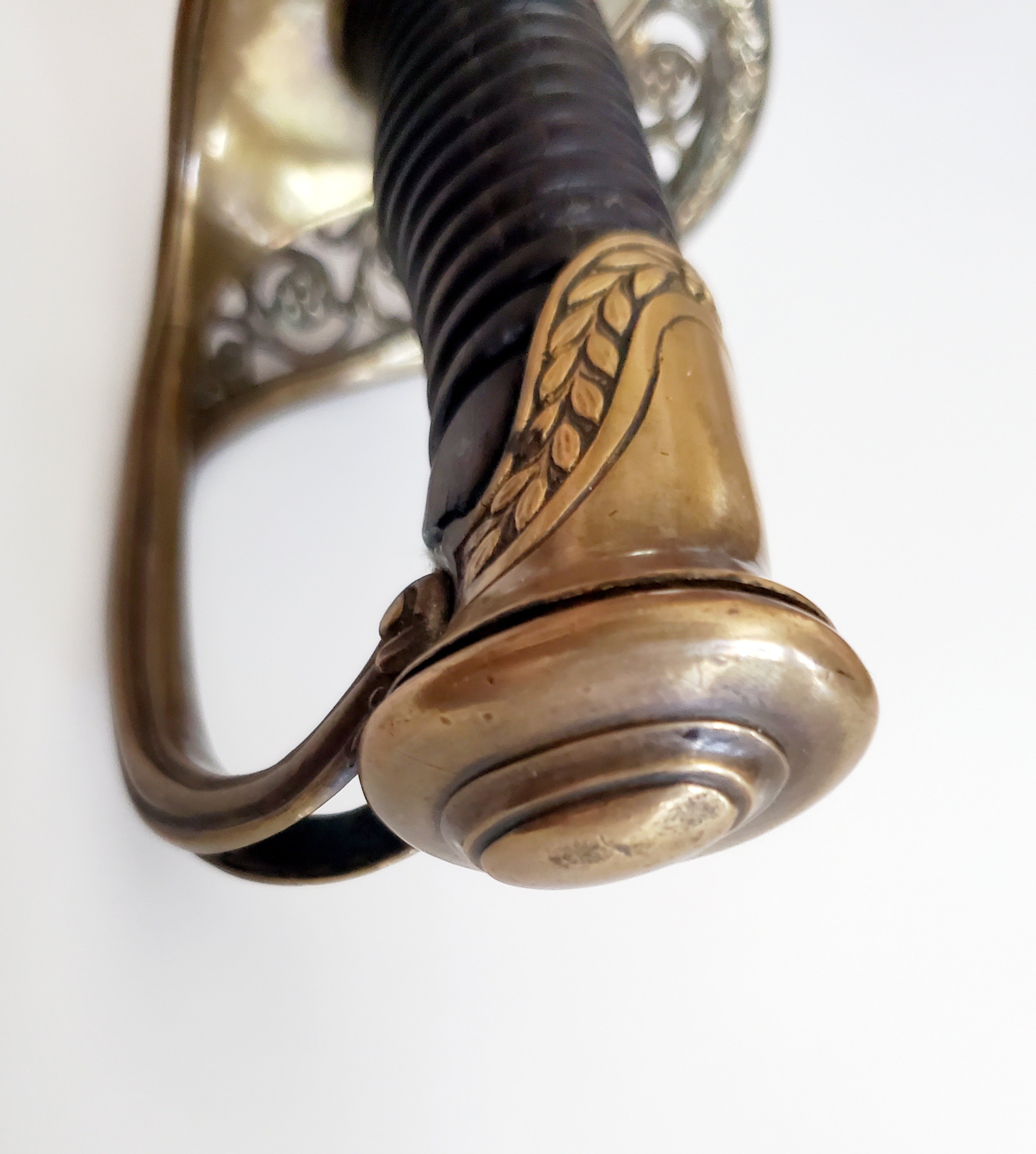 For sale, a nice example of the classic 1845 sabre. This one has a peculiarity seen in the early days of the model, which is a removable pommel cap. The cap is held in place by a peg that goes in the grip, while the peen is hidden underneath.