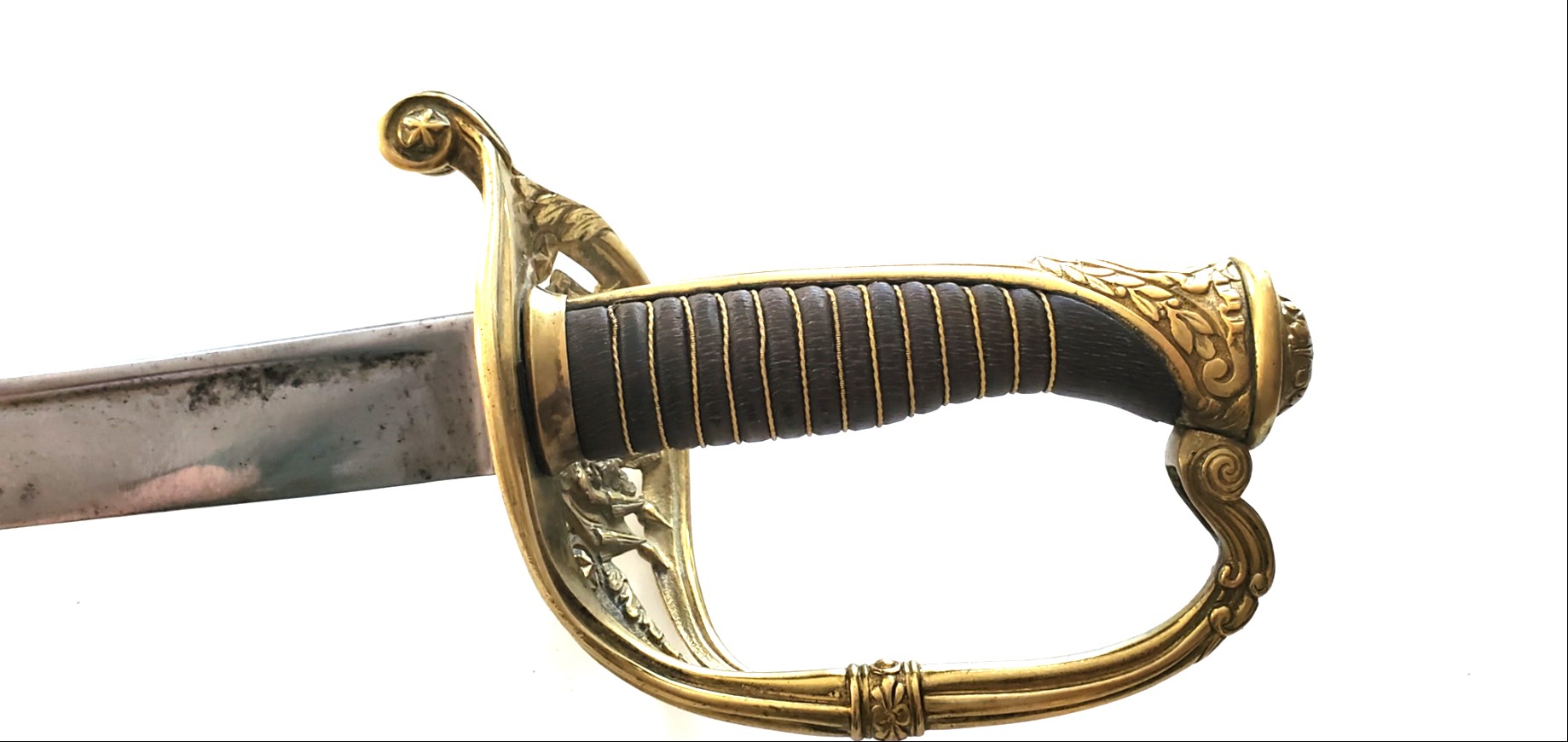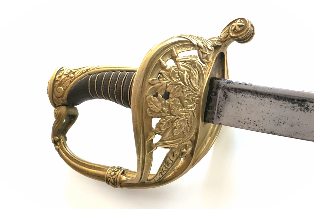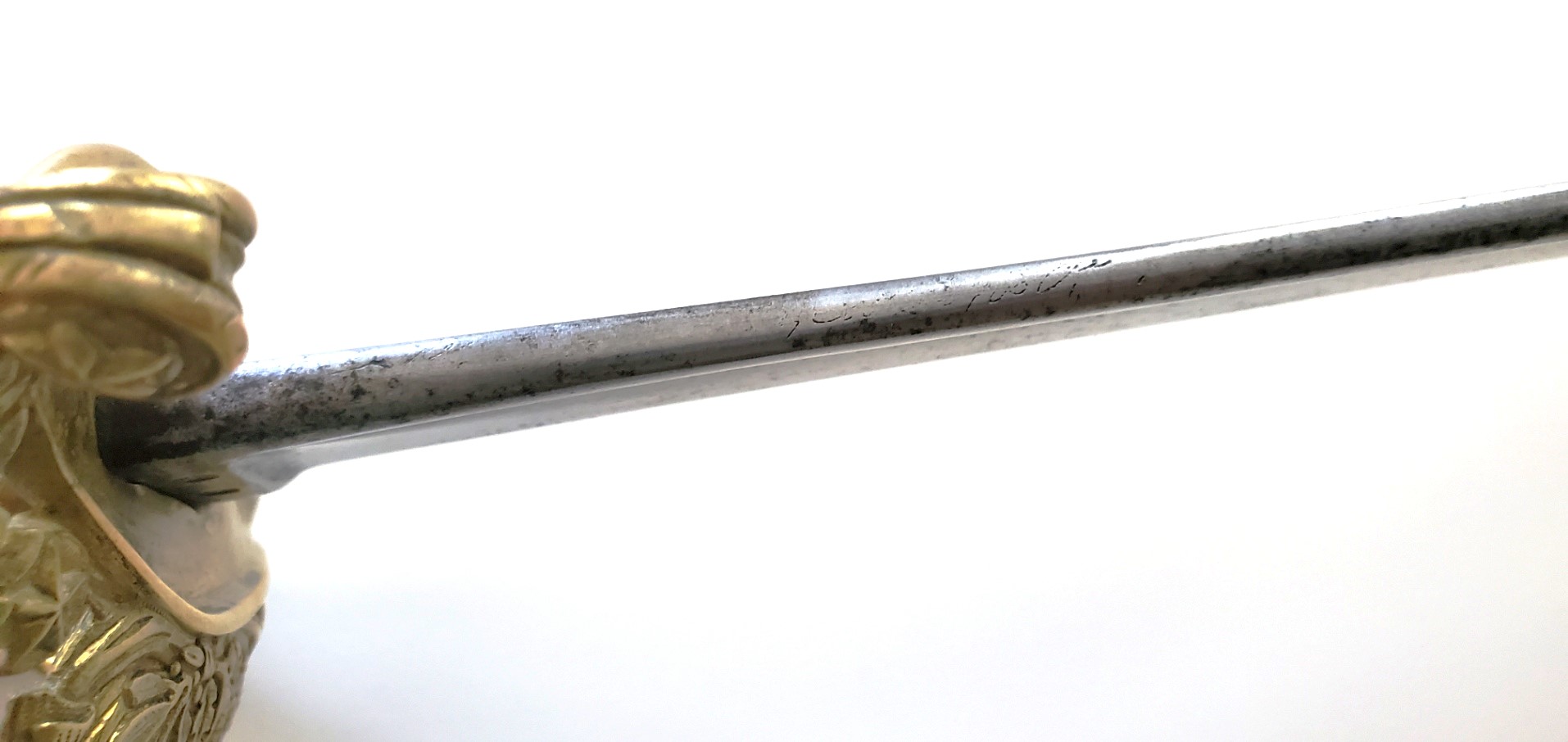 The hilt is of a high quality make, as can be seen from the detailed work on both sides of the guard. The blade has some pitting and a rounded point, but the sword is otherwise in great shape and very solid. It does not come with a scabbard.