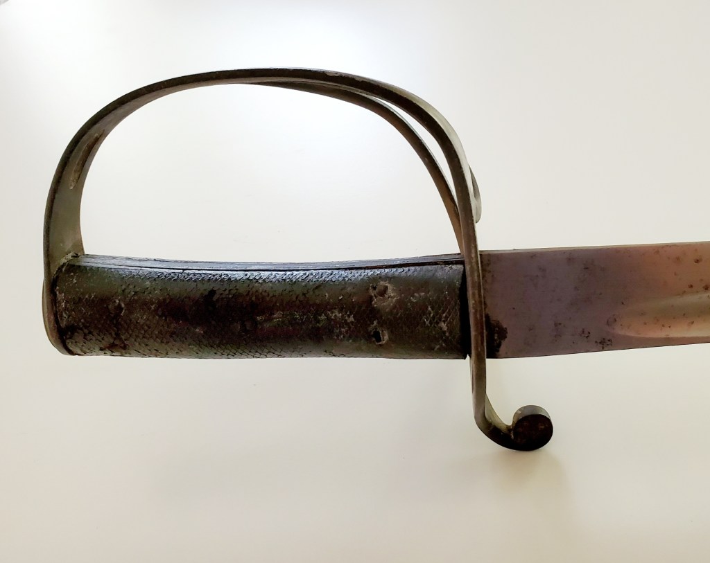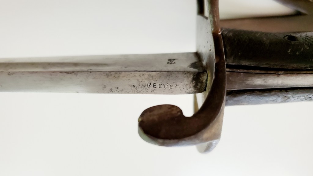 This 1853 has an interesting history, being marked to the Prince Edward Island’s volunteer cavalry. As was often the case for volunteer units in North America, the sword’s scabbard was modified to fit the 1885 pattern configuration. It is not a mismatch, as the 1885 has a different throat piece. This is an 1853 scabbard that had the rings removed and updated. The scabbard is the only one that is unit marked, while the sword is marked to Reeves with inspector marking.