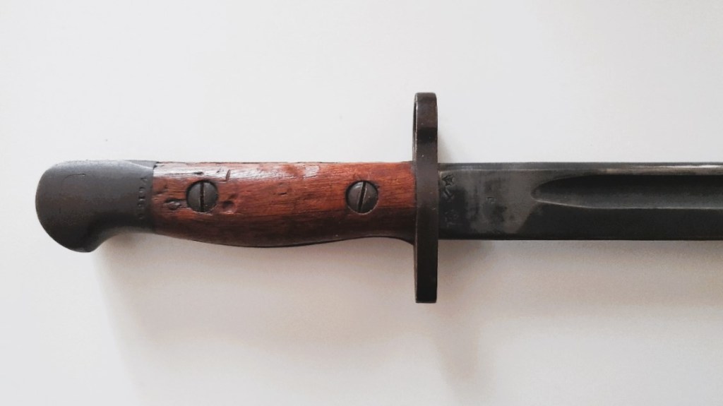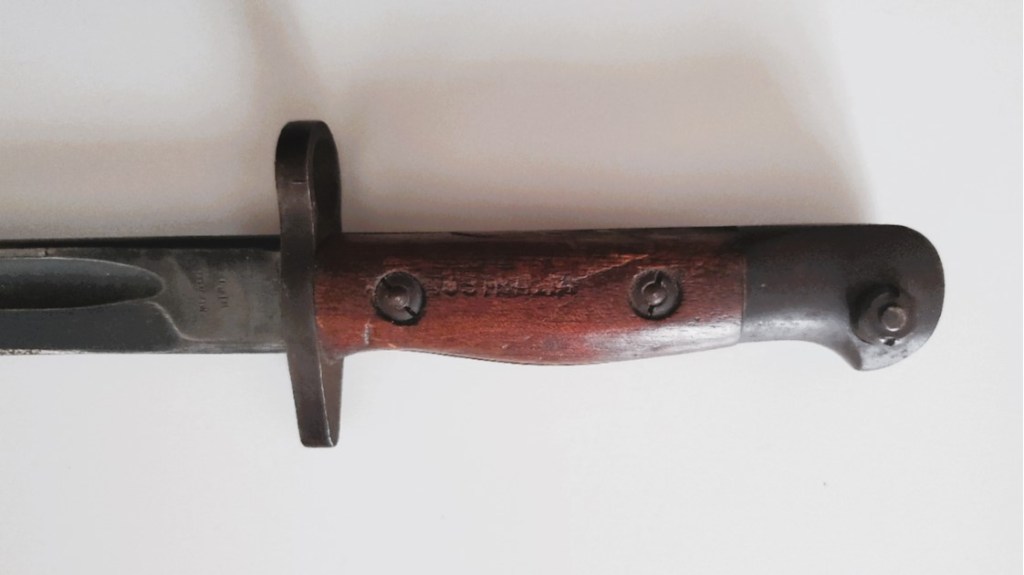 This sword bayonet was made to be used with the Lee-Enfield no.1 MkIII rifle, which was used during WW1 and WW2. This specific one was made in 1918 at Lithgow, while the scabbard was made in 1943 by Mangrovite and SAF-3, Orange.