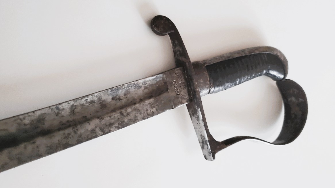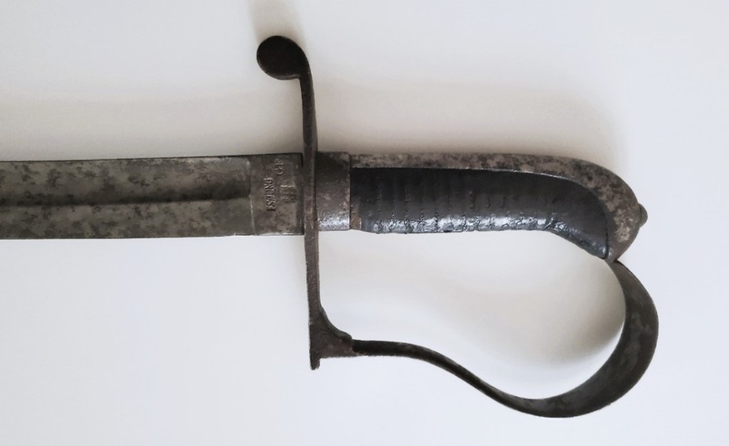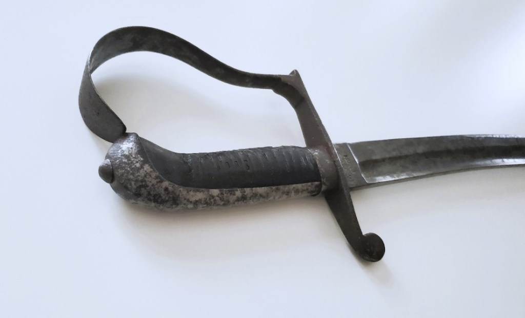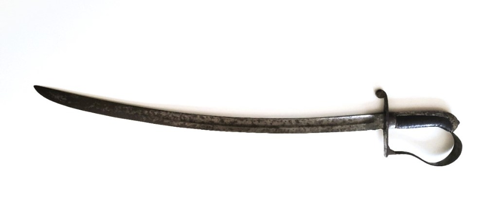 It’s a fairly light sabre, but with probably one of the most impressively curved stirrup hilts. The blade was service sharpened, and the hilt is tight. The blade and hilt have some stable corrosion, which could clean off nicely. A good restoration project