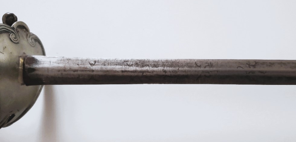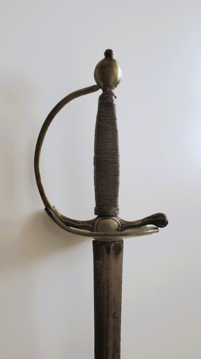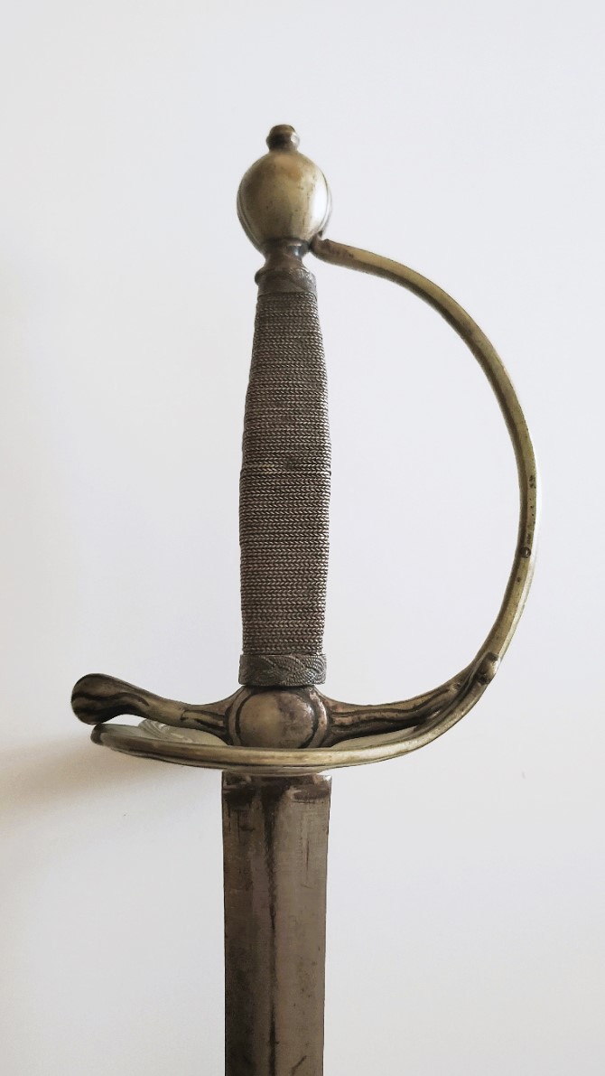 As is usual for this model, the hilt is silver plated brass, with a silver wire grip. The blades are varied, and this one has a flat blade often encountered on the 1767 infantry officer model. Such blades are sometimes found marked to the Luxembourg regiment of bodyguards.