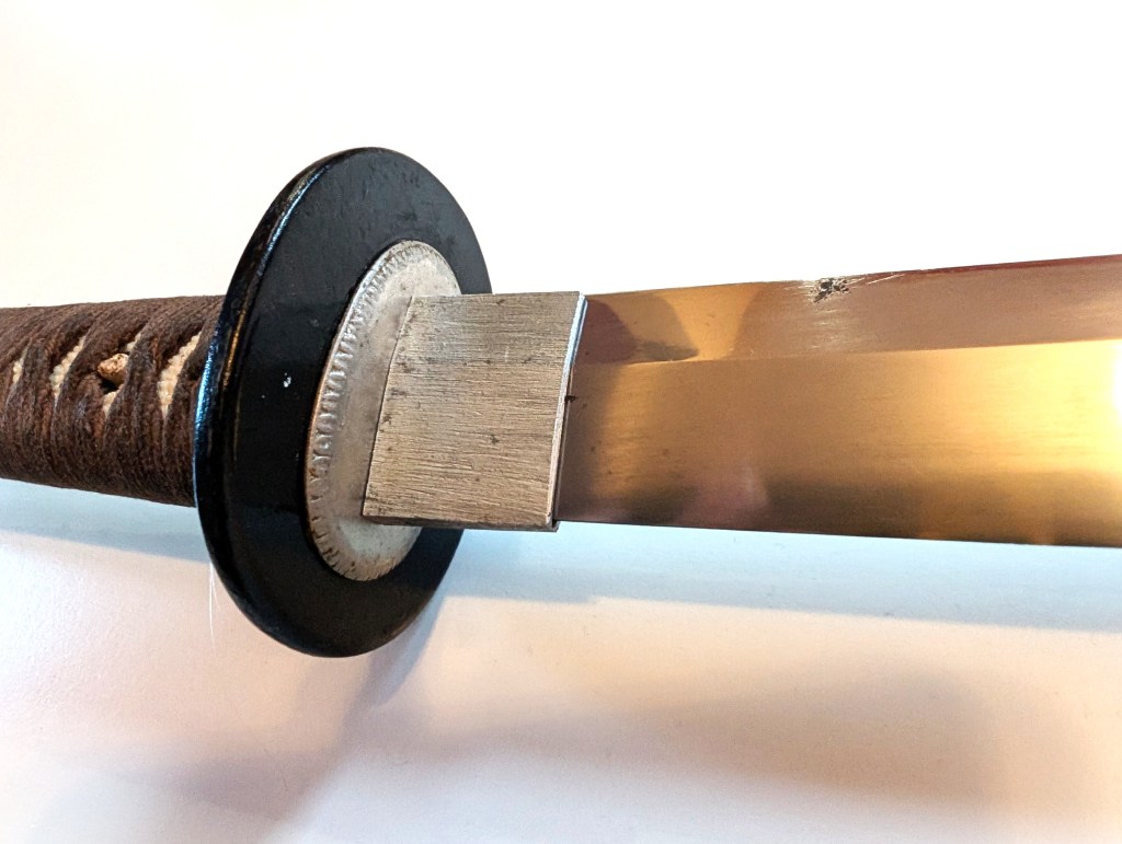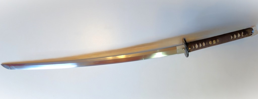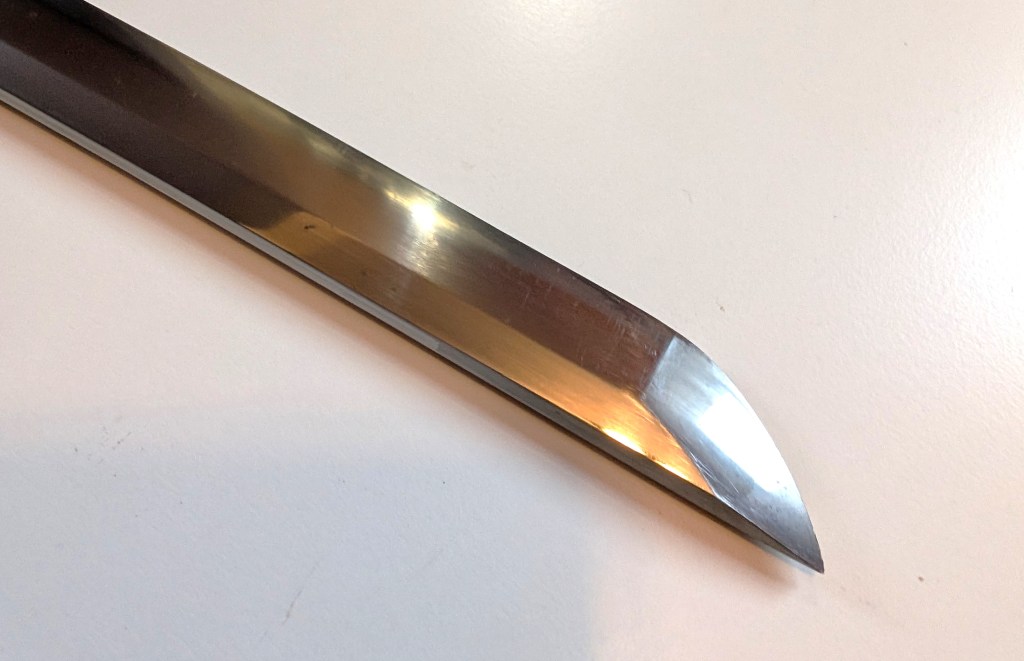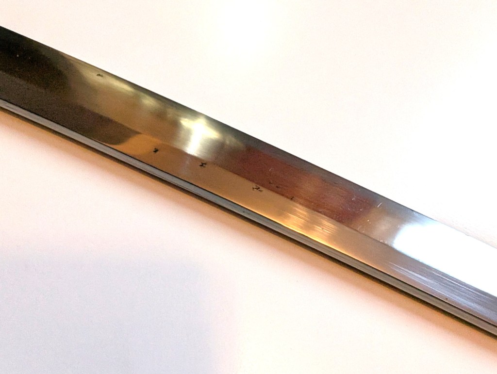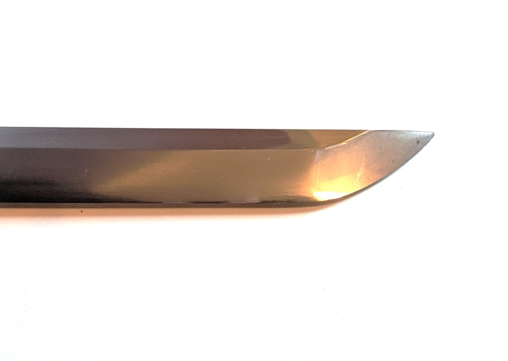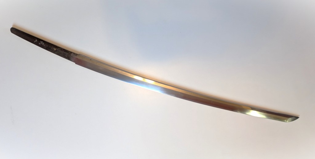 The blade is made of modern homogenous steel, and oil quenched. It retains most of its hamon, and is still very sharp.