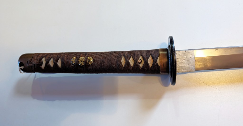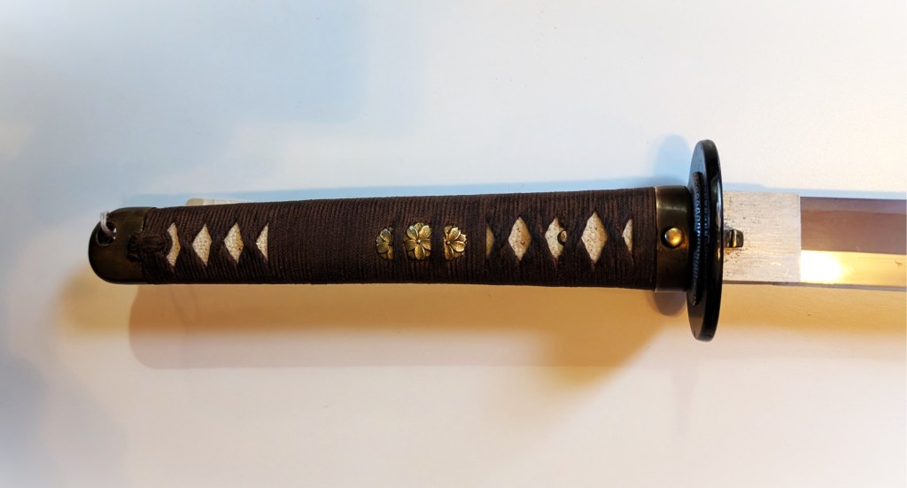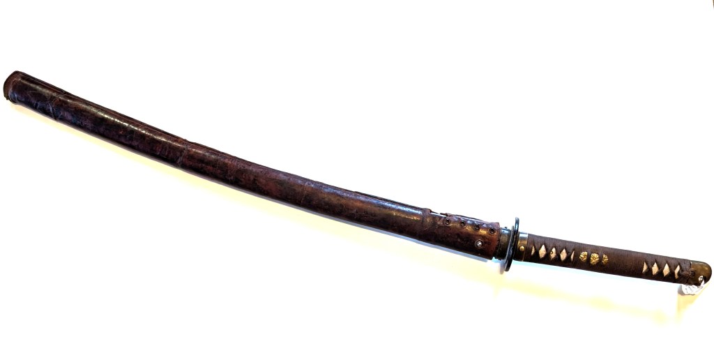 It is a type 100 (also sometime called type 3, or mistakenly type 1944) which features an hiramaki grip, a blackened iron tsuba, and brass fittings. It also comes with a leather covered field scabbard, commonly carried in battlefield situations.