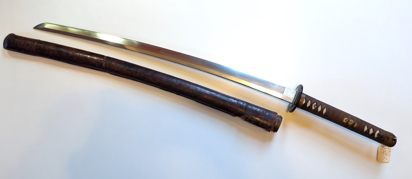 It is a type 100 (also sometime called type 3, or mistakenly type 1944) which features an hiramaki grip, a blackened iron tsuba, and brass fittings. It also comes with a leather covered field scabbard, commonly carried in battlefield situations.