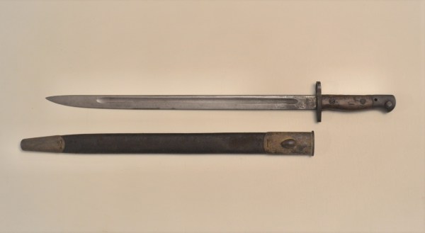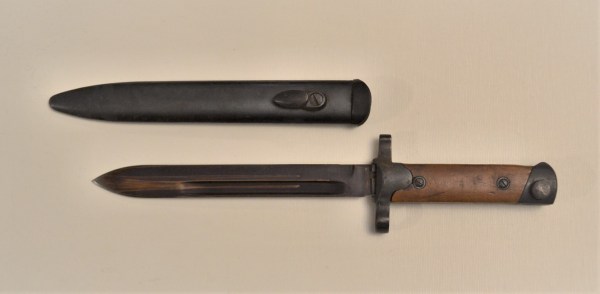 This is a WW2 era Mangrovite bayonet of the 1907 pattern made in Australia in 1942. Mangrovite Arsenal bayonets are relatively scarce, and this example come with its original scabbard. The bayonet is very solid, with a few dents in the wooden grip. SOLD