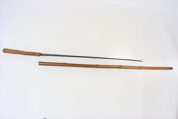 For sale, this cane sword made with a sharpened foil blade made in Solingen. This cane probably dates from the mid 19th century. The shaft is of bamboo, which is split in some places. The blade does not go completely in the scabbard, but this could be fixed with a bit of work, hence the low... Continue Reading →